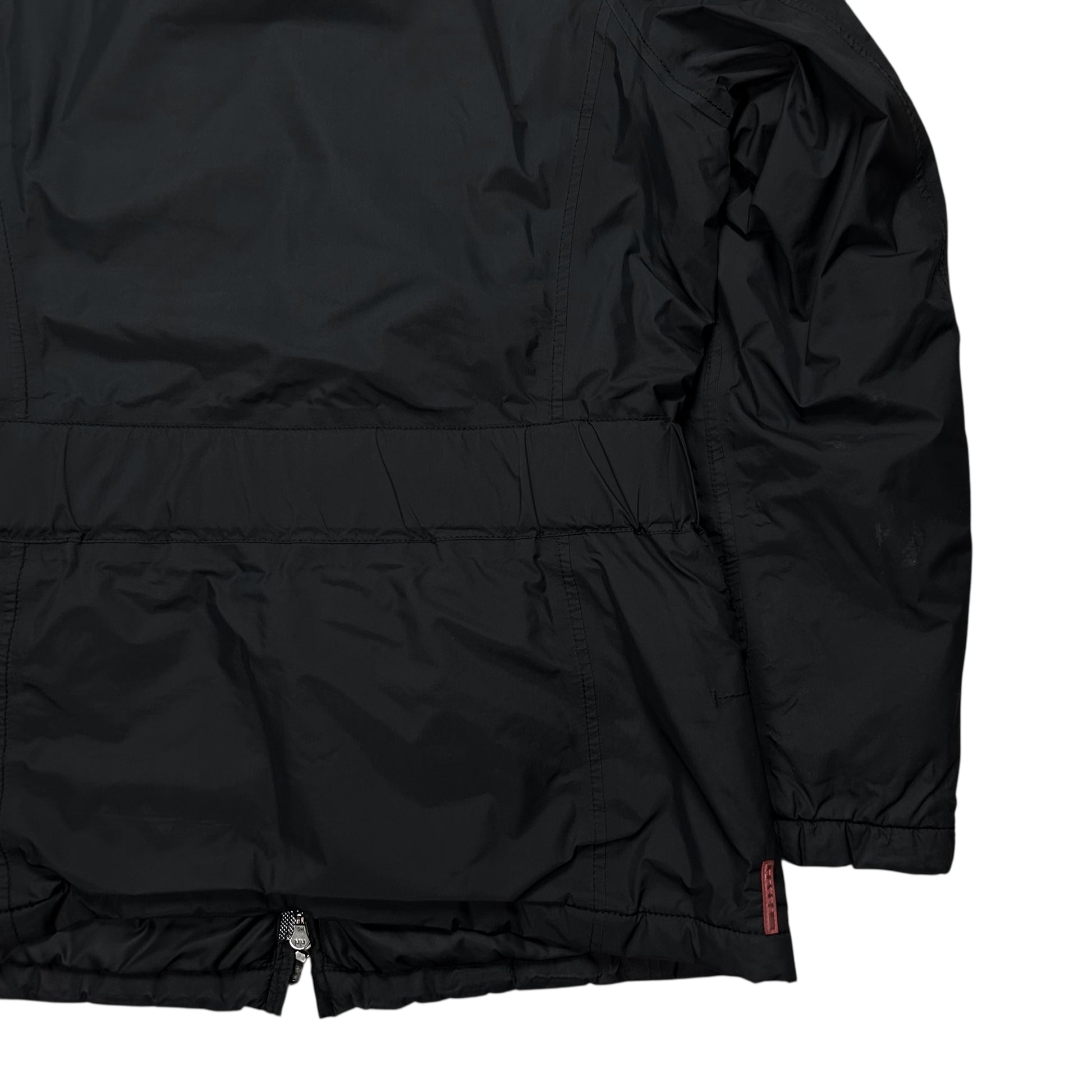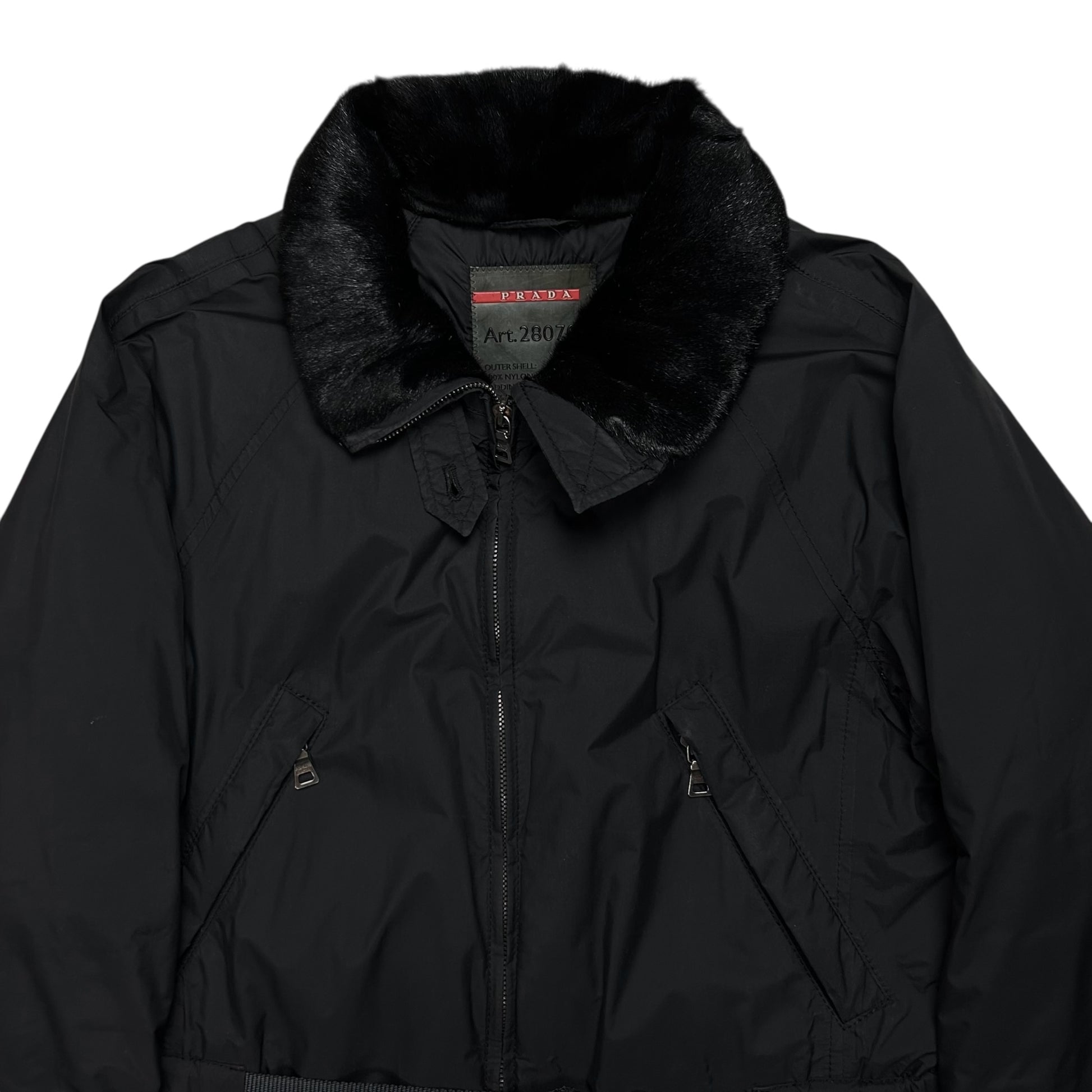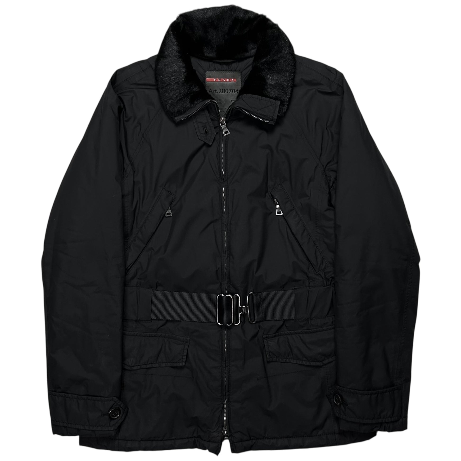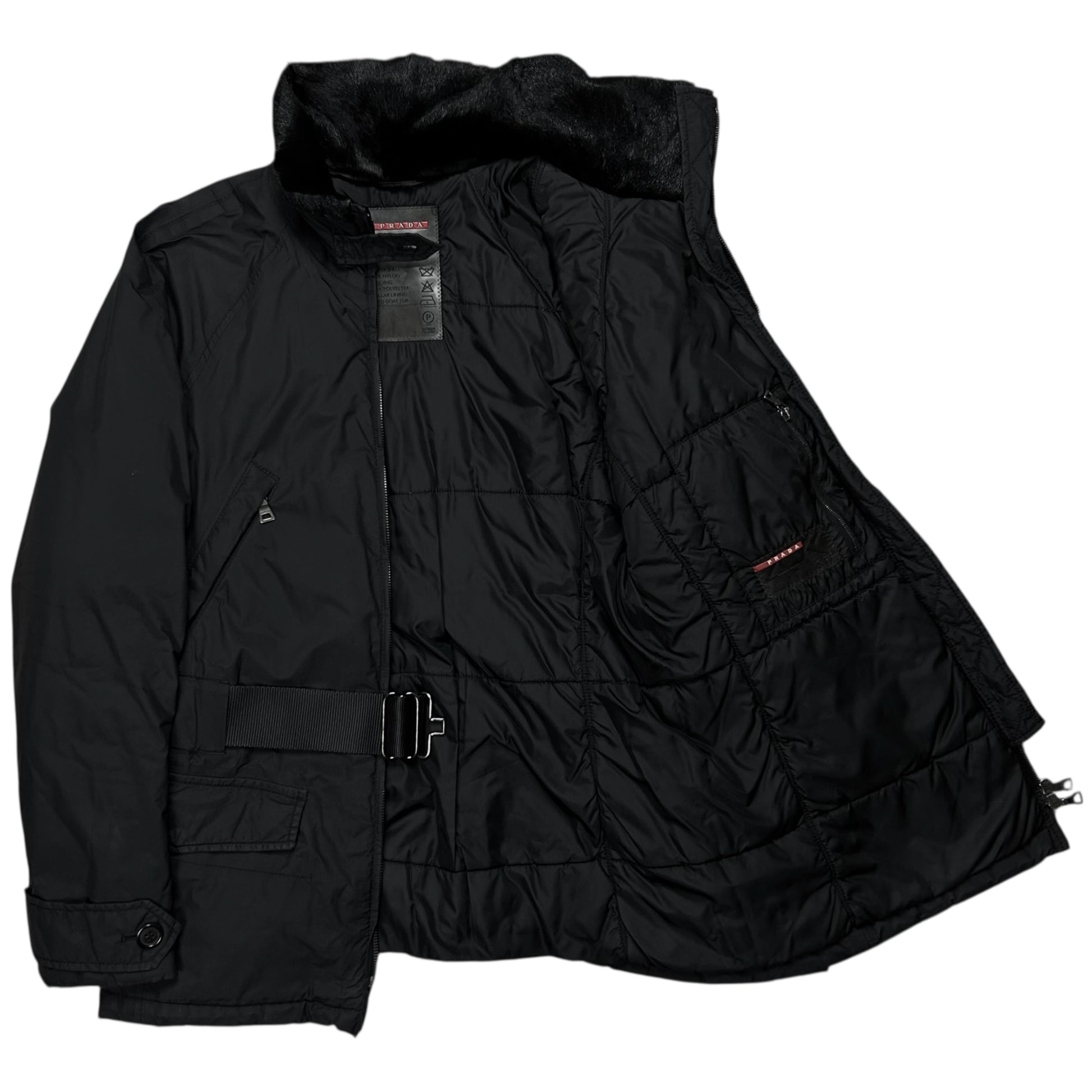 Mid length jacket from Prada. Implemented tonal belt with an interesting silver buckle hardware closing. Oxidized Riri zip closure at the front with further zippers at the diagonal chest pockets. Foldable collar with dyed goat fur. Straps at the sleevss and red tab logo at the side hem. Made from a padded techncial polyester fabric in black. Regular cut.