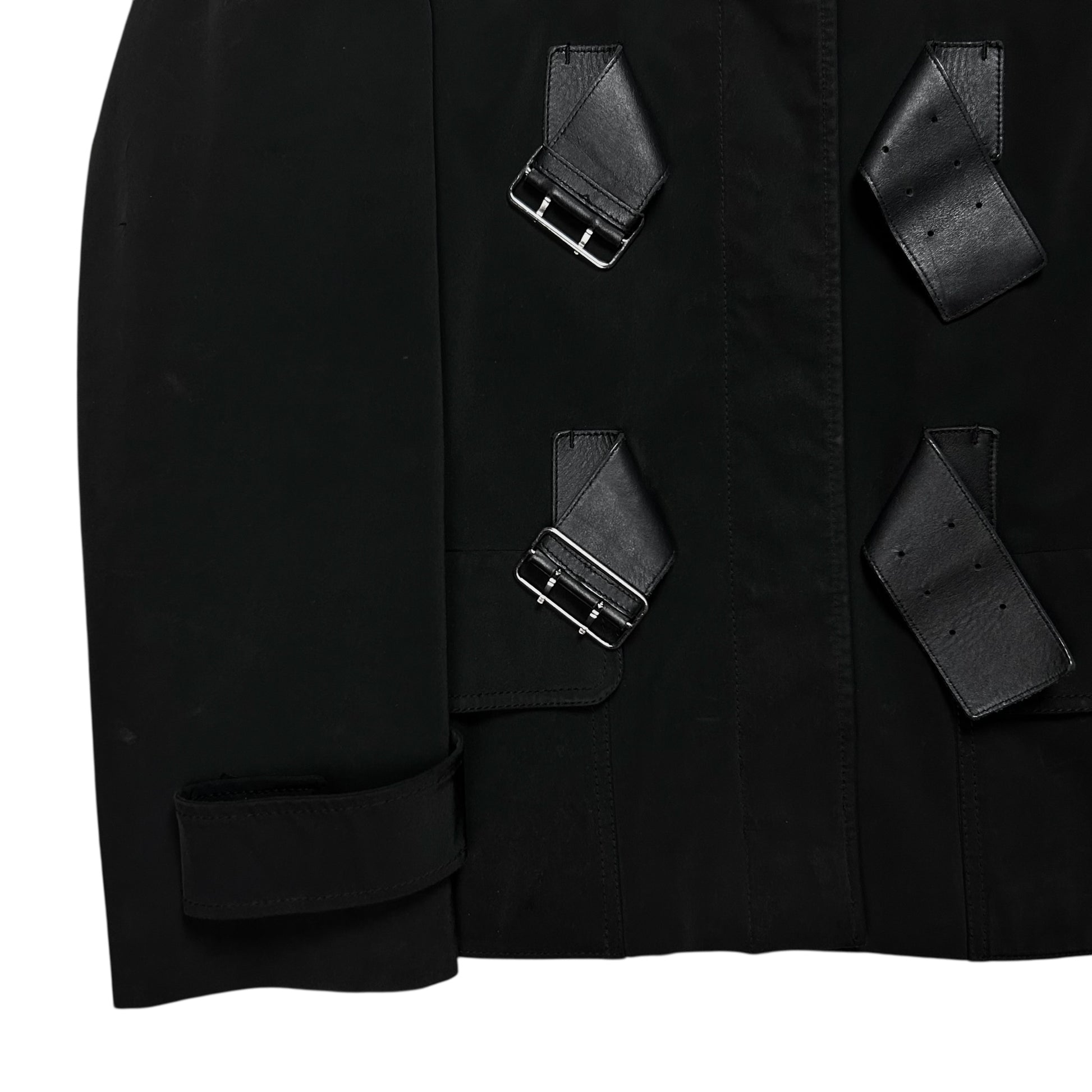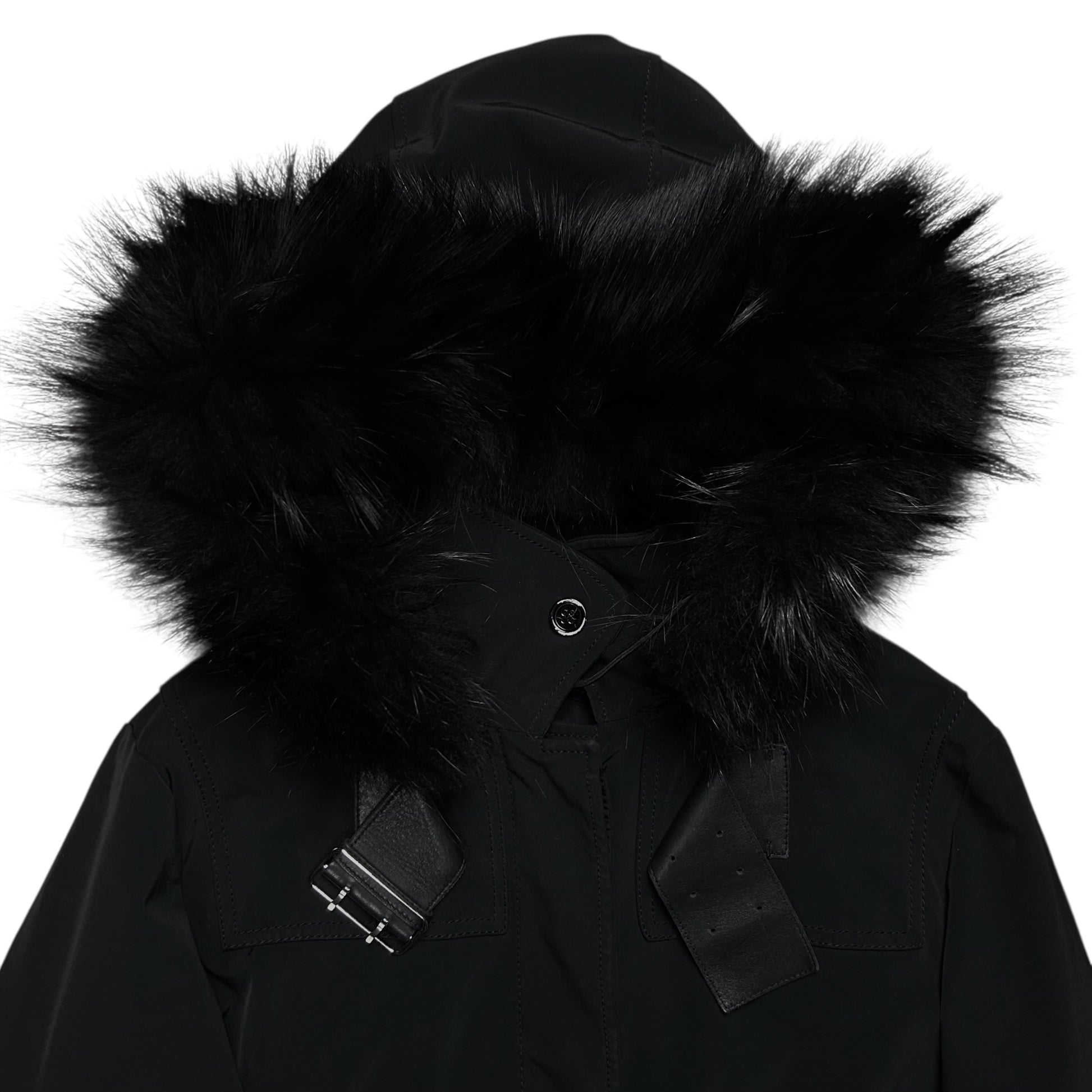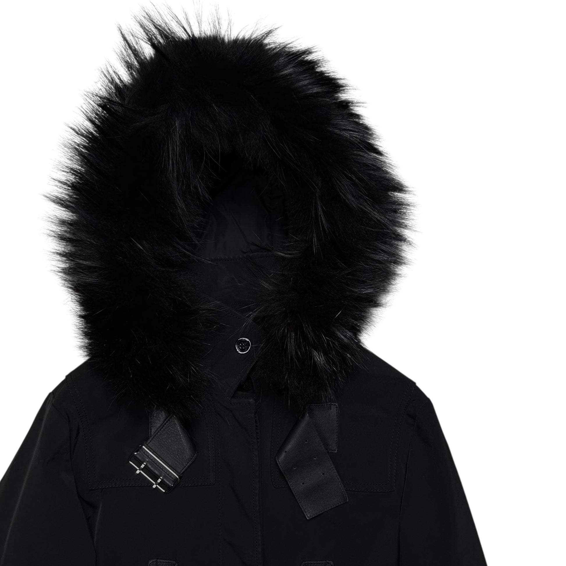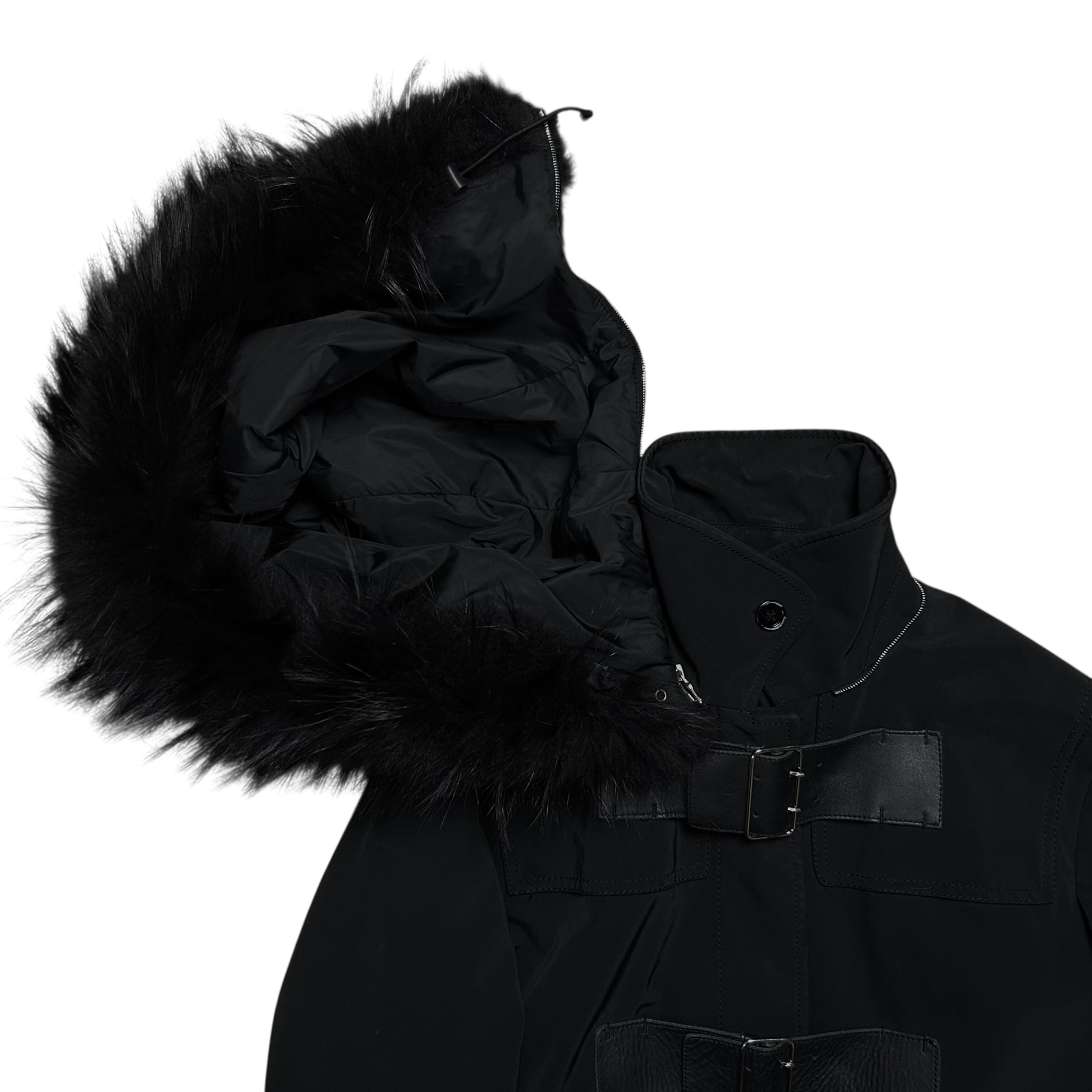 Heavy jacket from Prada. Triple tonal leather belt on top of the concealed button closure with exaggerated silver buckle closure for adjustment purposes. Siver Riri zip around the faux fur decorated hood which allows to completely detach it. Extra straps at the sleeves. Made from a polyester blend in black. Boxy cut.