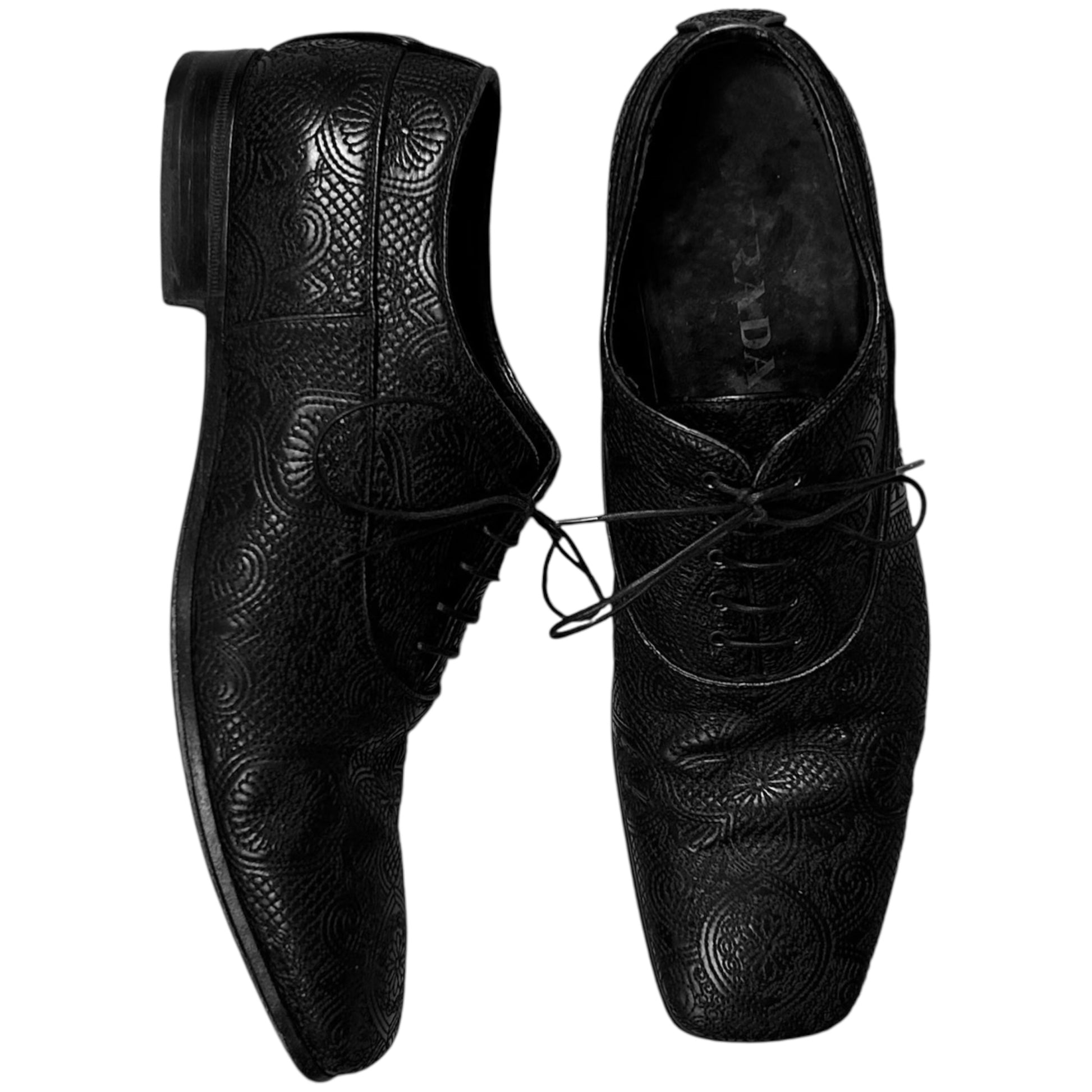 Dress derby shoes from Prada. Classic lace construction with tonal eyelets. Unique 3D texture throughout with abstract floral patterns. Squared toe box with a heeled leather sole. Made from a mat black genuine leather.