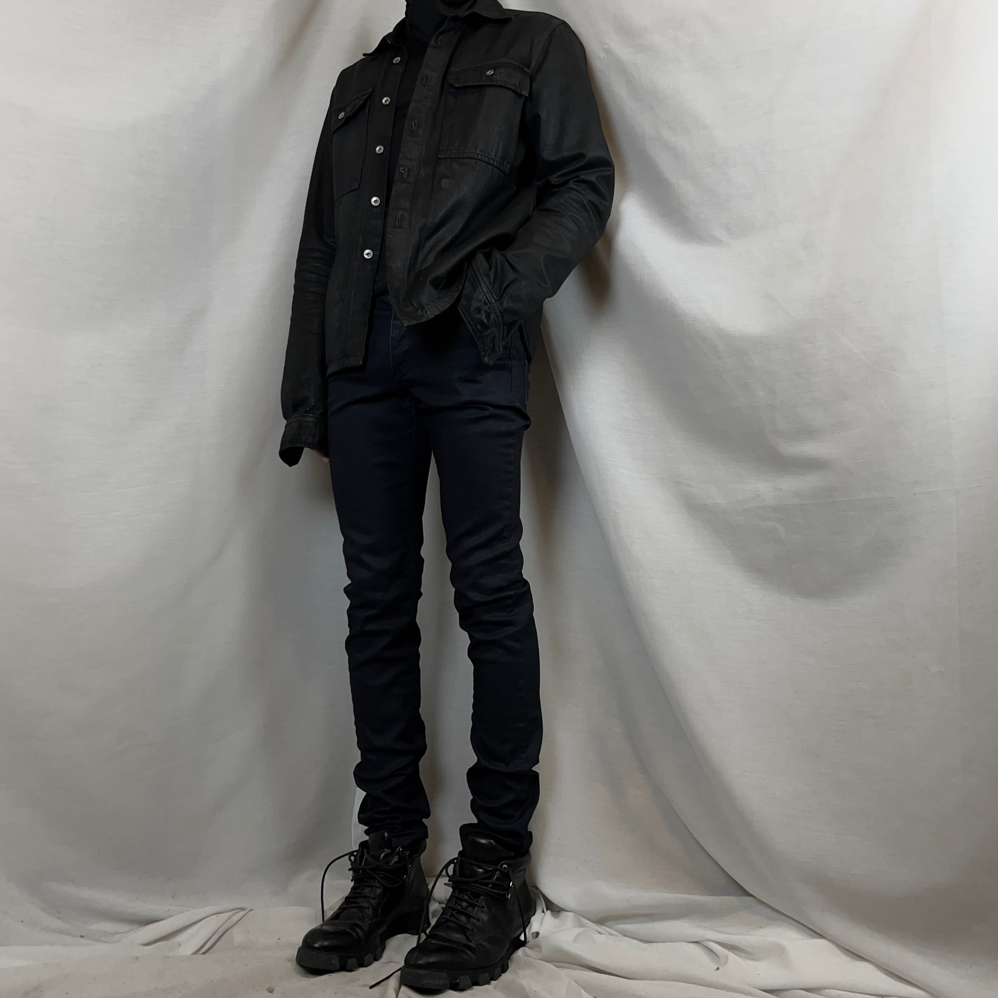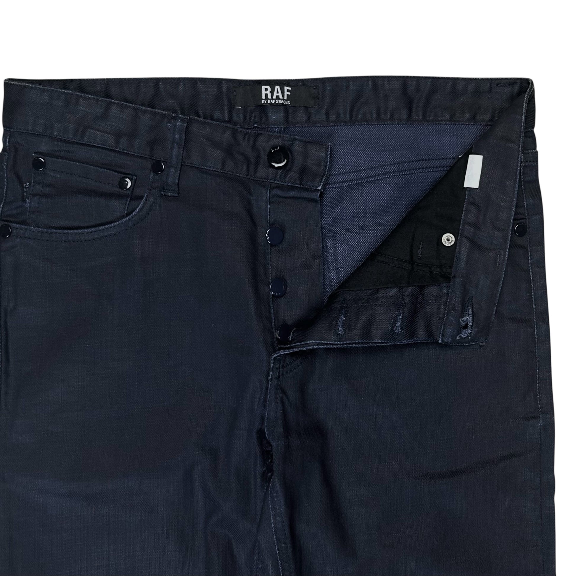 Denim pants from the discontinued Raf Simons diffusion line from the 2010s called Raf by Raf Simons. Classic construction with silver studs at the waist, concealed zip fly and regular pockets. Small leather logo patch in white at the back. Made from a dark blue stretch cotton with a wet wax coating. Skinny cut.