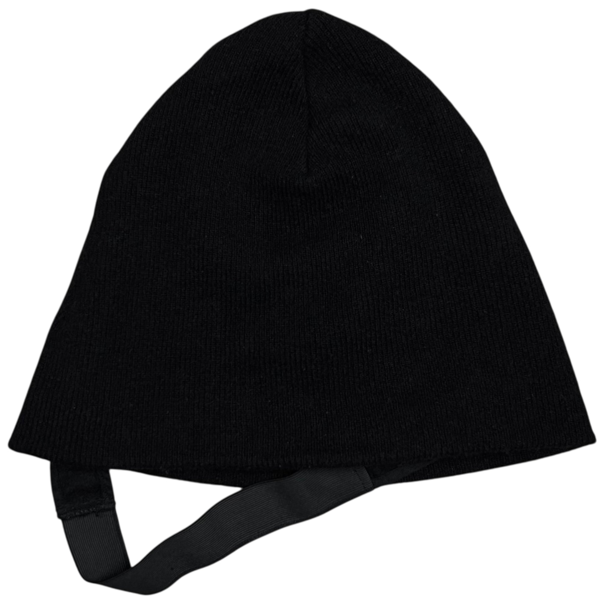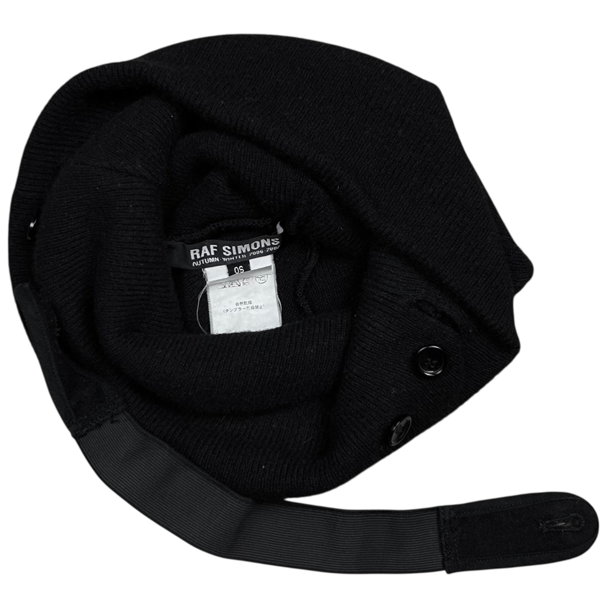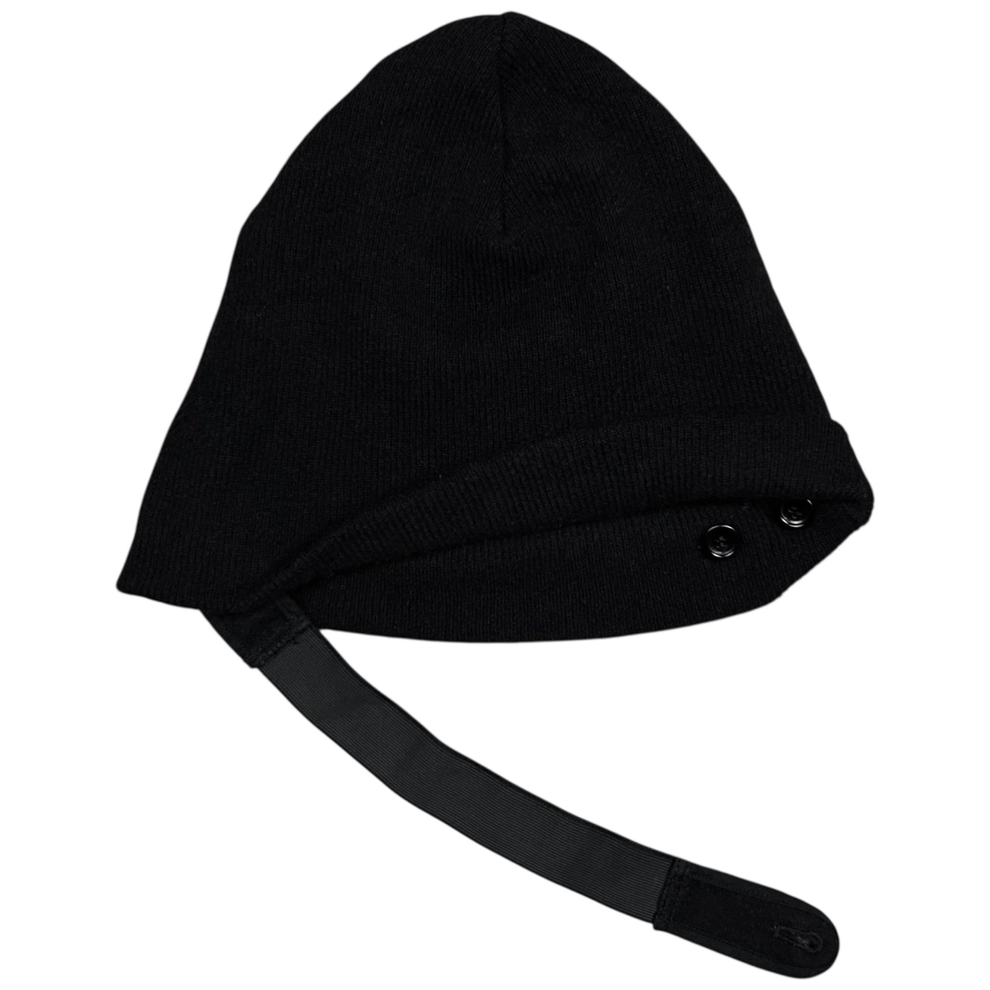 Headwear from the Fall Winter 2006 collection of Raf Simons. Elastic strap attached to the multiple buttons that can be used to adjust the head width and can be used to stzle it in different ways including putting inside the beanie through the holes. Made from a black wool material.