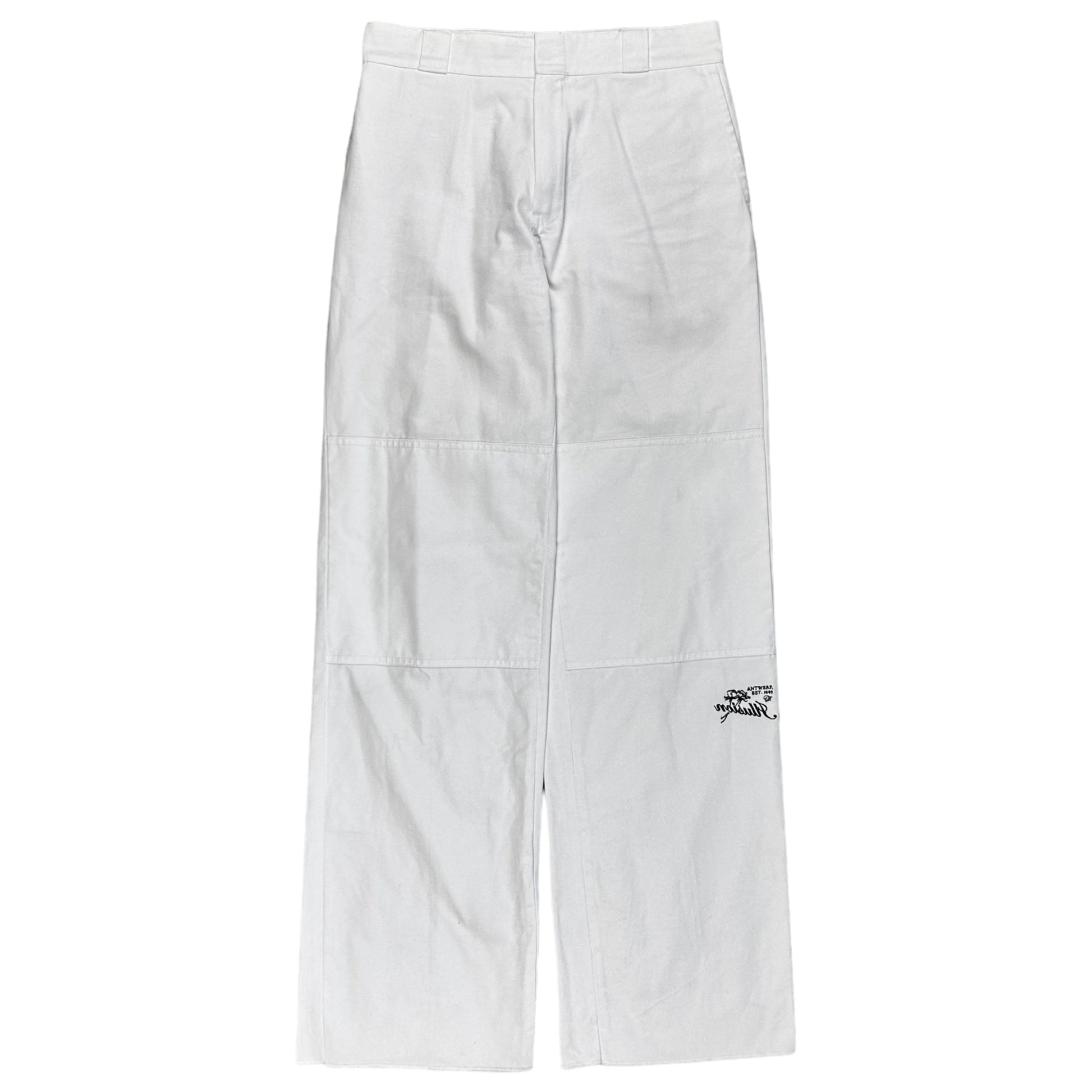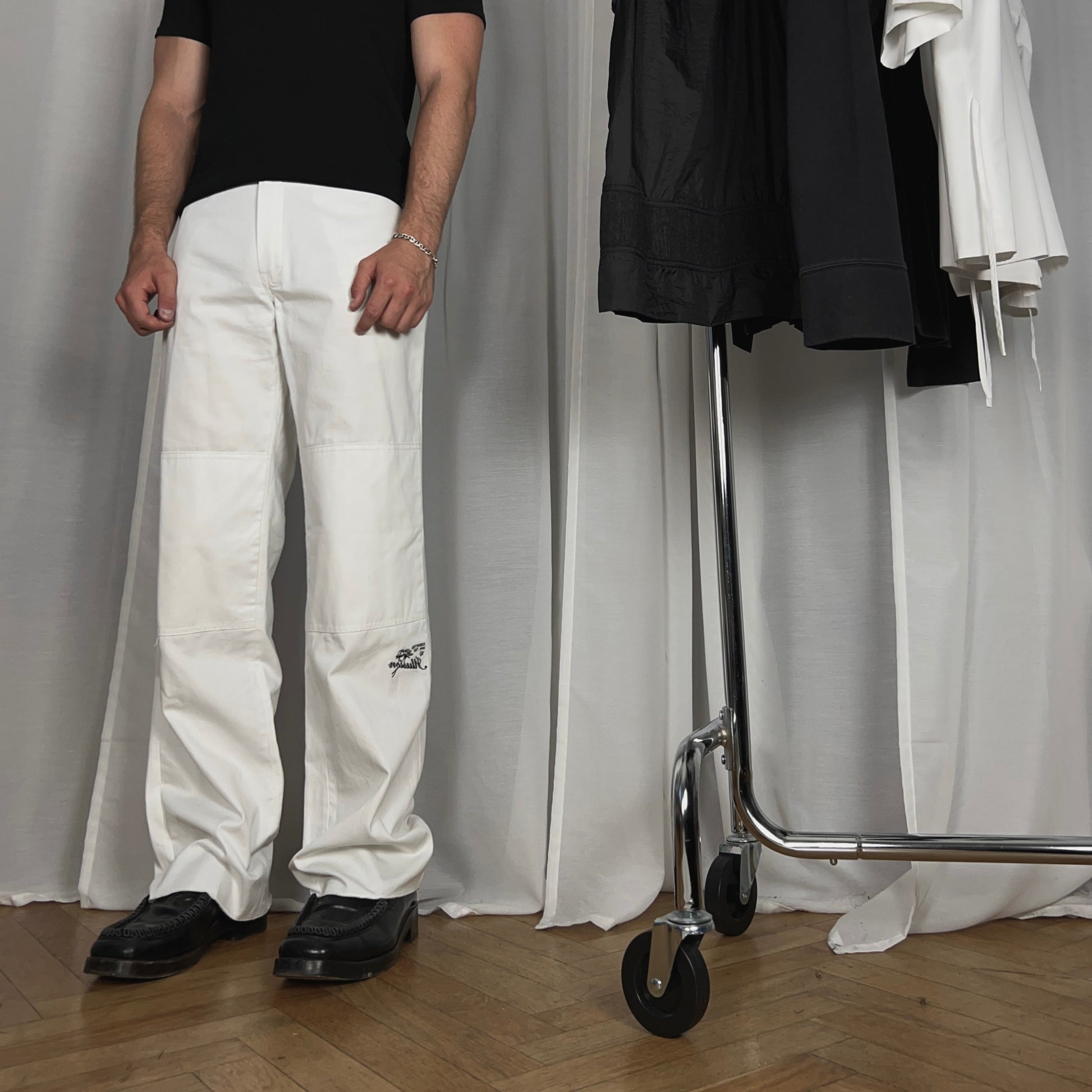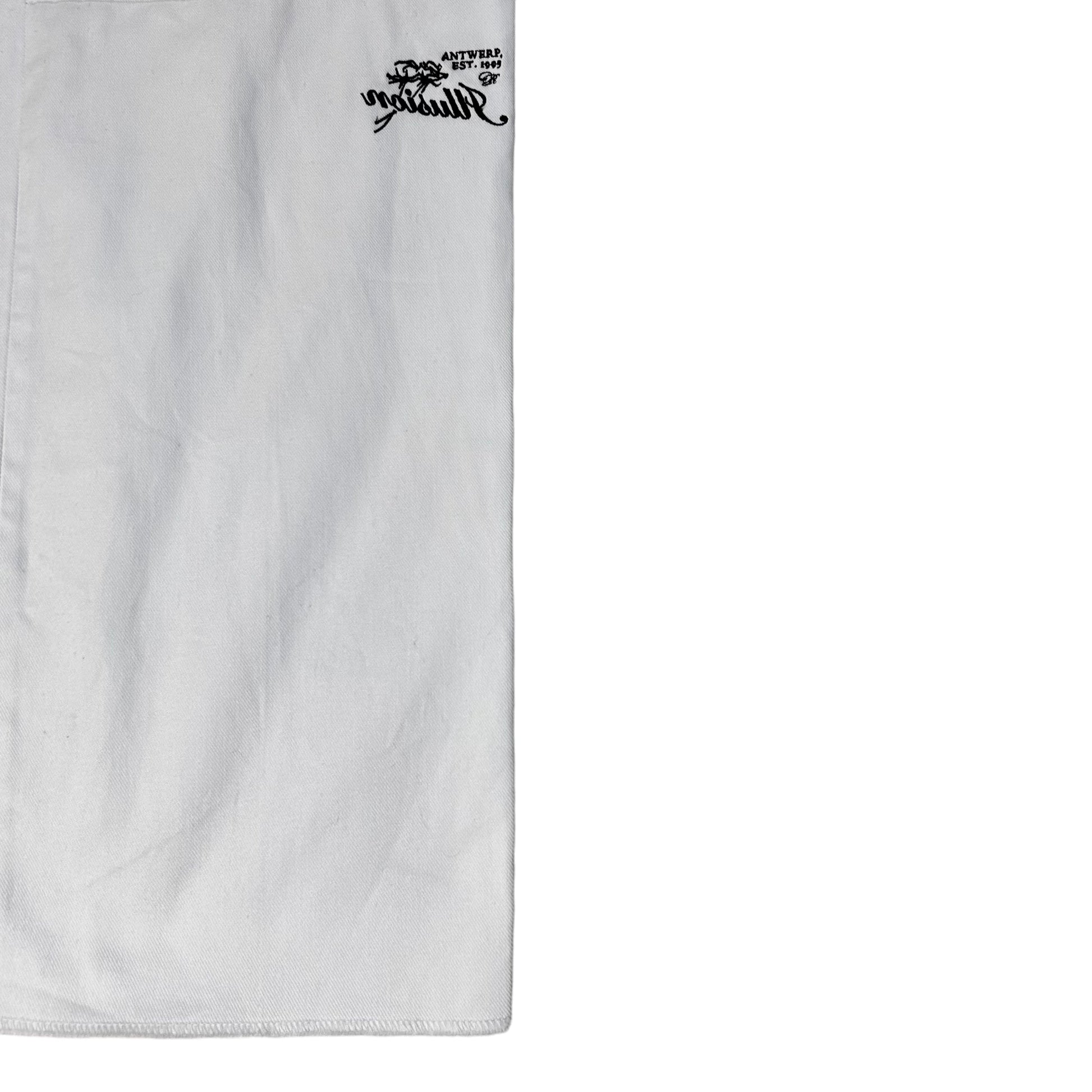 Workwear inspired pants from the Raf Simons Fall Winter 2019 collection. Tonal double knee patch at the front. Embroidery Antwerp logo at the lower front of the right leg. Raw hem with subtle distressing. Featured on the runway and released in different versions with this one being the pure white iteration. Straight cut with an extended inseam for a stacking effect. Retailed for around 600€.