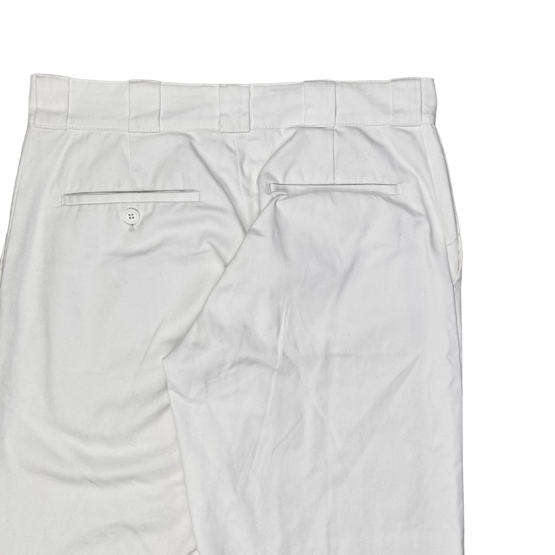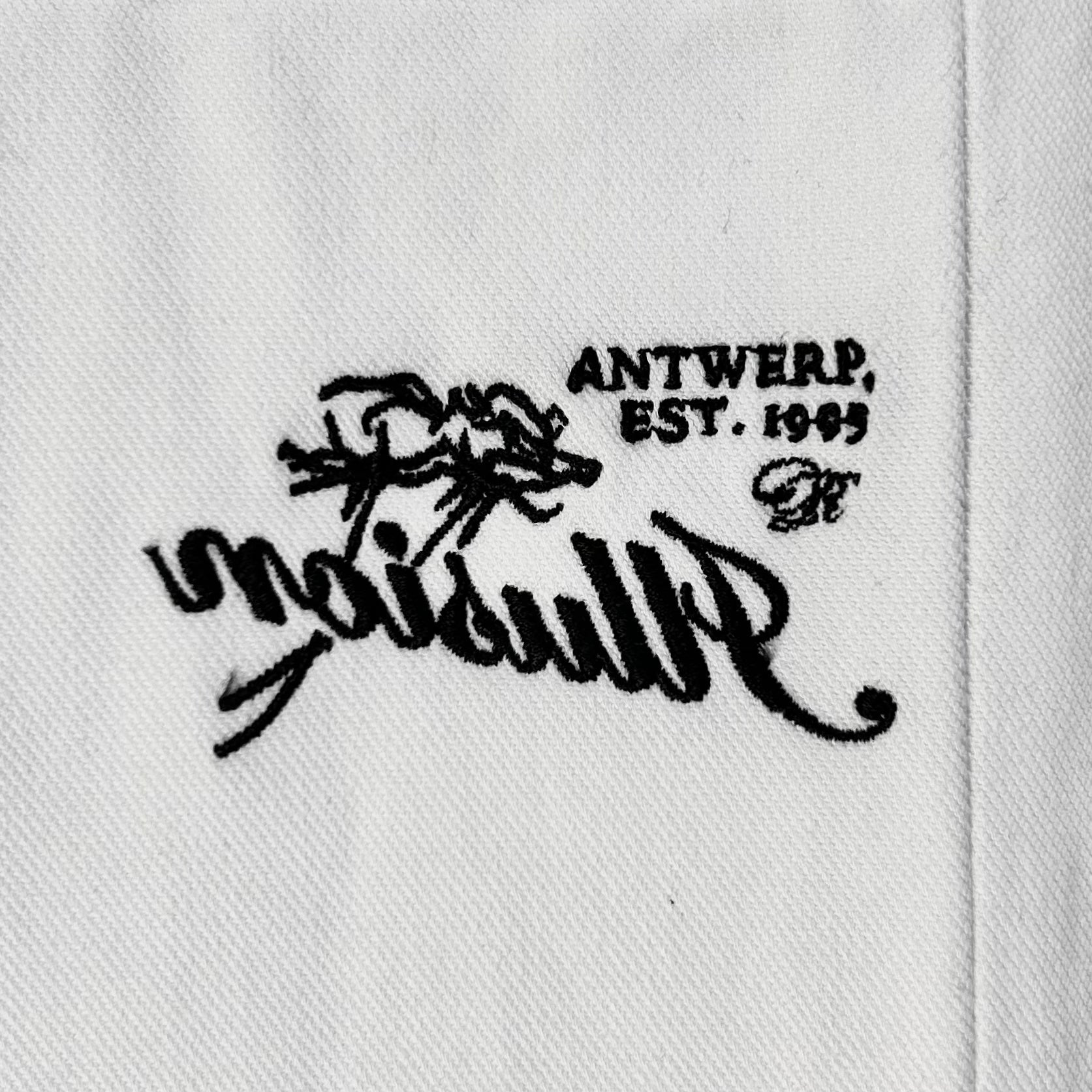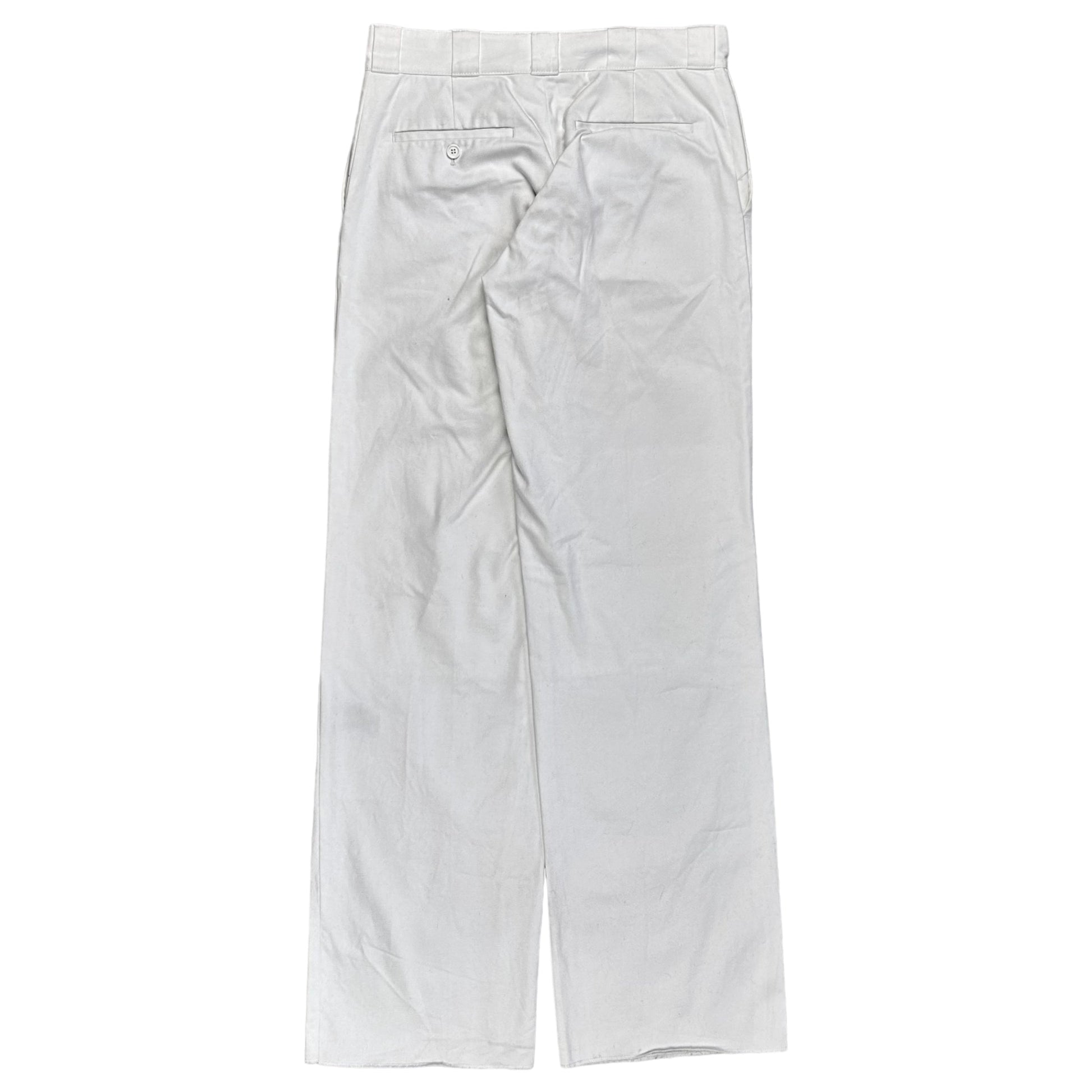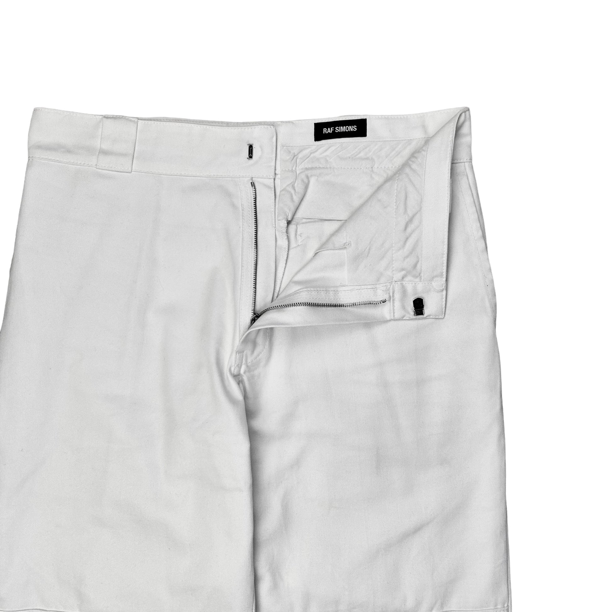 Workwear inspired pants from the Raf Simons Fall Winter 2019 collection. Tonal double knee patch at the front. Embroidery Antwerp logo at the lower front of the right leg. Raw hem with subtle distressing. Featured on the runway and released in different versions with this one being the pure white iteration. Straight cut with an extended inseam for a stacking effect. Retailed for around 600€.