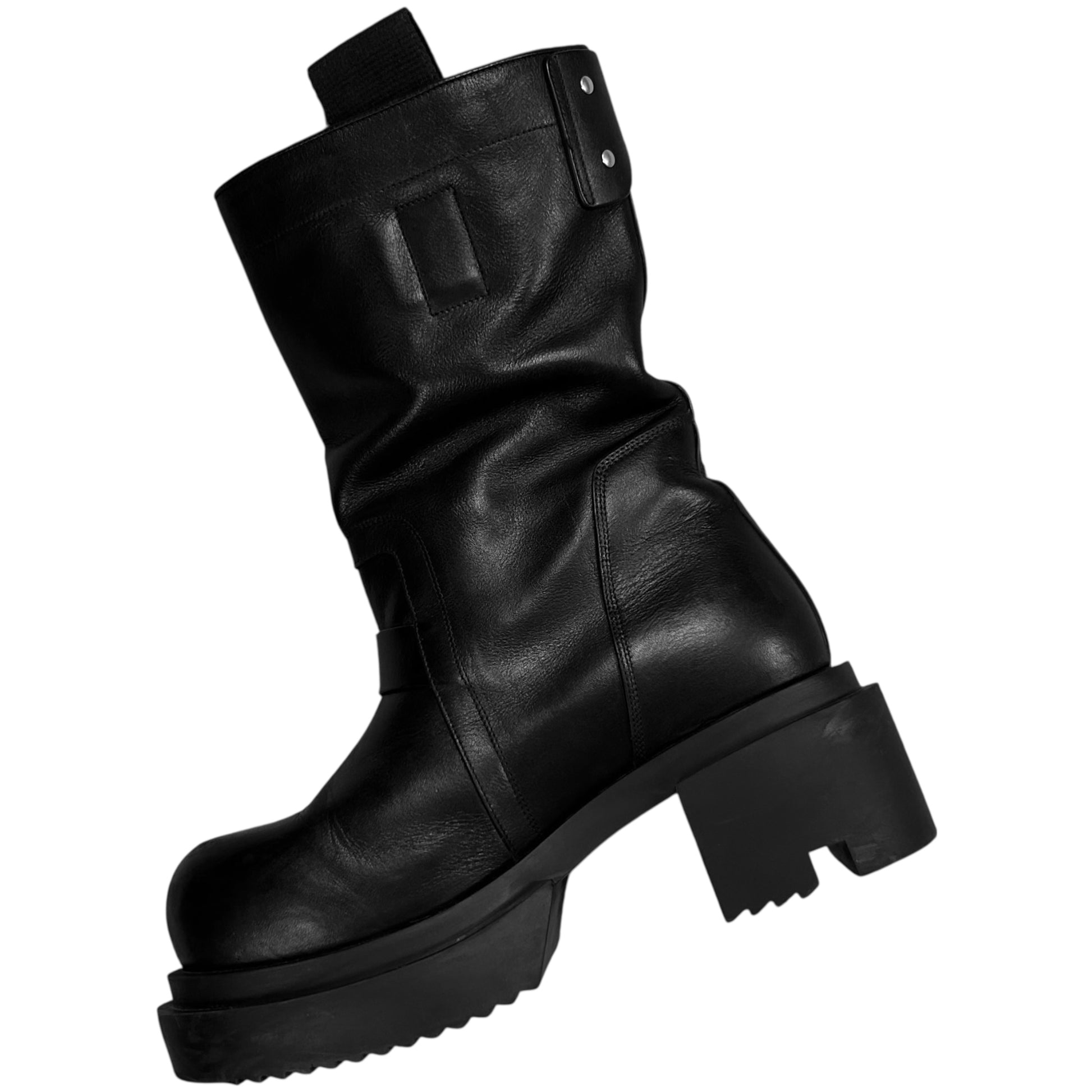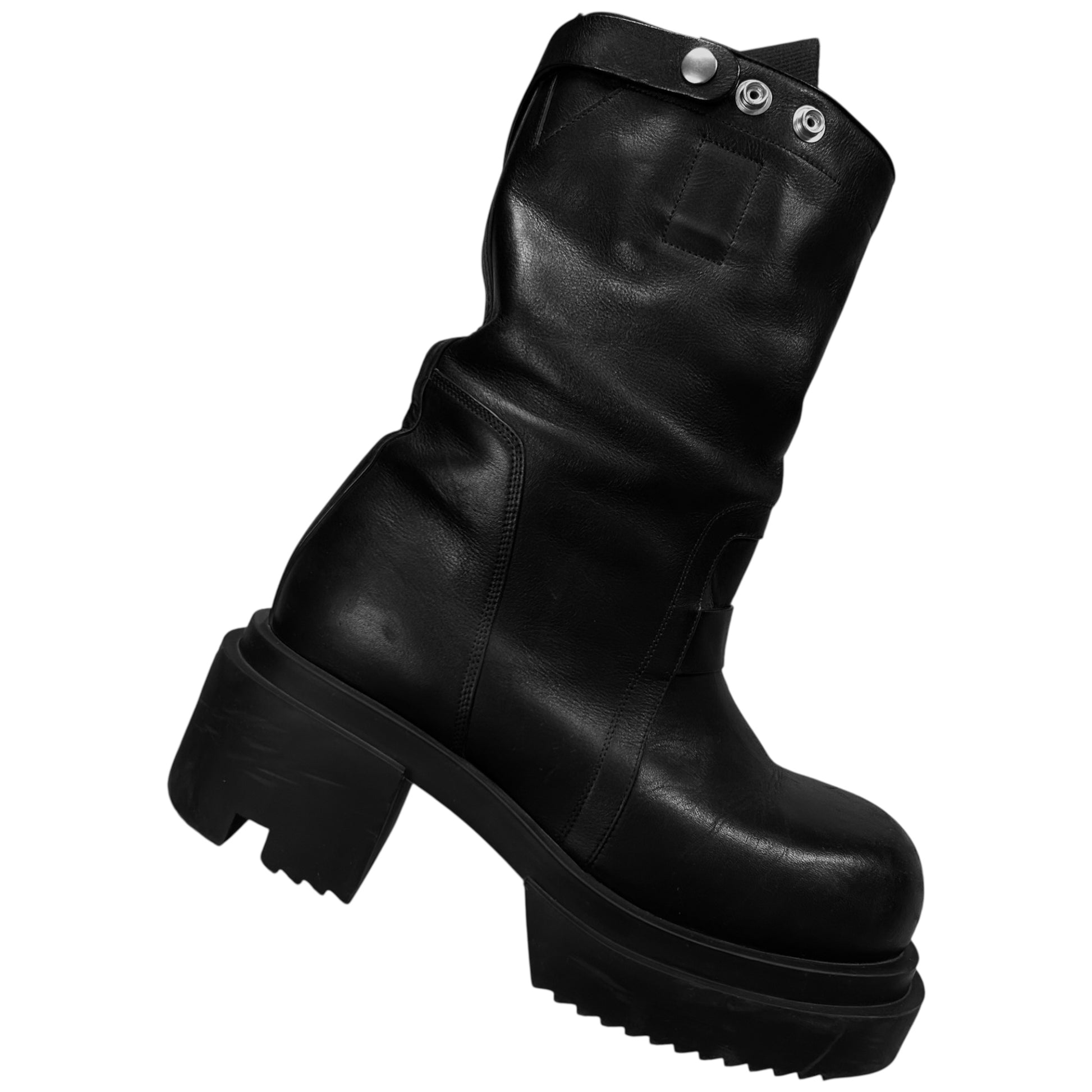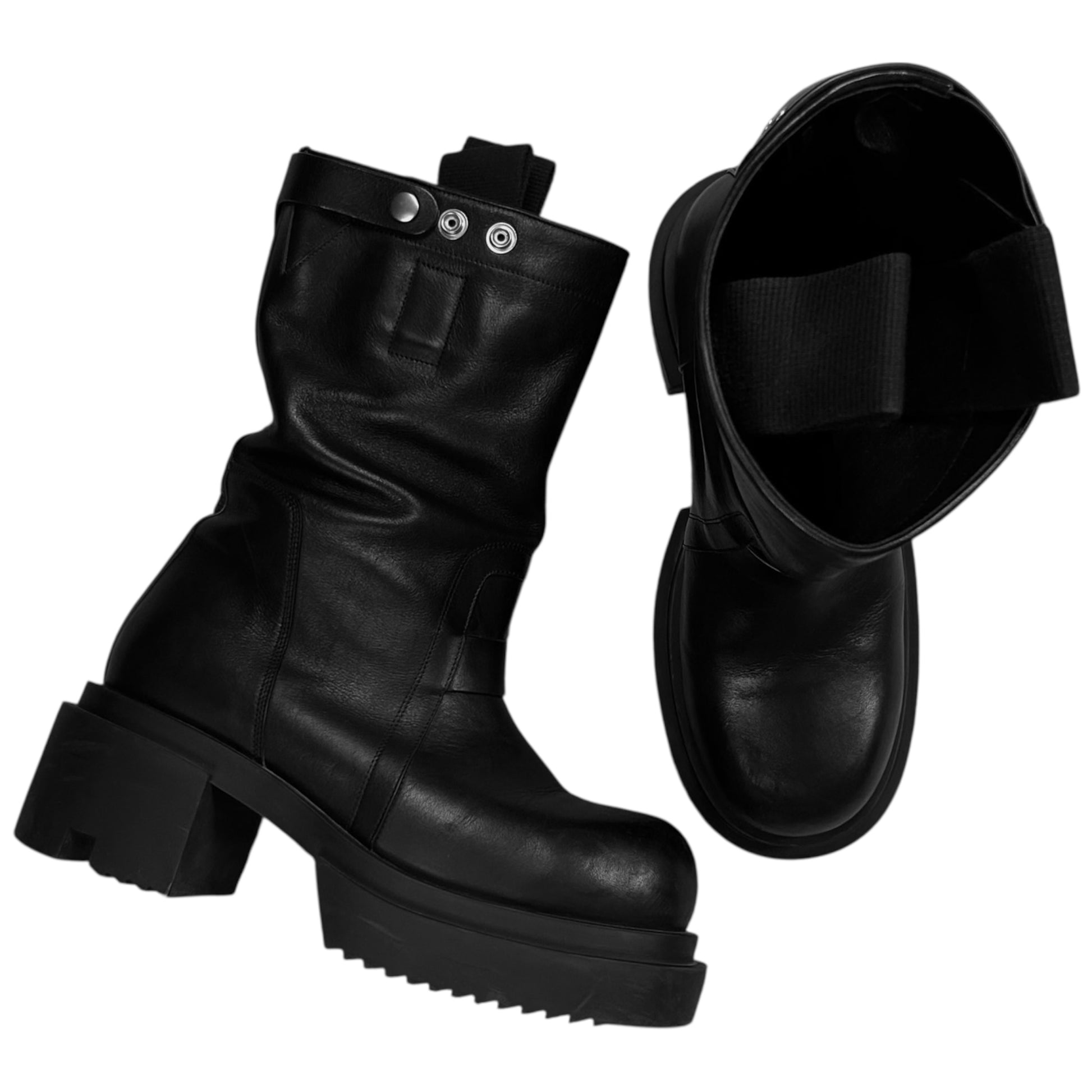 High top combat boots from the Rick Owens Fall Winter 2024 called Porterville. pull on feature with woven pull tabs and a press studs and strap hardware for slight adjustment purposes. Chunky round toe with a Bogun rubber mega creeper rubber sole. Made from a mid weight calf leather and finished with natural waxes. Retailed for 1800€.