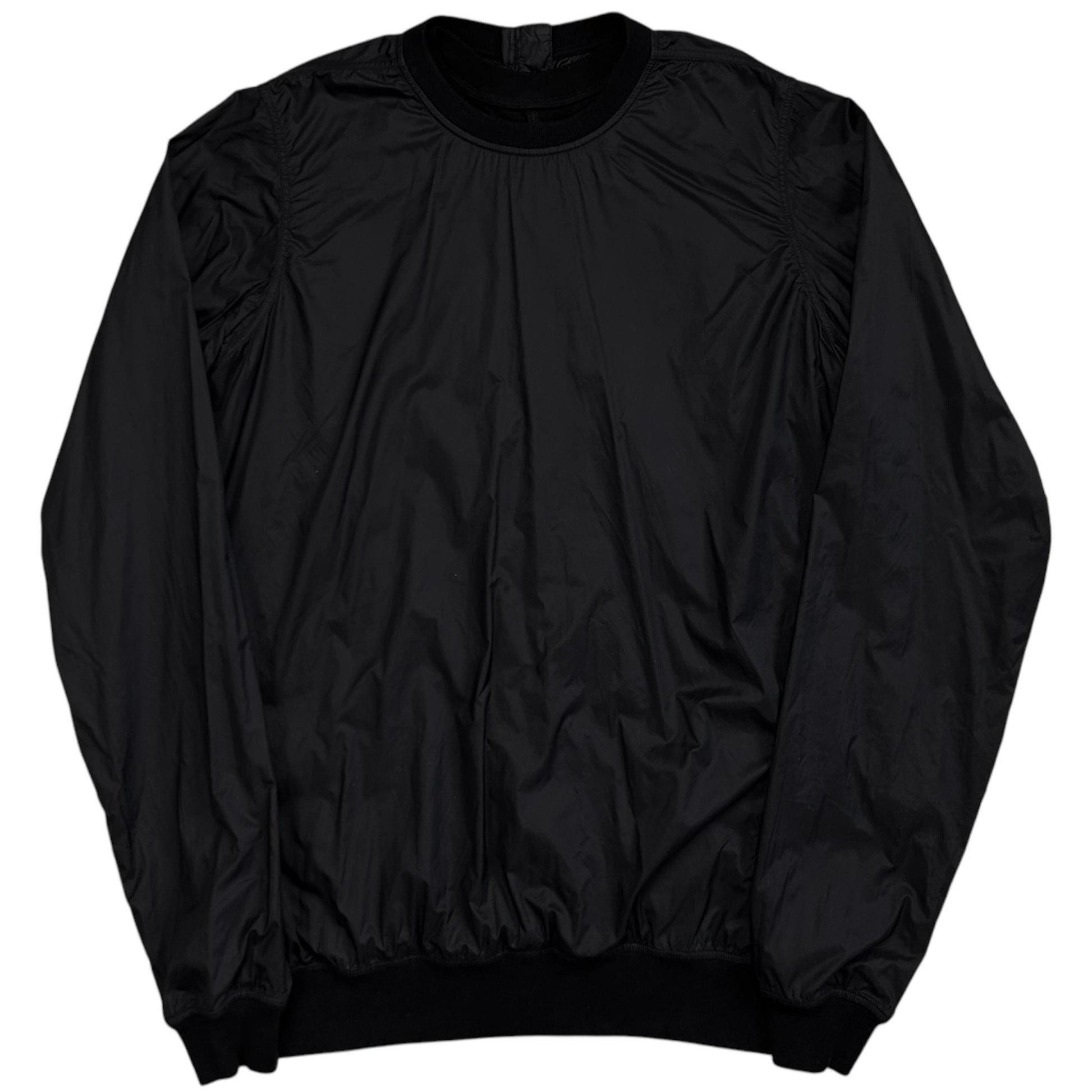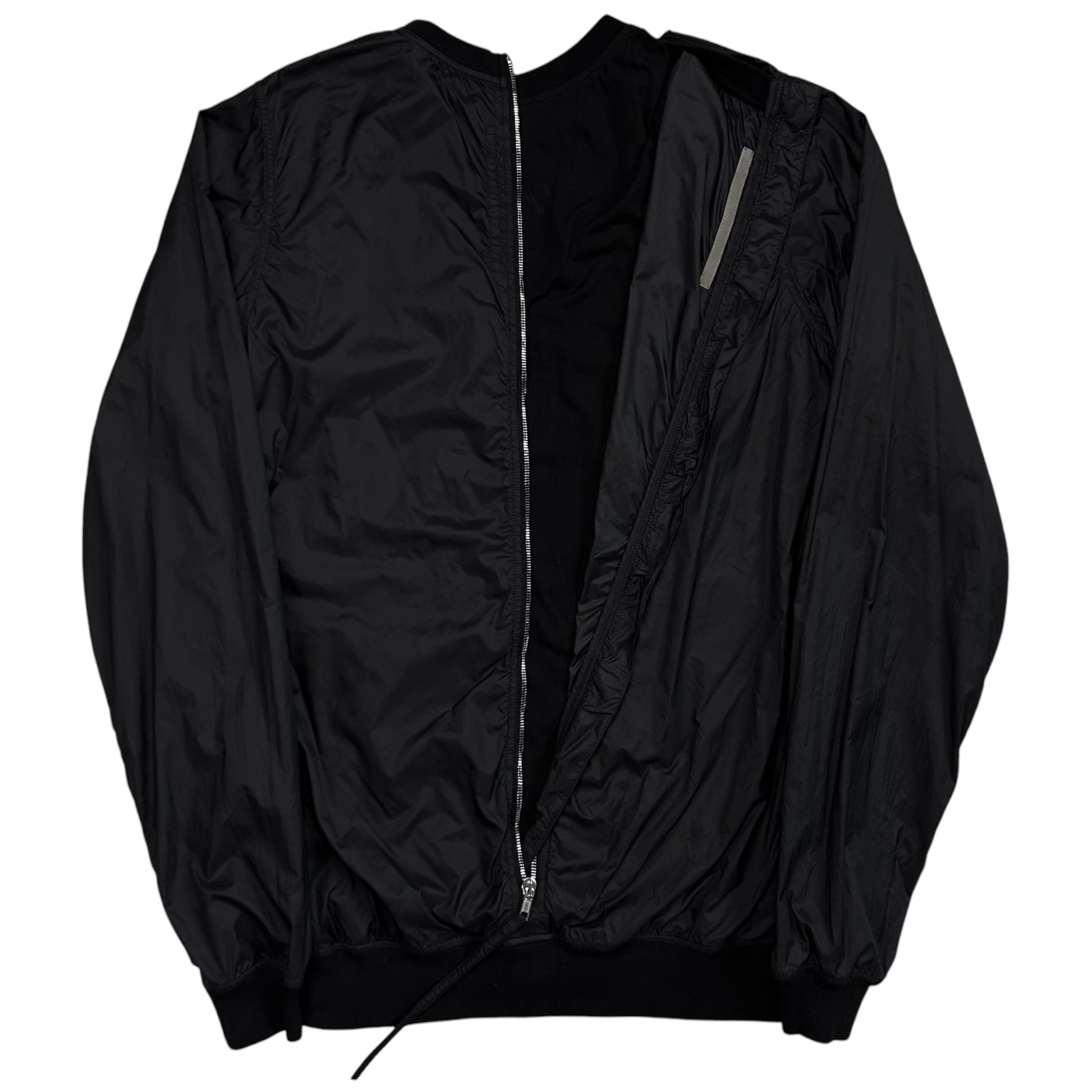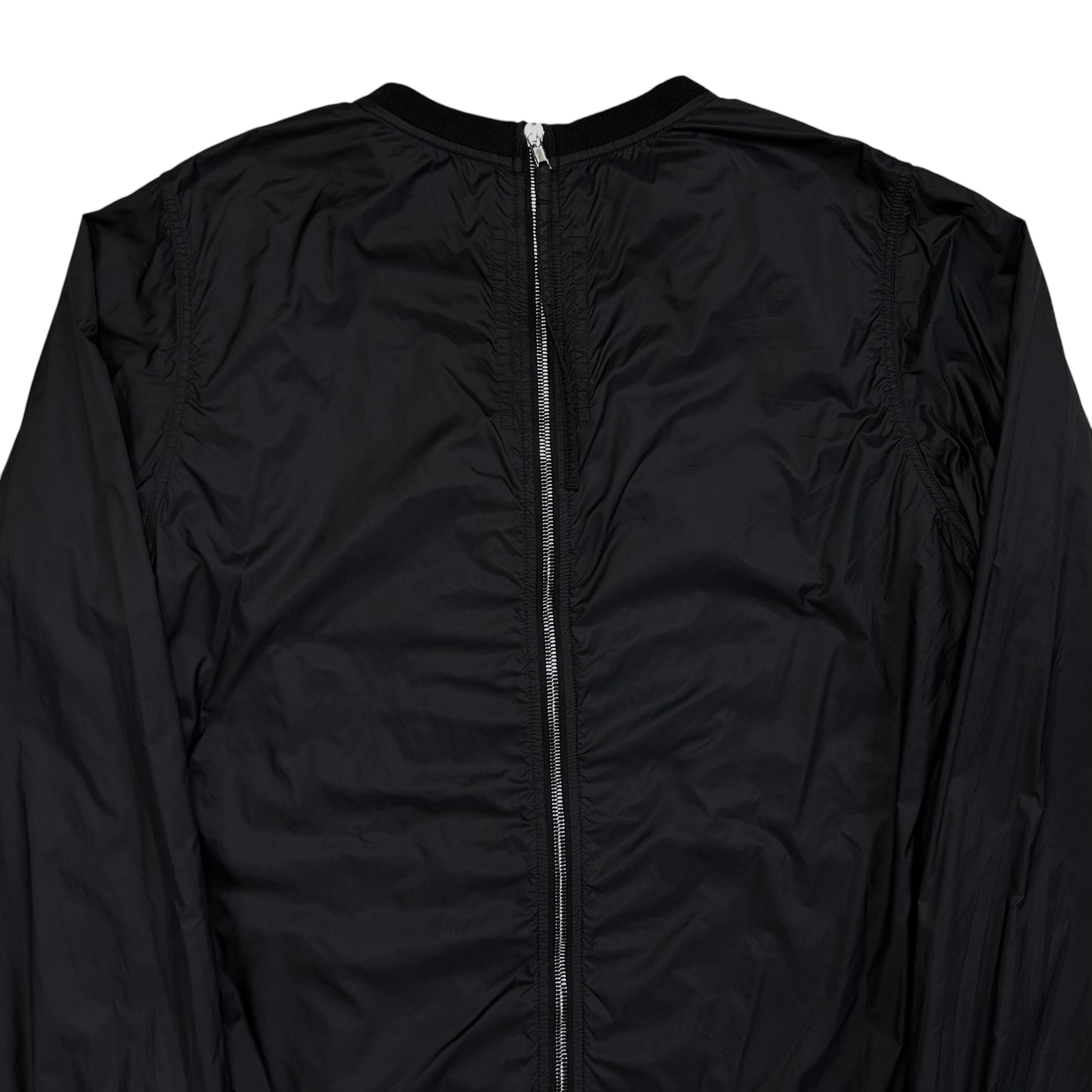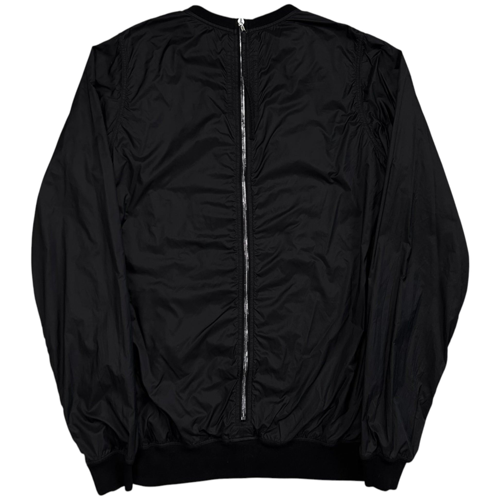 Crewneck sweater from the Fall Winter 2020 collection of the Rick Owens diffusion line Darkshadow. Double layered construction with a nylon longseeve outer layer made from a nylon with a second short sleeve cotton inner layer. Silver zip at the back with a black tassel attached to the puller allowing many styling options. Slightly oversized cut. Retailed for around 550€.