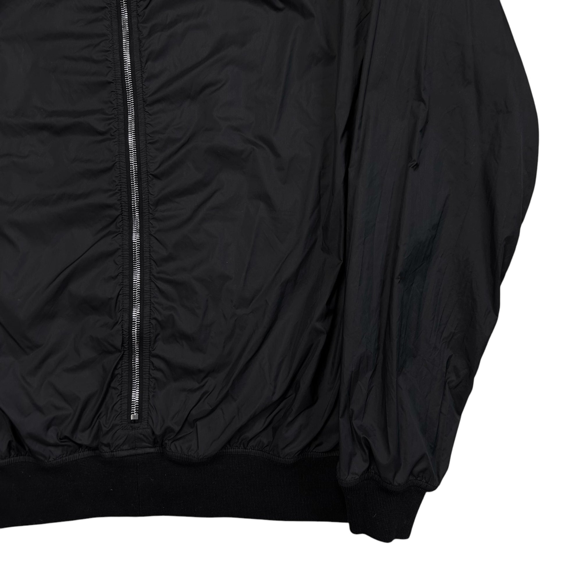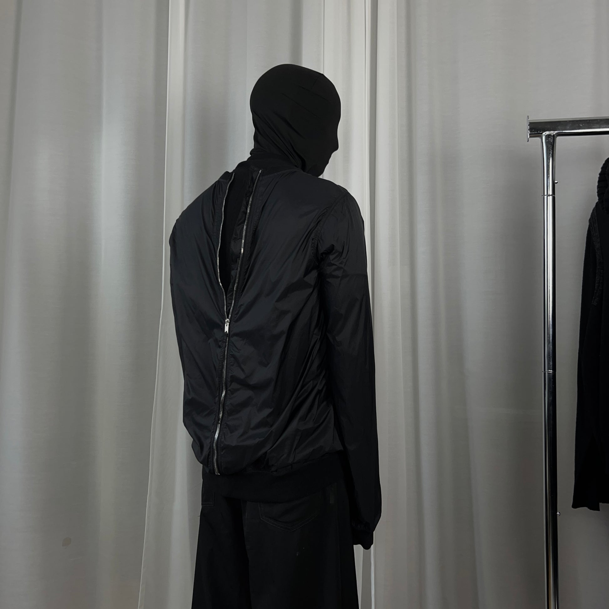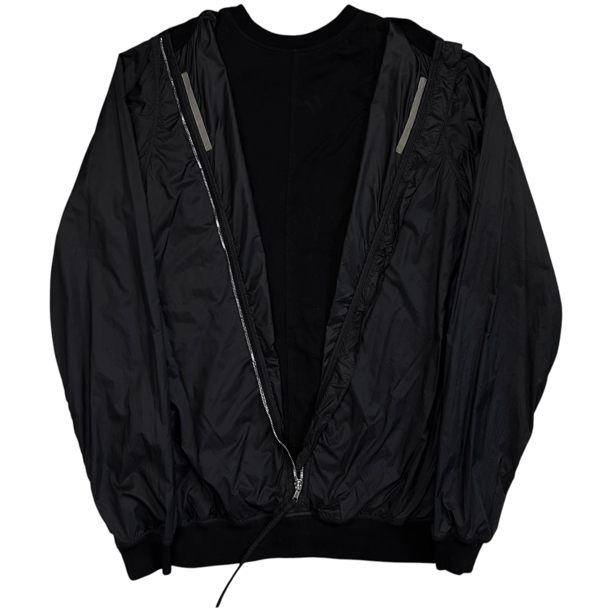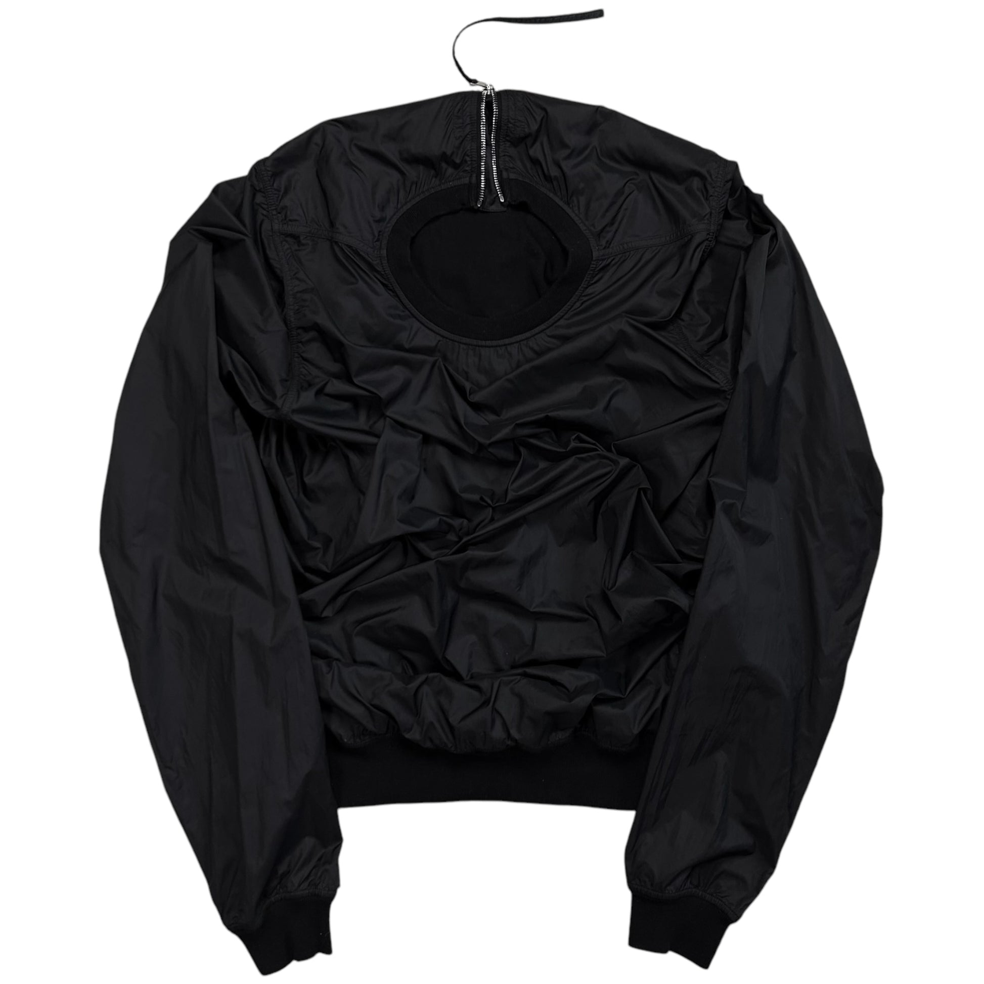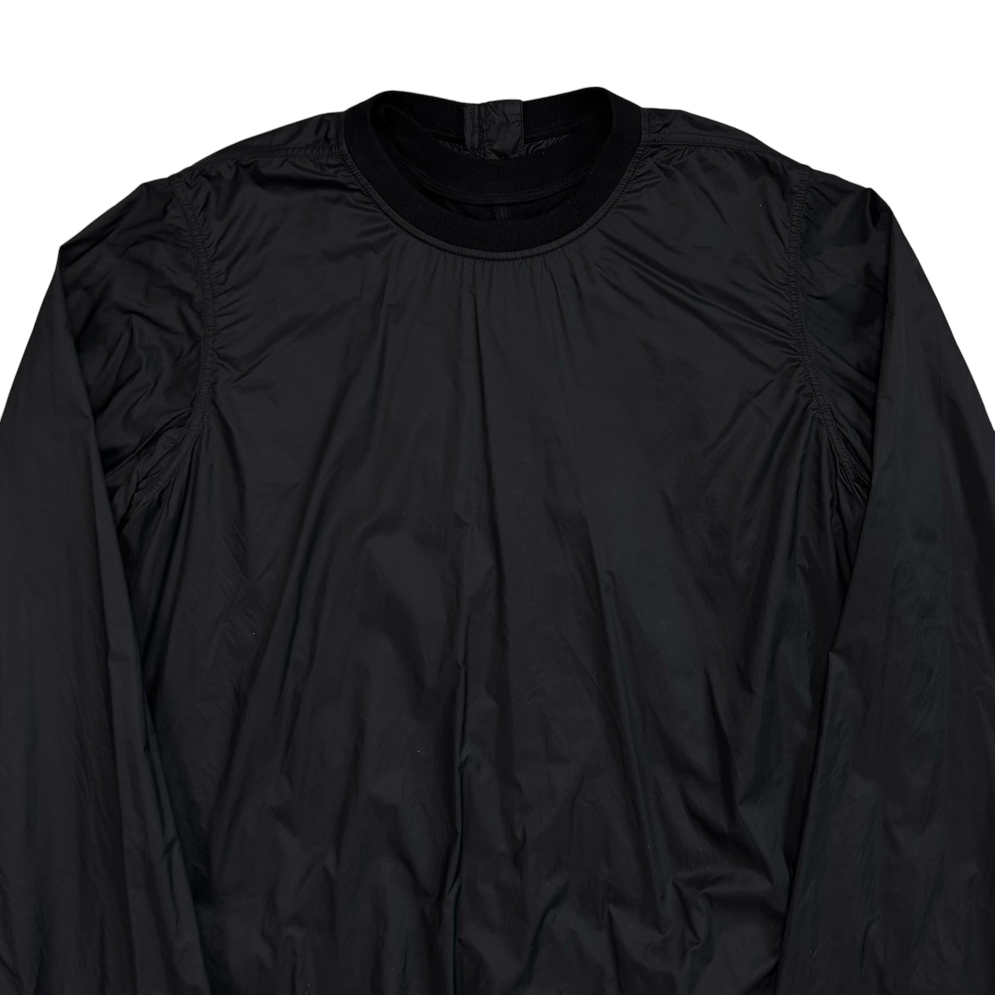 Crewneck sweater from the Fall Winter 2020 collection of the Rick Owens diffusion line Darkshadow. Double layered construction with a nylon longseeve outer layer made from a nylon with a second short sleeve cotton inner layer. Silver zip at the back with a black tassel attached to the puller allowing many styling options. Slightly oversized cut. Retailed for around 550€.