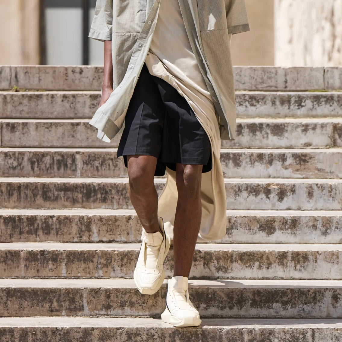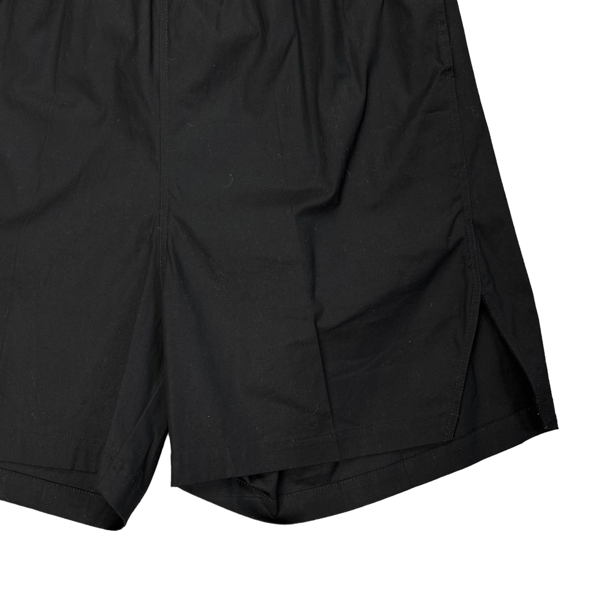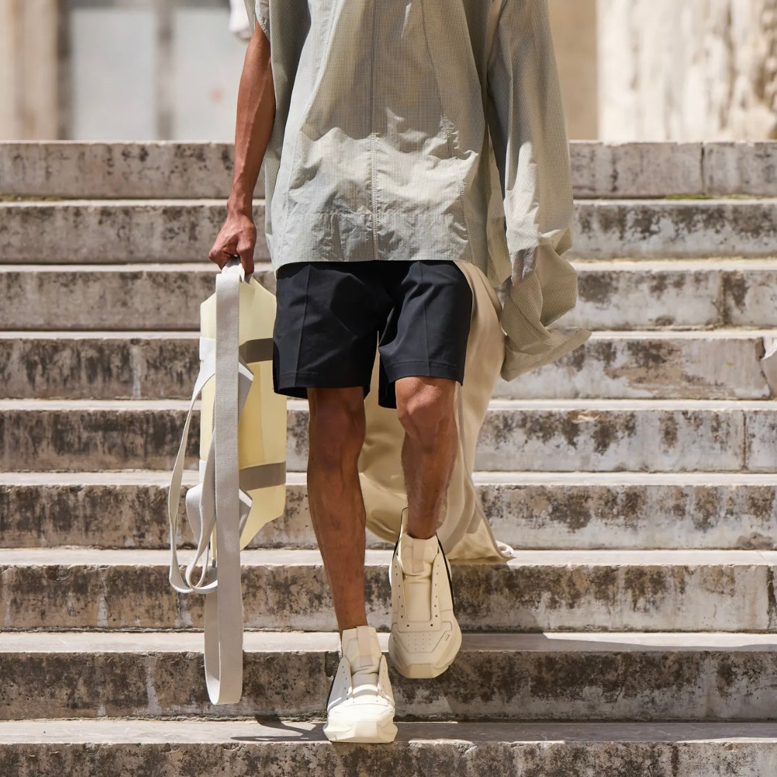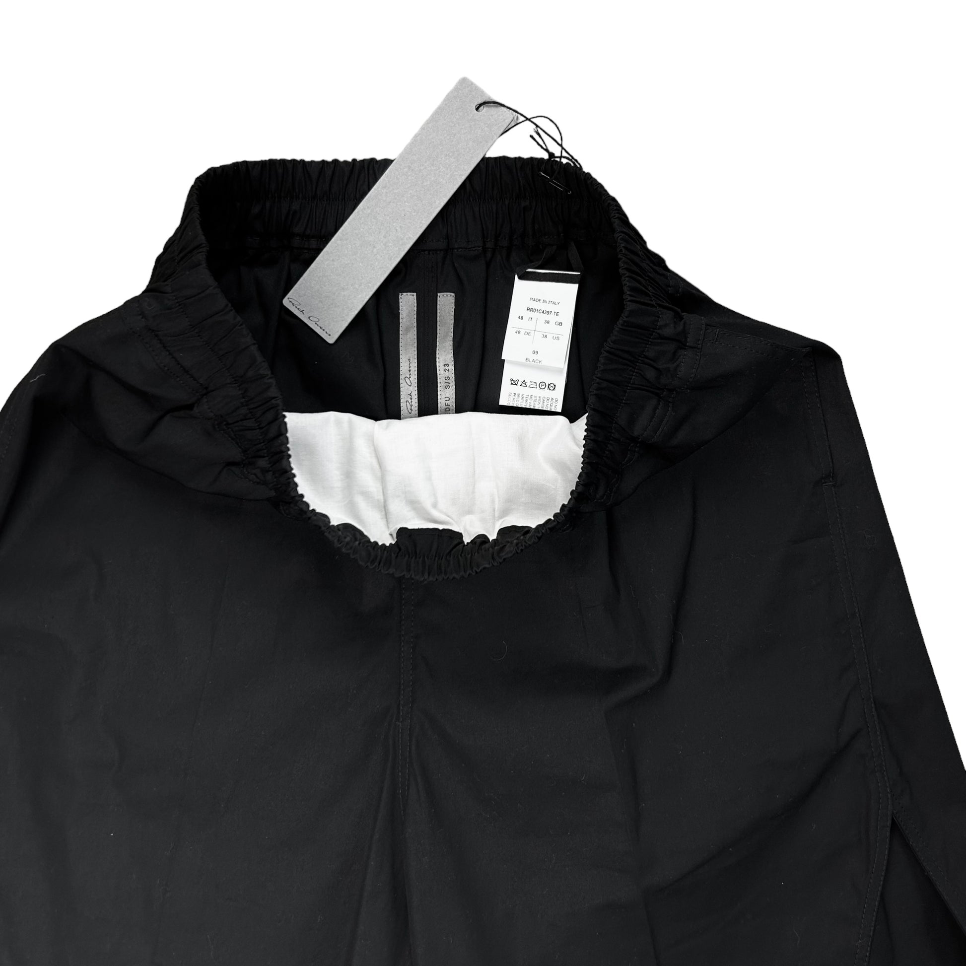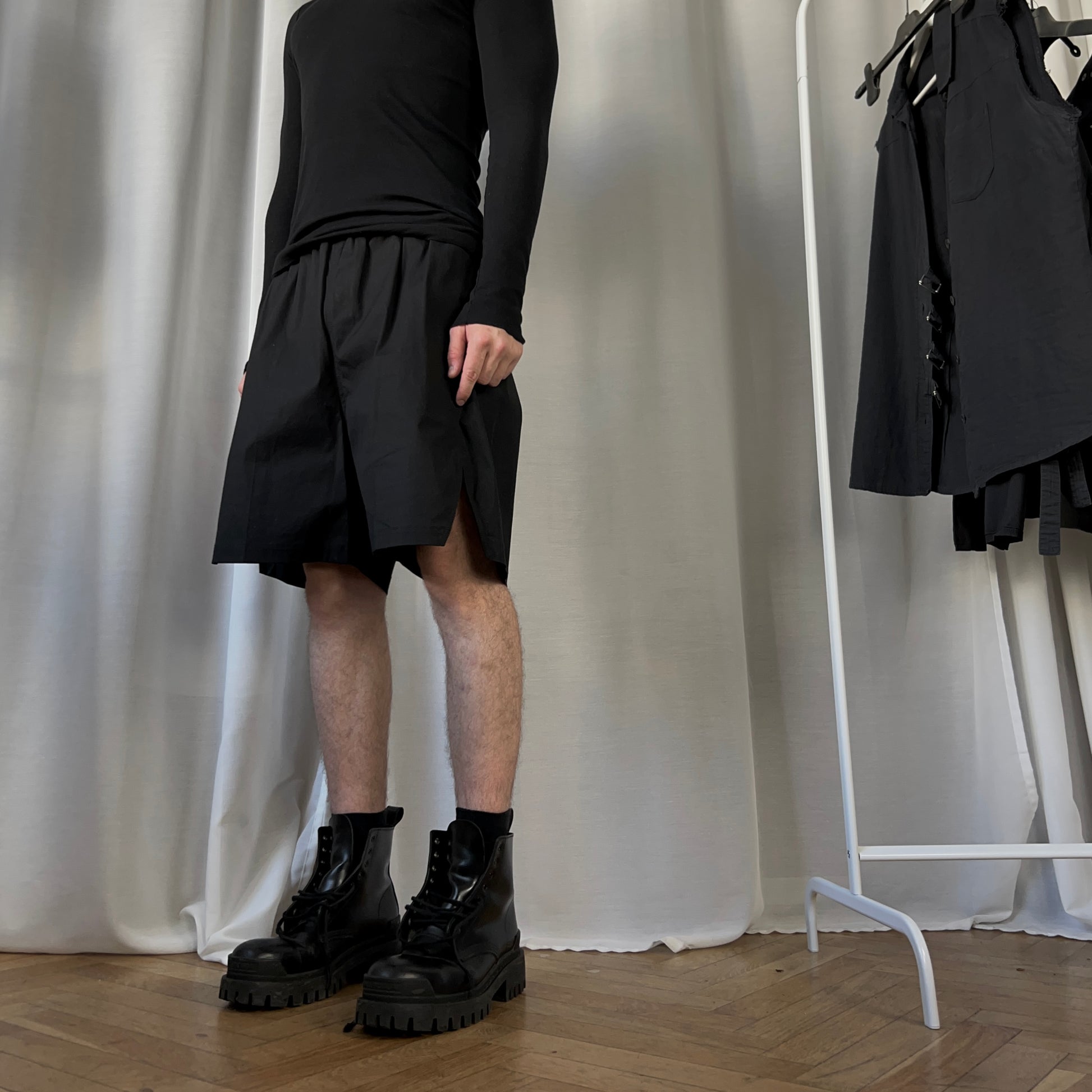Short lounge pants from the Rick Owens Menswear Spring Summer 2023 called Edfu. Elastic waist for a flexible and cozy wearing comfort. Slids at the side hem creating a more interesting silhouette Made from a rigid and technical polyamide material. Wide cut with a subtle drop crotch. Retailed for around 550€.