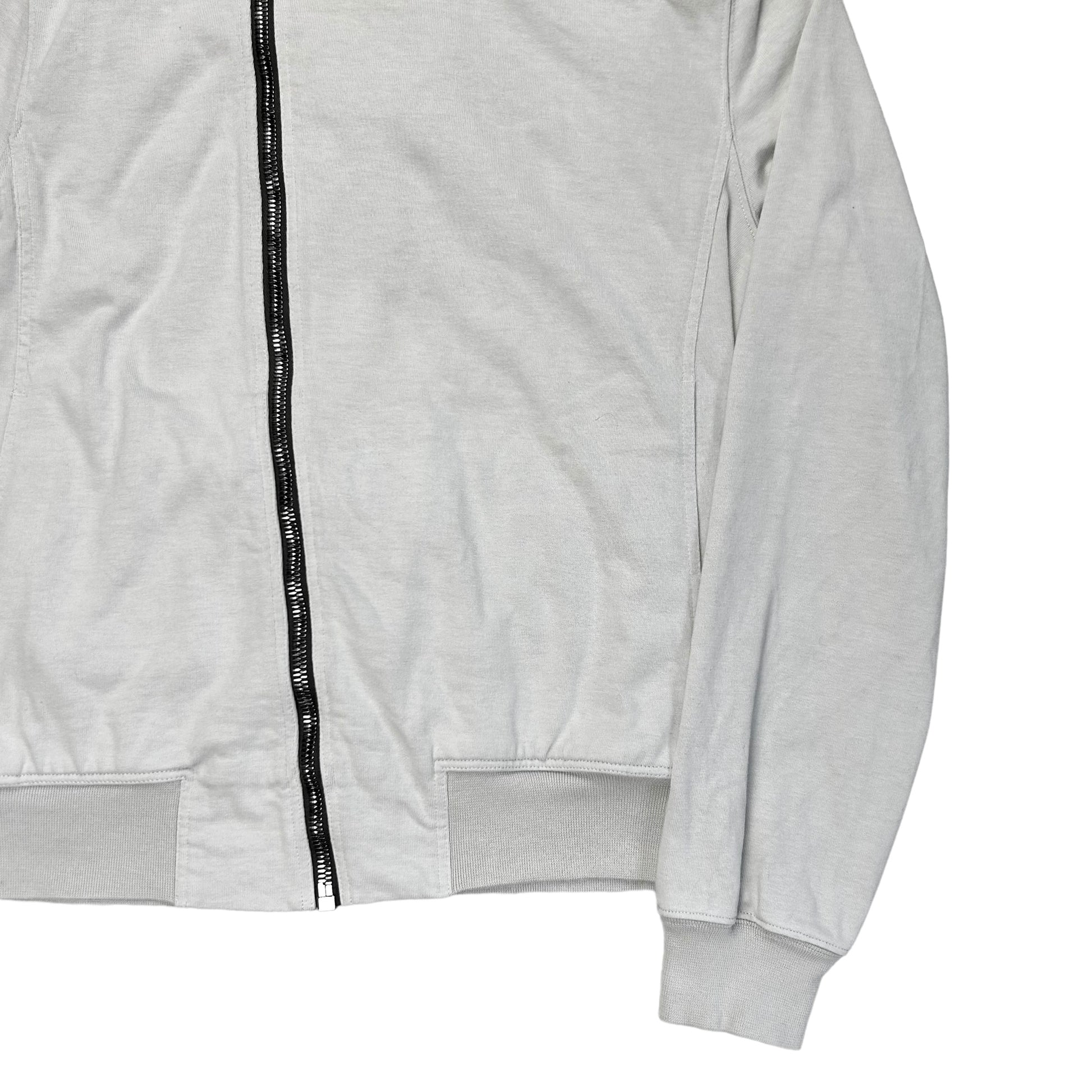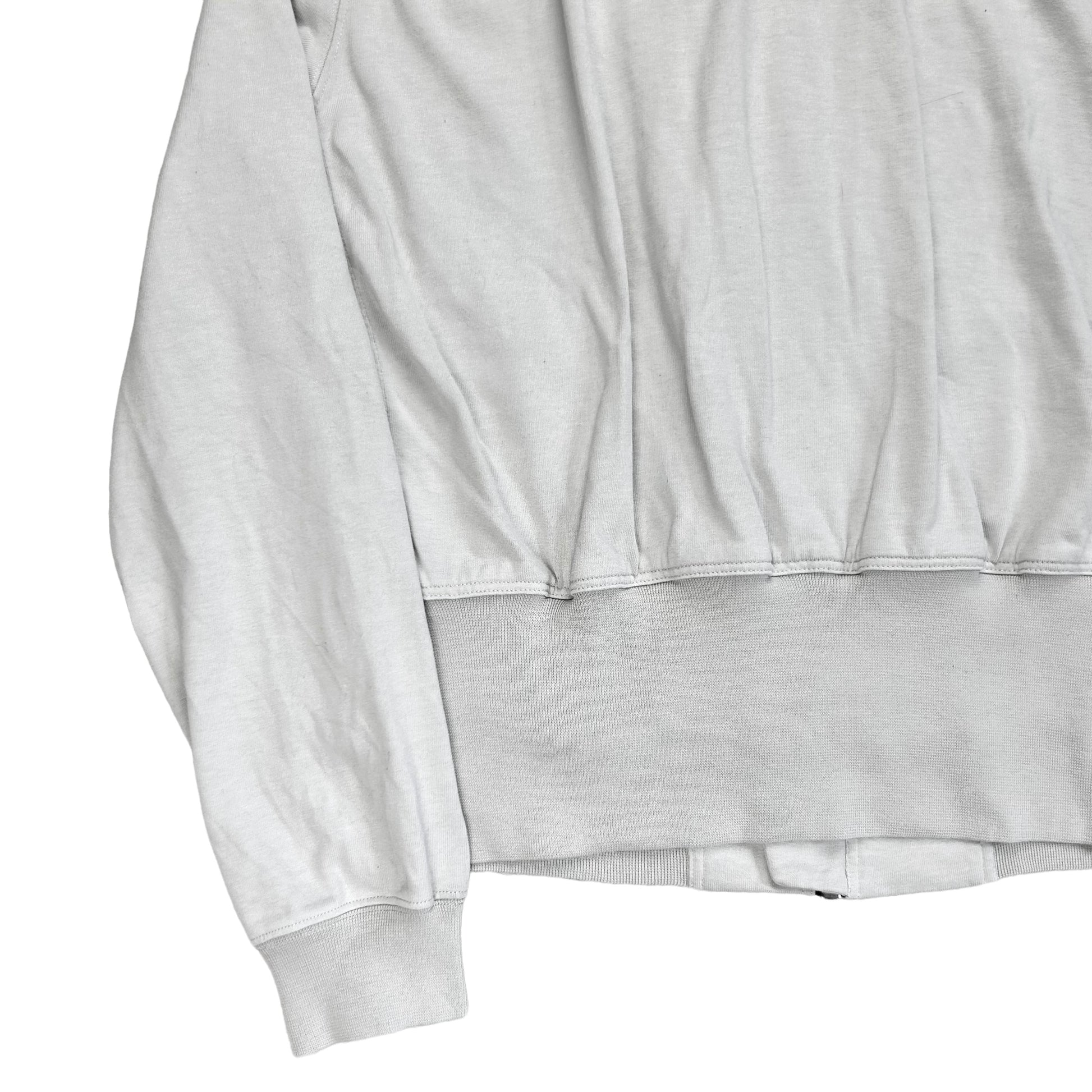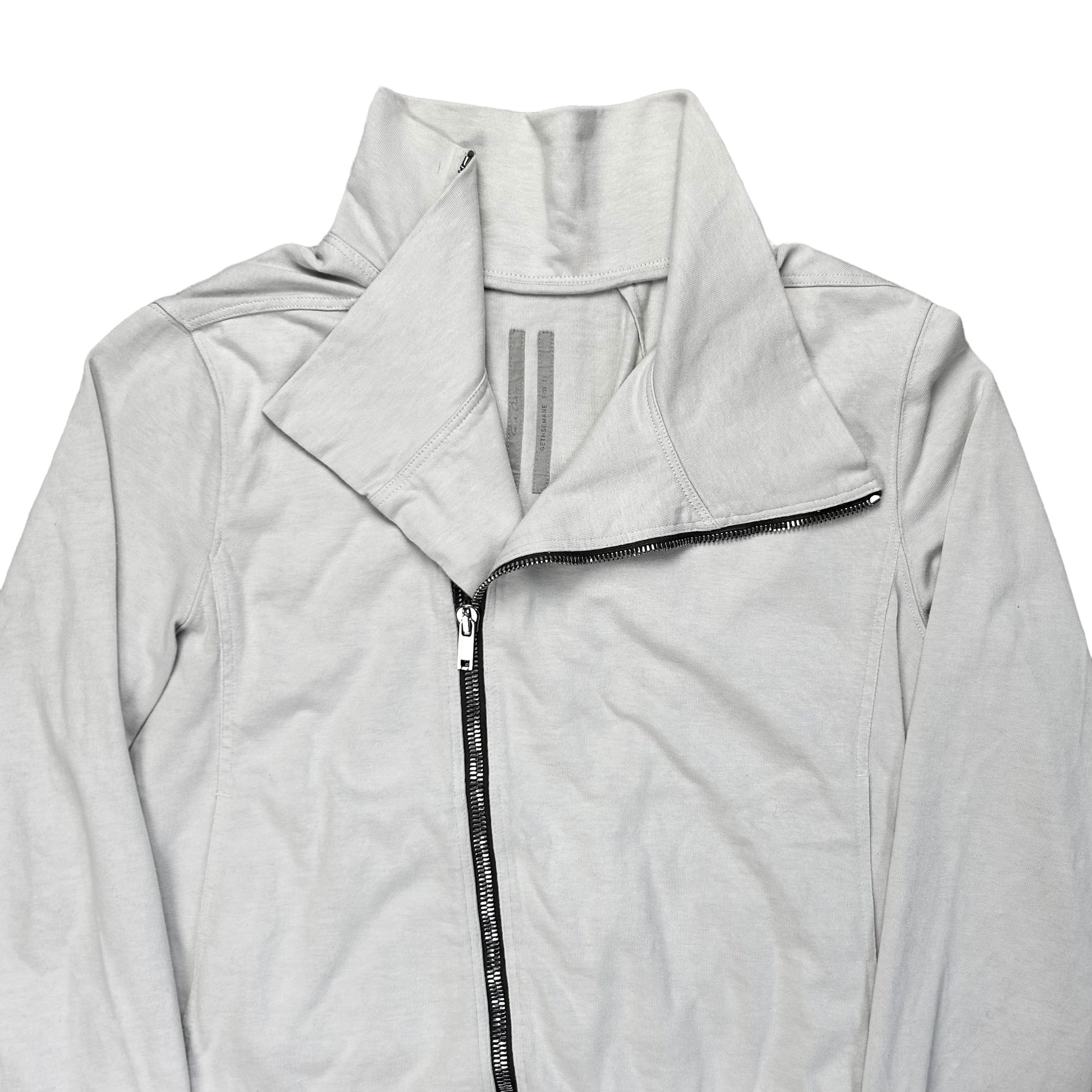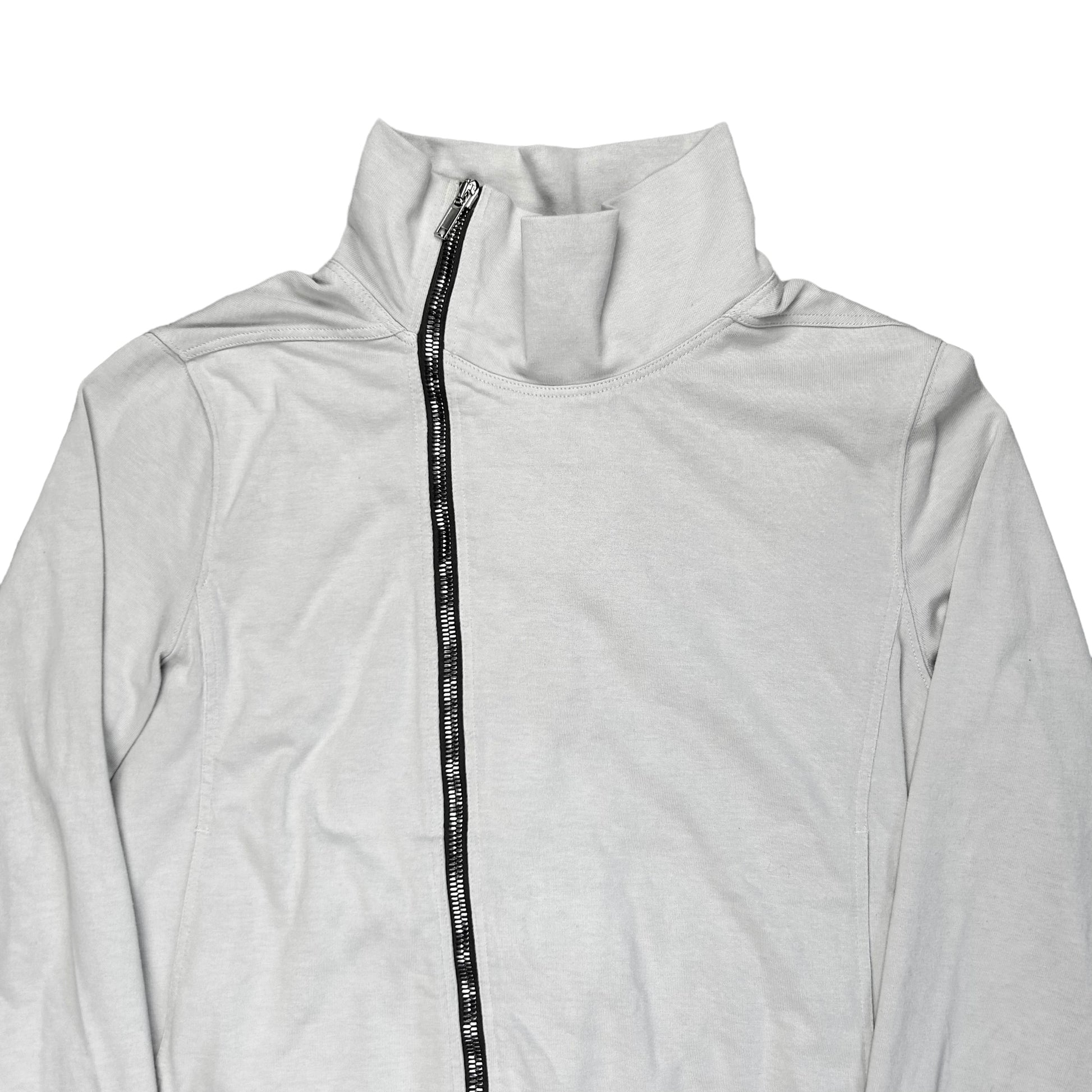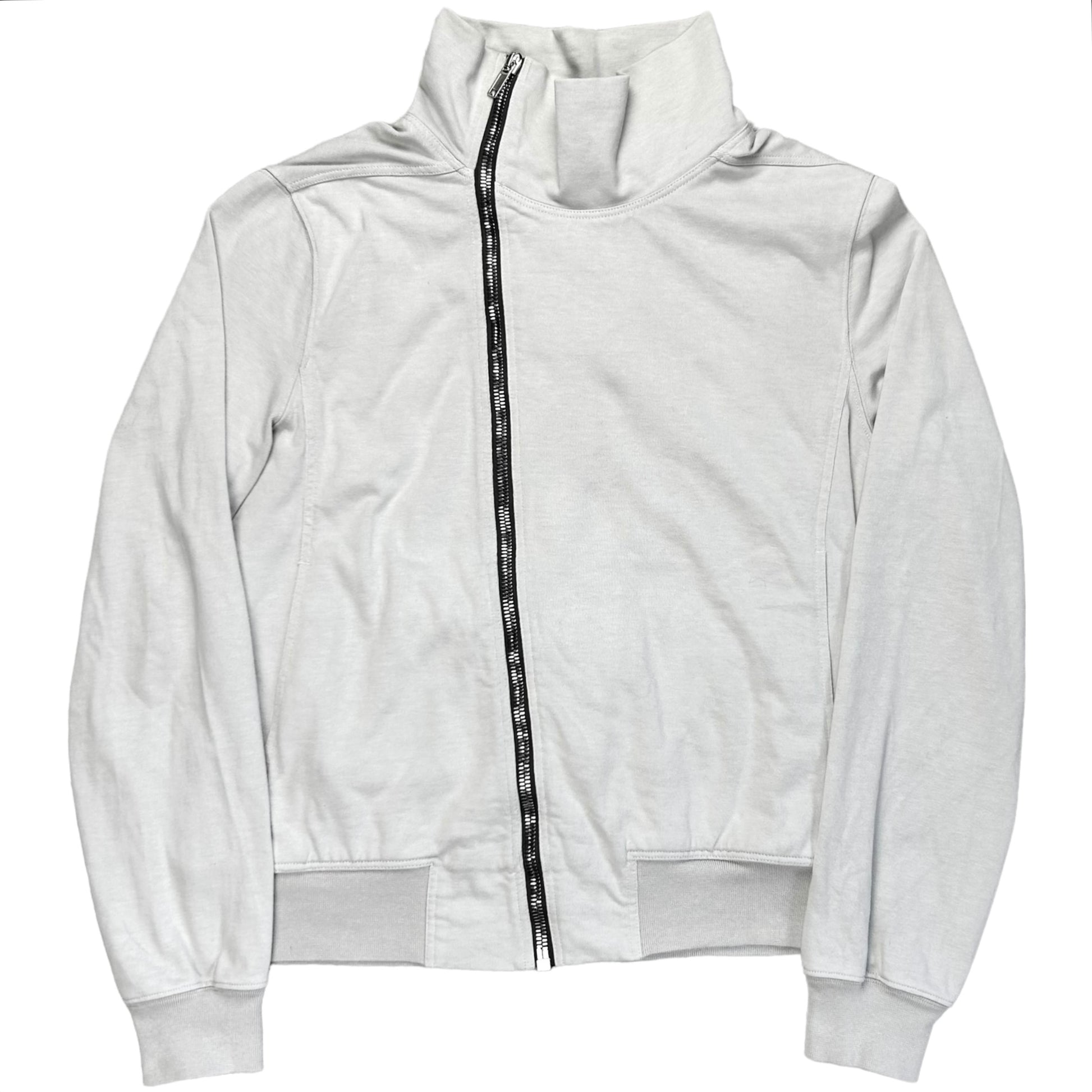 Sweat jacket from the Rick Owens Fall Winter 2021 collection called Gethsemane. Heavy silver diagonal zip going up to the stand collar which allows diffent styling options depending on how it is zipped. Interesting asymmetric ribbed waistband constructions. Made from thick cotton material in the pearl colorway which is a light cold grey color. Boxy and cropped cut with elongated sleeves. Retailed for around 900€.