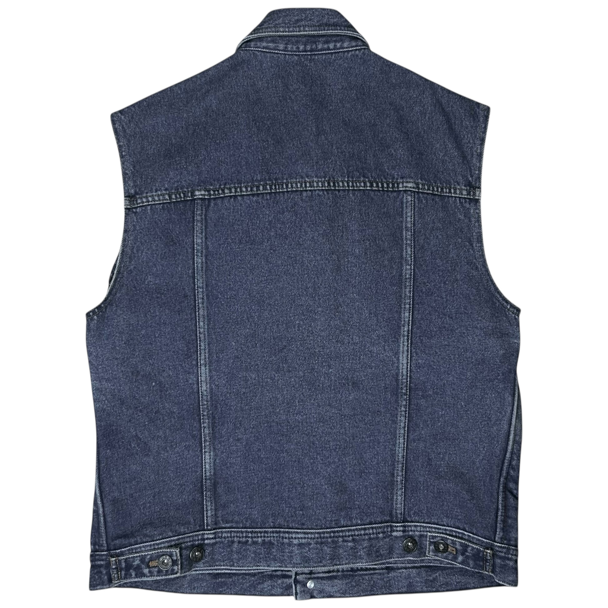 Sleeveless trucker jacket from the Y/Project Spring Summer 2018 collection which was designed by Glenn Martens. Interesting construction with two garments sewn together which allows multiple button and wearing options. Further buttons at the chest pockets and waist tabs. Made from a medium washed denim cotton material. Boxy cut.