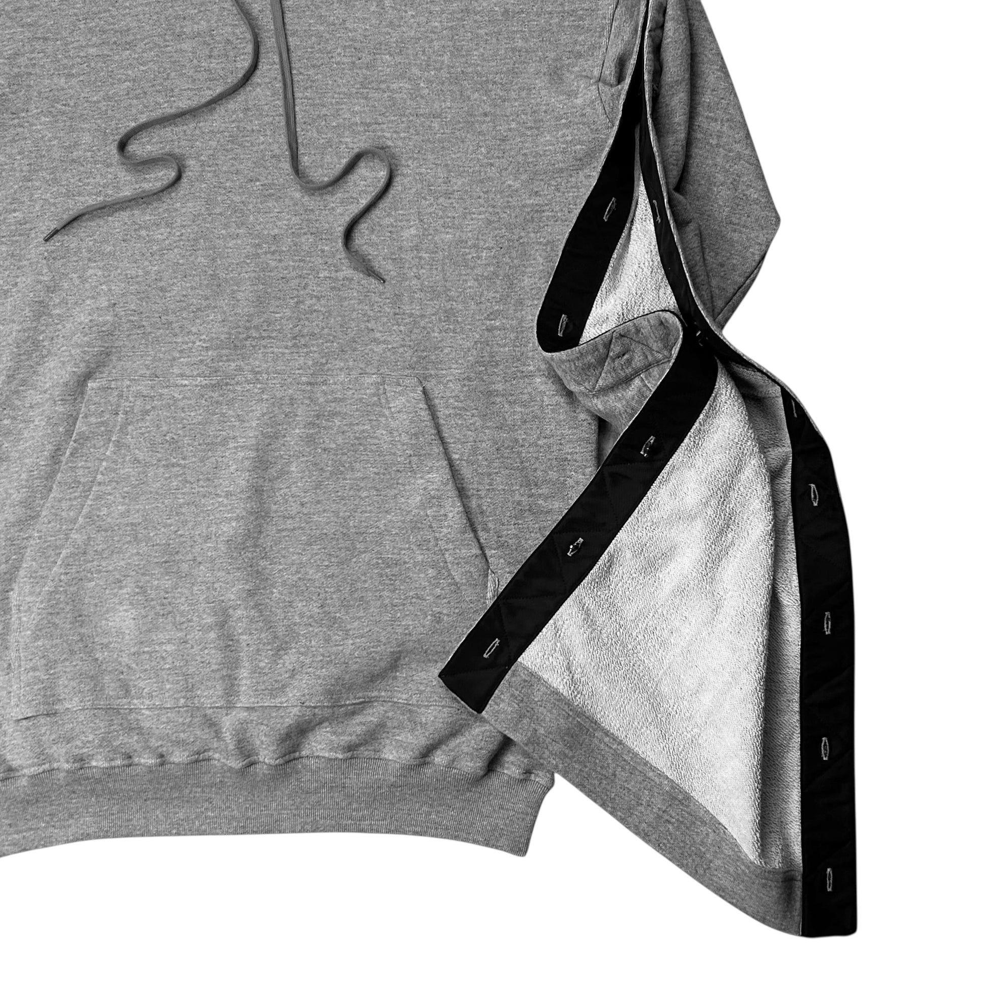Hooded sweater from the Y/Project Spring Summer 2017 collection which was designed by Glenn Martens. Interesting construction with tremendous sleeves with silver buttons that can be placed in different ways allowing to play around with the arm silhouette. Classic construction with a kangaroo pocket and tonal elongated drawstrings at the hood. Made from a light grey heavyweight cotton material. Oversized cut.