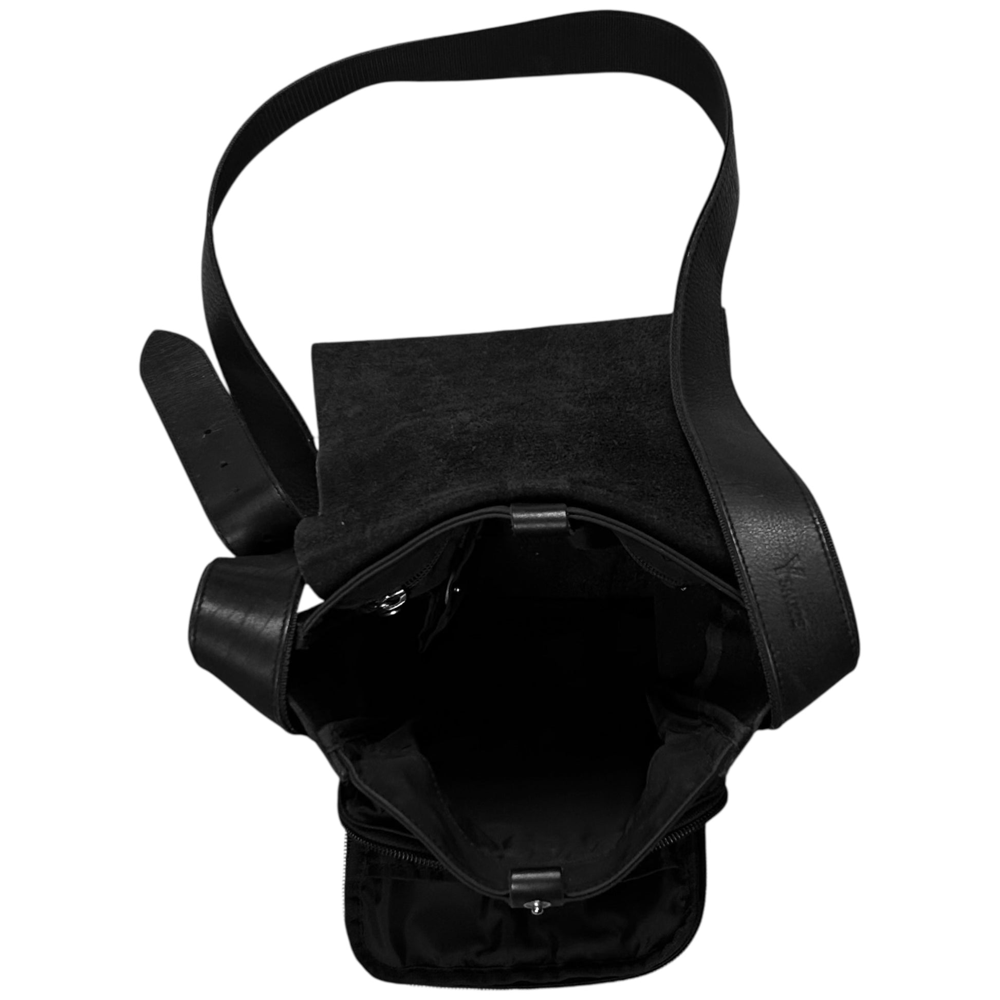 Shoulder bag body bag from the Yohji Yamamoto Bag line called Y’Saccs. Leather flap with a suede inside and a concealed silver snap button closure. Hybrid construction with a nylon front and bag and leather parts. Adjustable leather strap with silver buckle fastening. Multiple zip pockets and departments at the inside and outside. Made from weathered black leather and technical nylon.