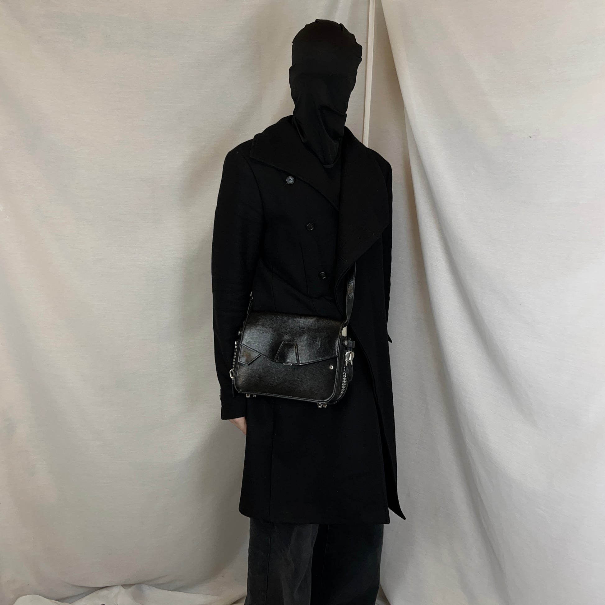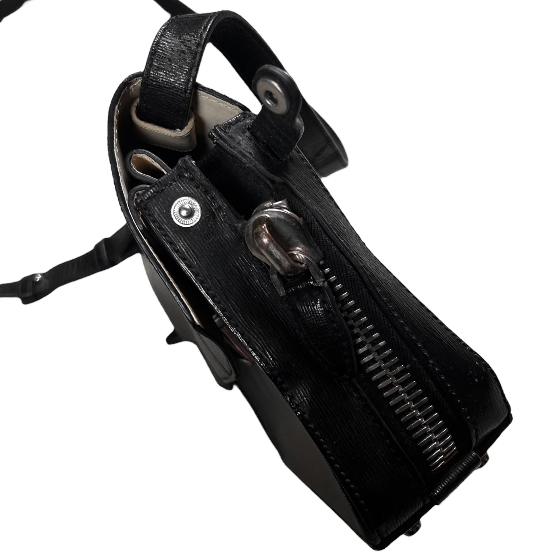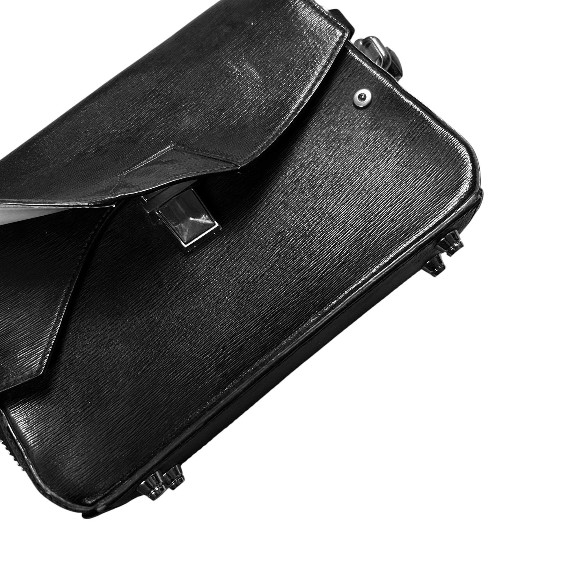 Small messenger bag from Alexander Wang. Structured silhouette with a geometric embossed flap and concealed snap button closure. Heavy silver zip at the side with 3D studs underneath. Compact dual-compartment interior with an additional inner pocket for essentials. Adjustable leather strap with silver hardware allows the bag to be worn crossbody or on the shoulder. Crafted from textured black leather with a subtle sheen.