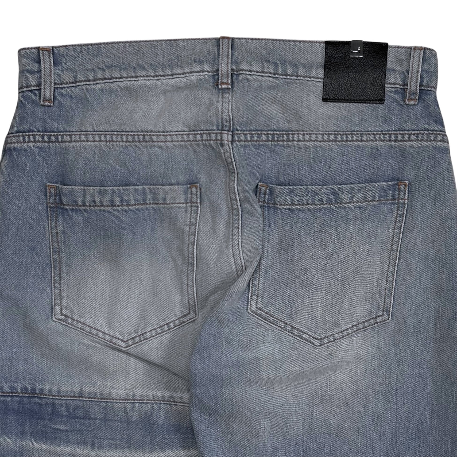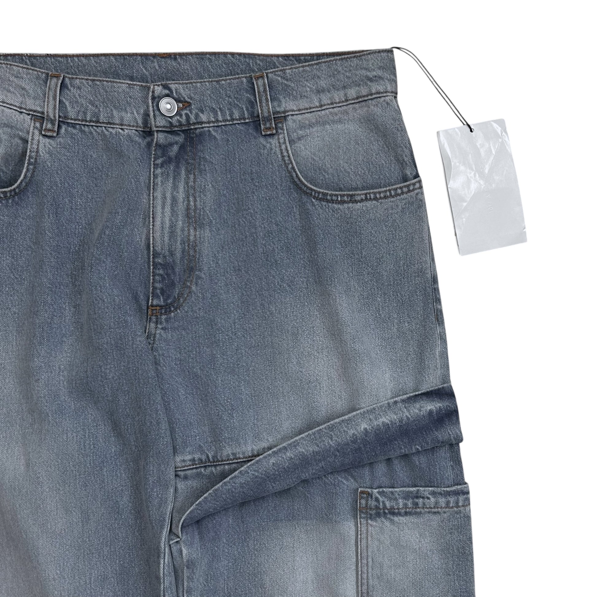 Jeans form the Spring Summer 2024 collection of 1017 Alyx 9SM by Matthew Williams. Asymmetric cargo pockets at the lower left leg and the right thigh with an extra double layer flap layer. Signature grained leather patch at the back of the waist. Made from a light blue washed denim cotton material. Straight cut with a long inseam for a stacking effect. Retailed for 600€.