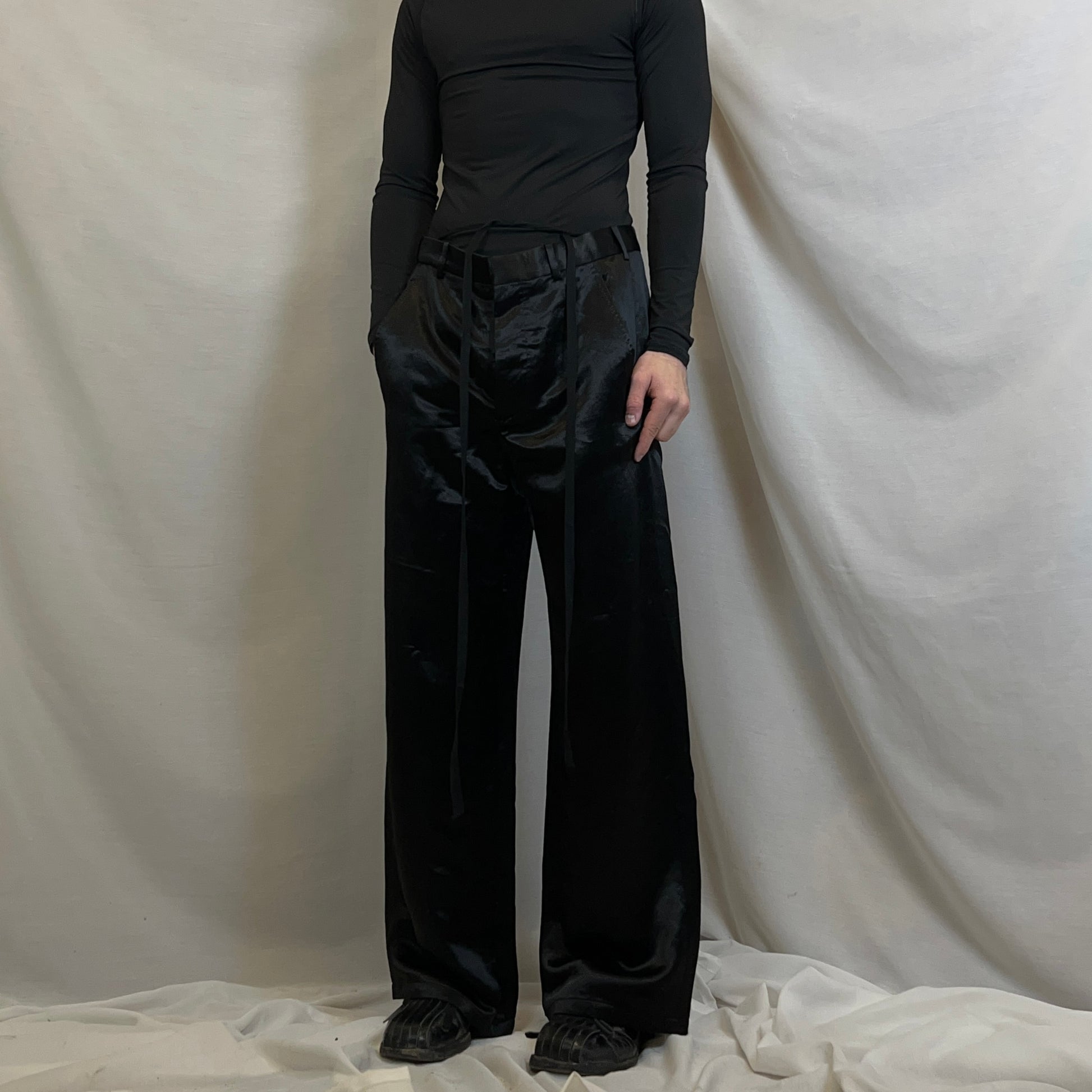 Deep black pants from the Ann Demeulemeester Fall Winter 2021 ready to wear collection. Long black string at both waist sides with which can be tied and styled in different ways. Asymmetrical flap back pocket. Made from a structured glossy acetate material in a deep black. Wide and straight cut. Retailed for around 800€.