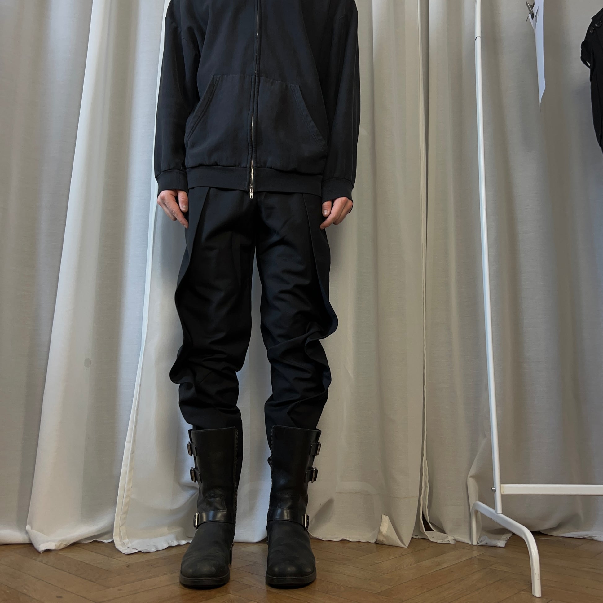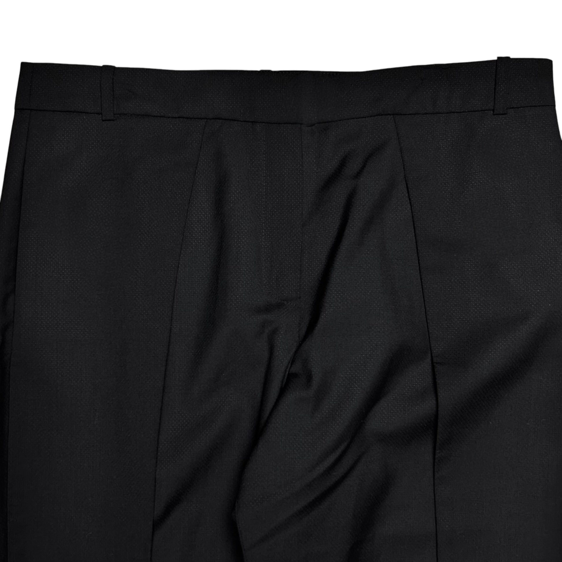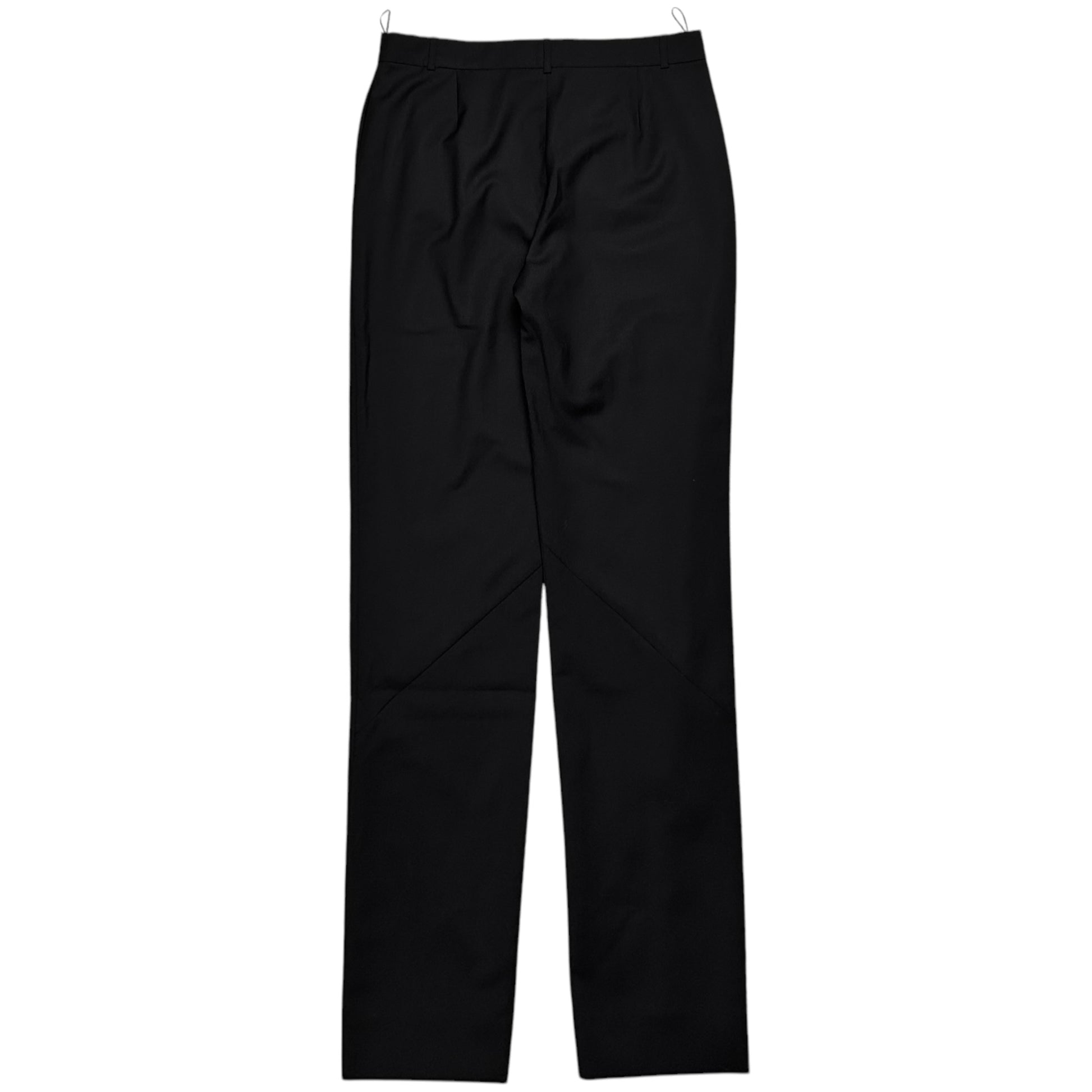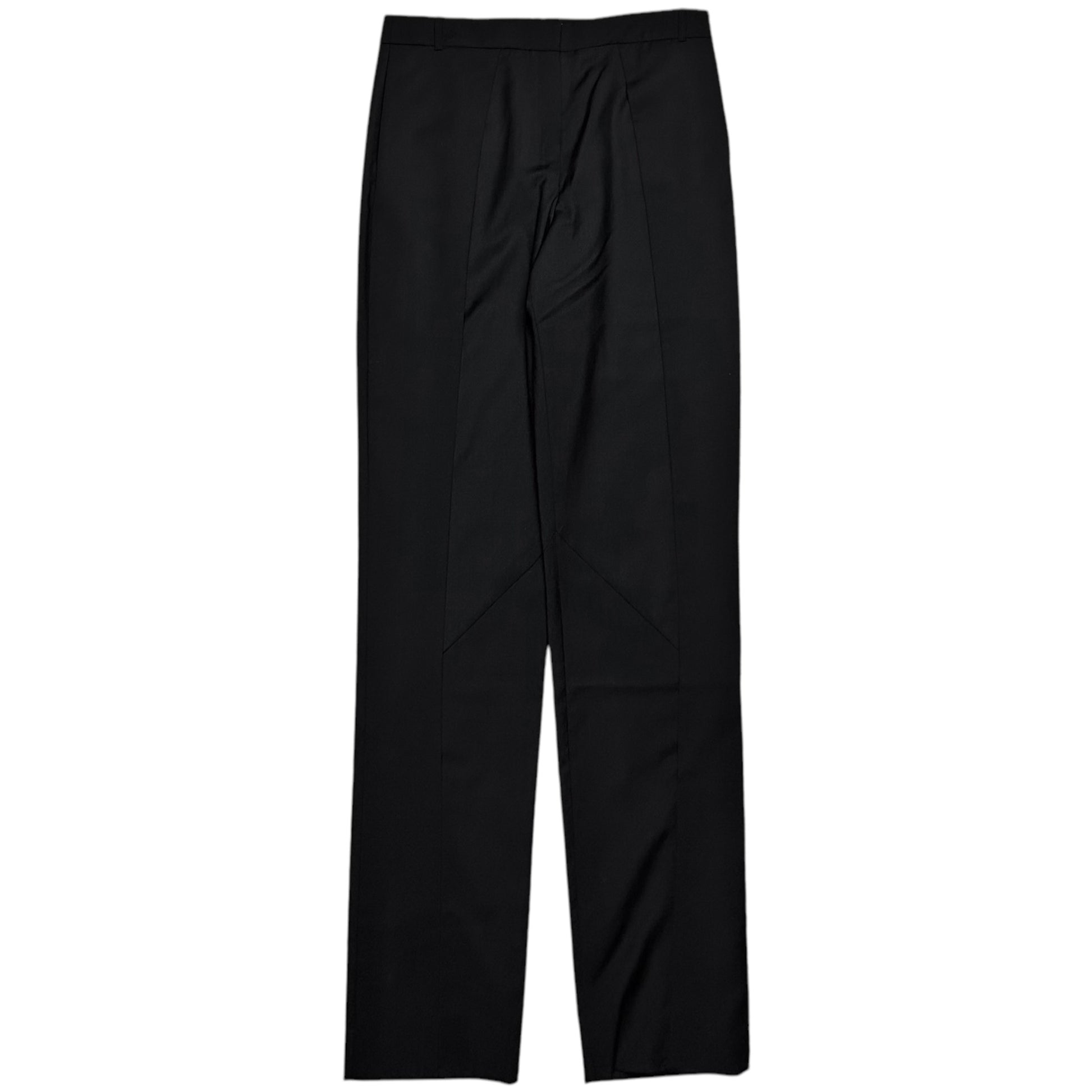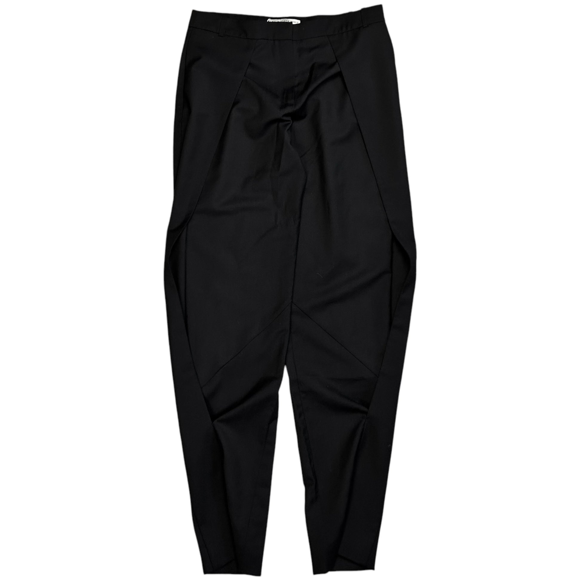Suit pants from the Balenciaga Paris Spring Summer 2011 collection which was designed by Nicolas Ghesquière. Double layered construction which is shown during movement which is darted together below the knee. Visible panel seam lines. Made from a technical wool and mohair blend fabric with a subtle texture. Slim cut.