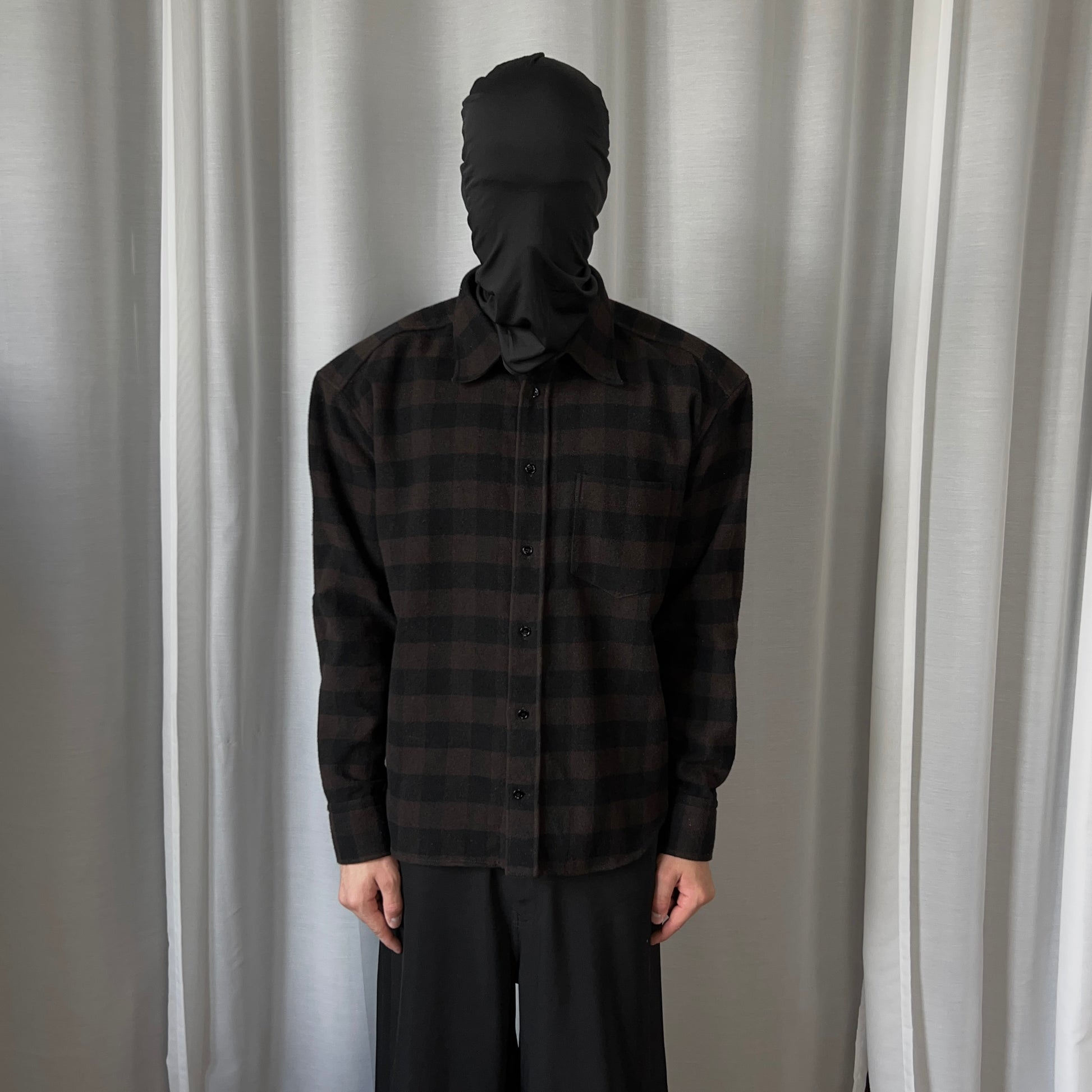 Button up shirt from the Balenciaga Spring Summer 2017 collection which was the second collection of Demna Gvasalia. Classic black and brown checkered pattern. Padded shoulder panel creating exaggerated shoulders and a slightly distorted silhouette. Foldable collar with black buttoning and a chest pocket. Made from a soft wool blend fabric. Boxy and oversized cut with a rounded hem.