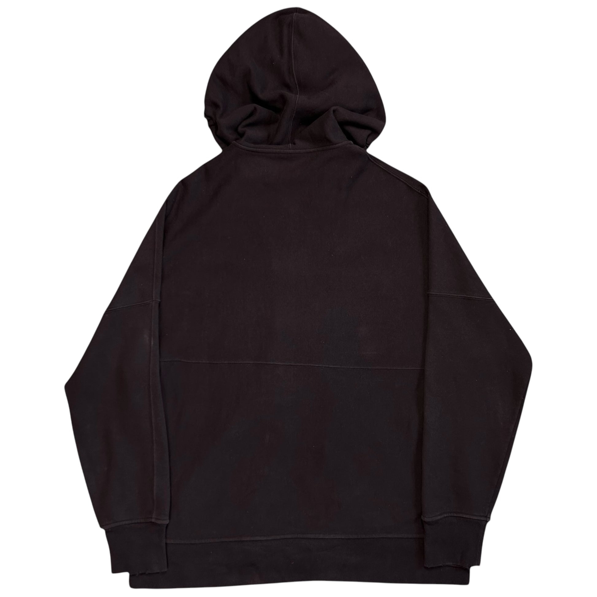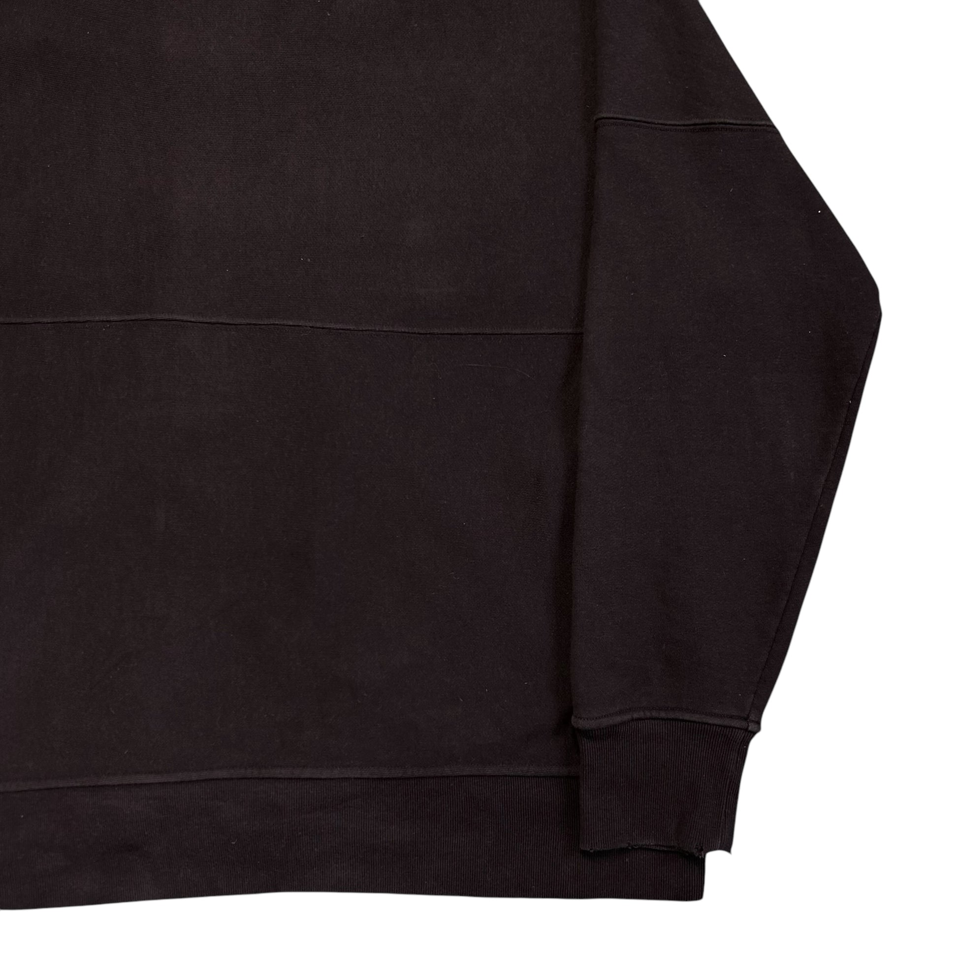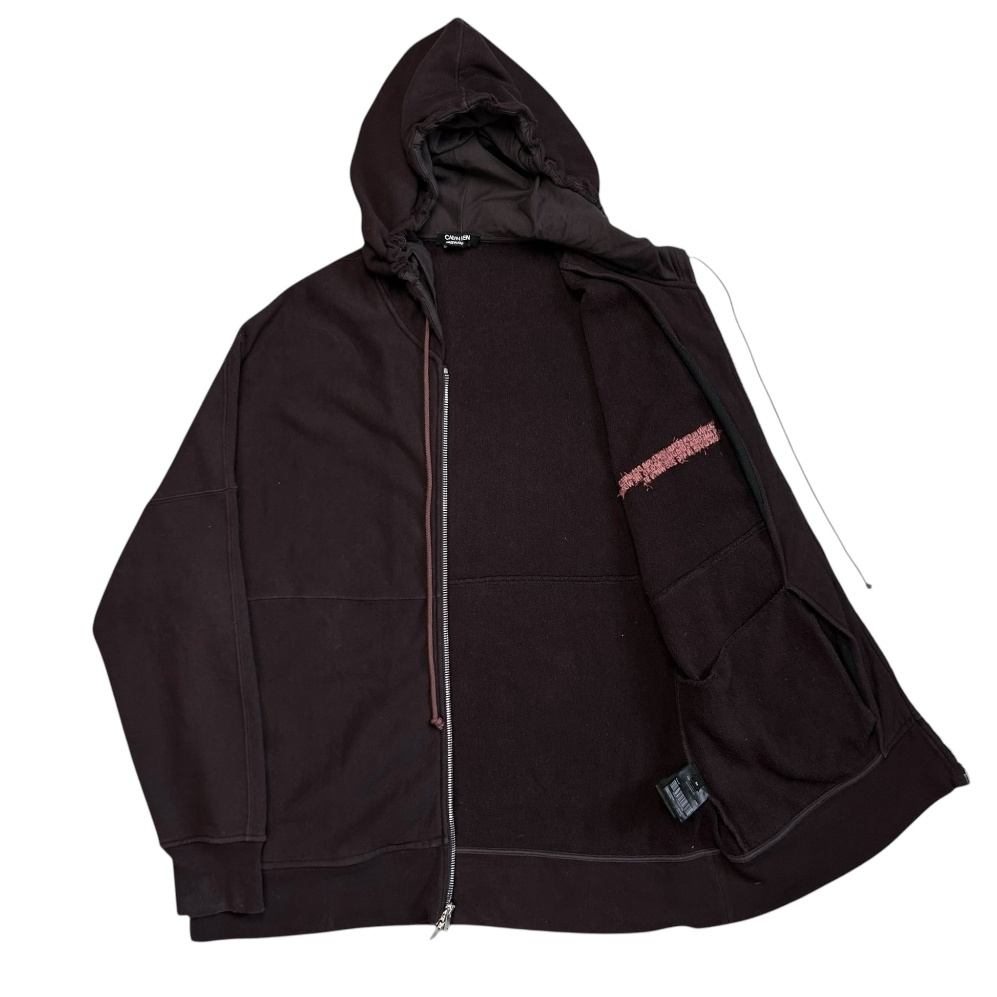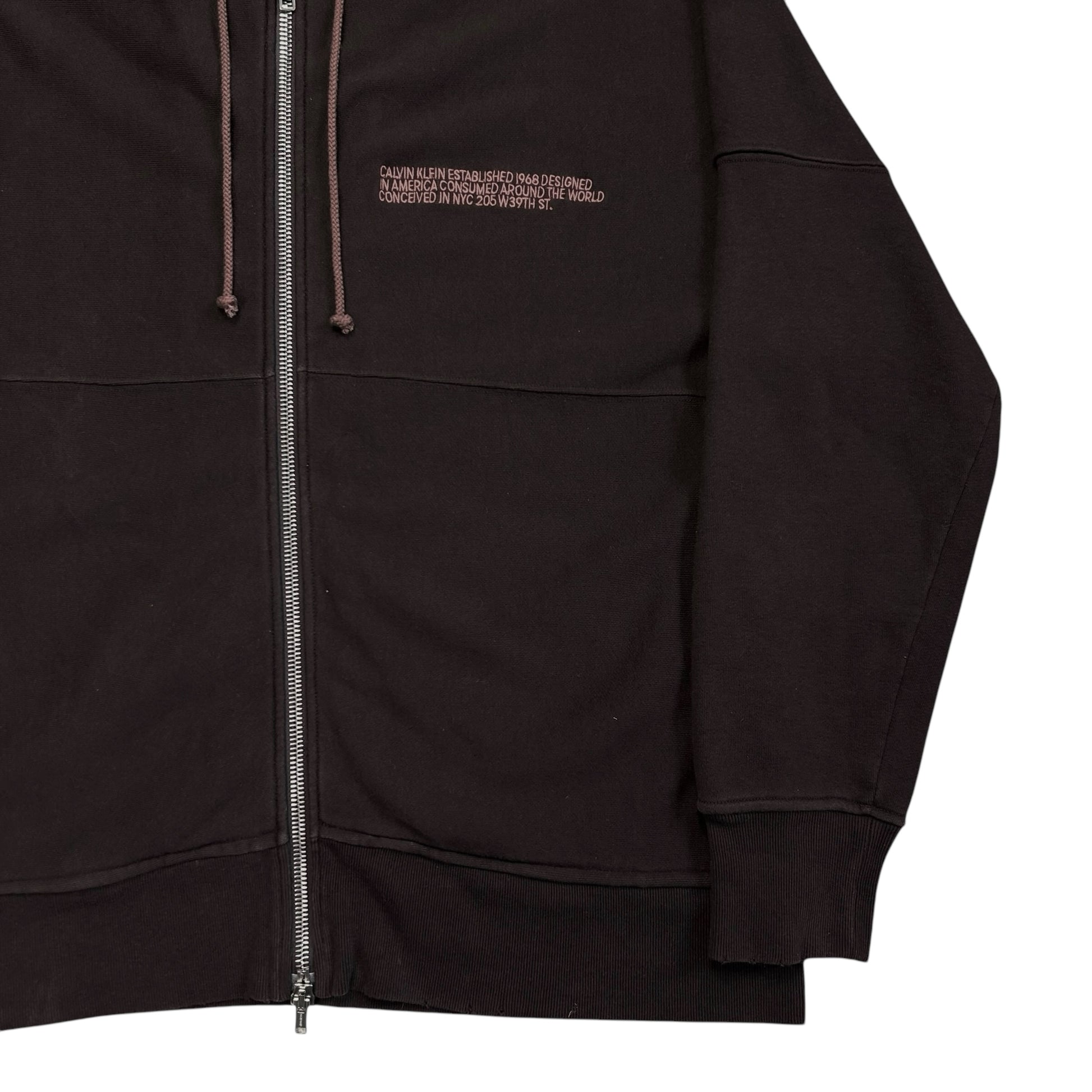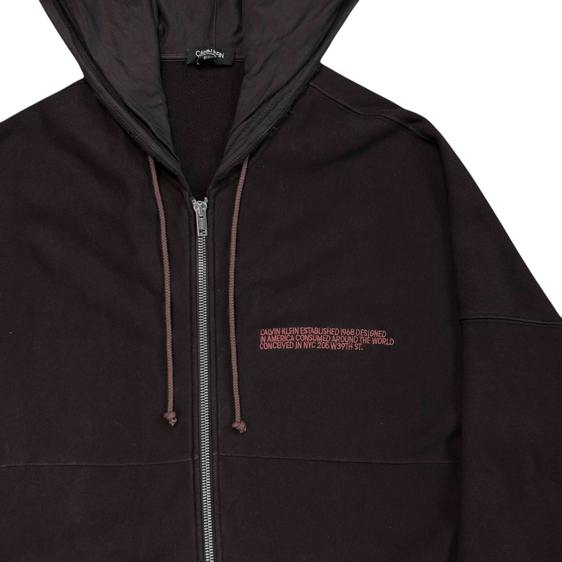 Hooded sweater from the Fall Winter 2018 of CK205W39NYC designed by Raf Simons. Logo chest embroidery in a color blocking red. Silver Lampo zip closure with silver eyelet hardware at the drawstring hood. Paneling going around the body and sleeve. Subtle distressing at the hood and hem. Made from a thick and heavyweight brown cotton material. Oversized and slouchy cut.