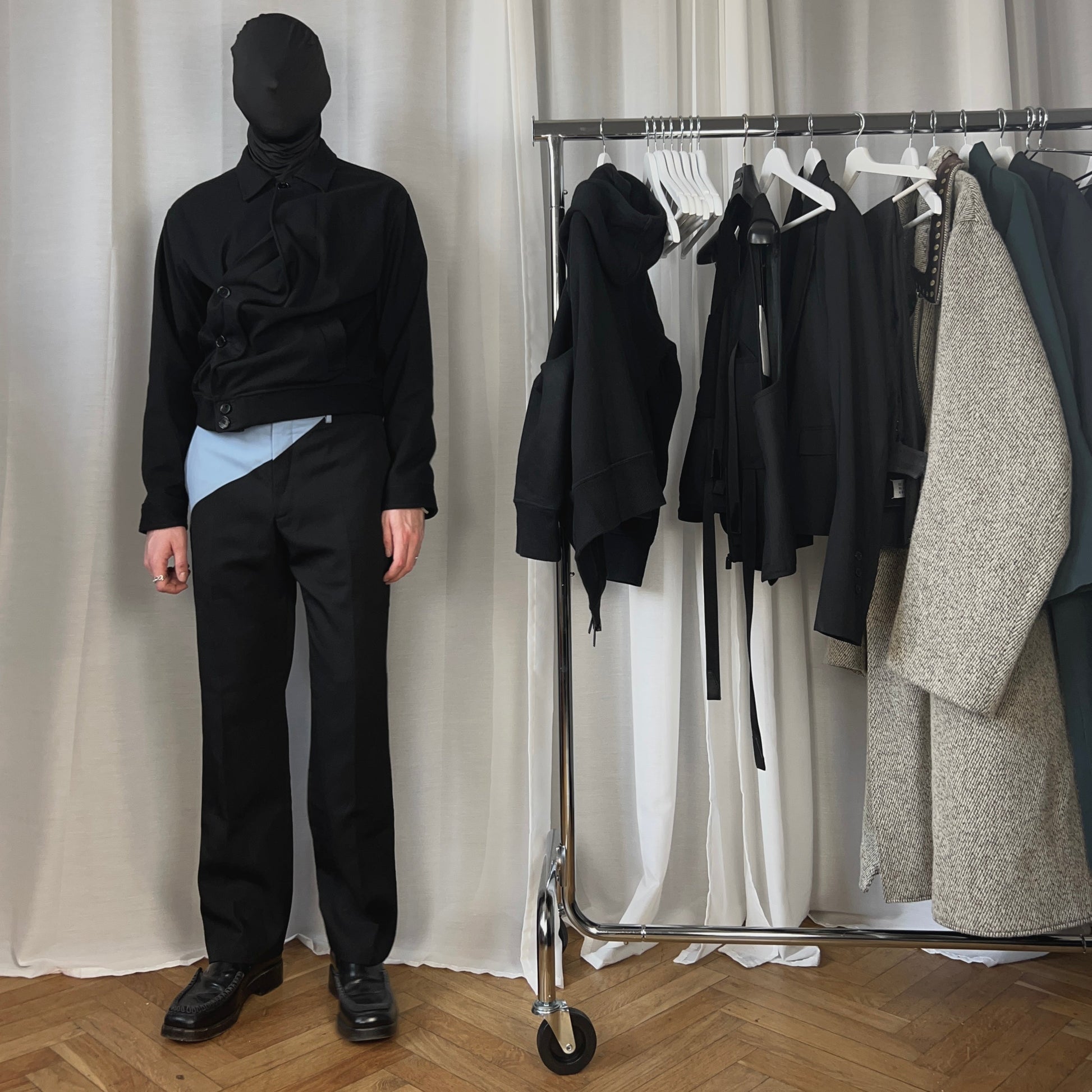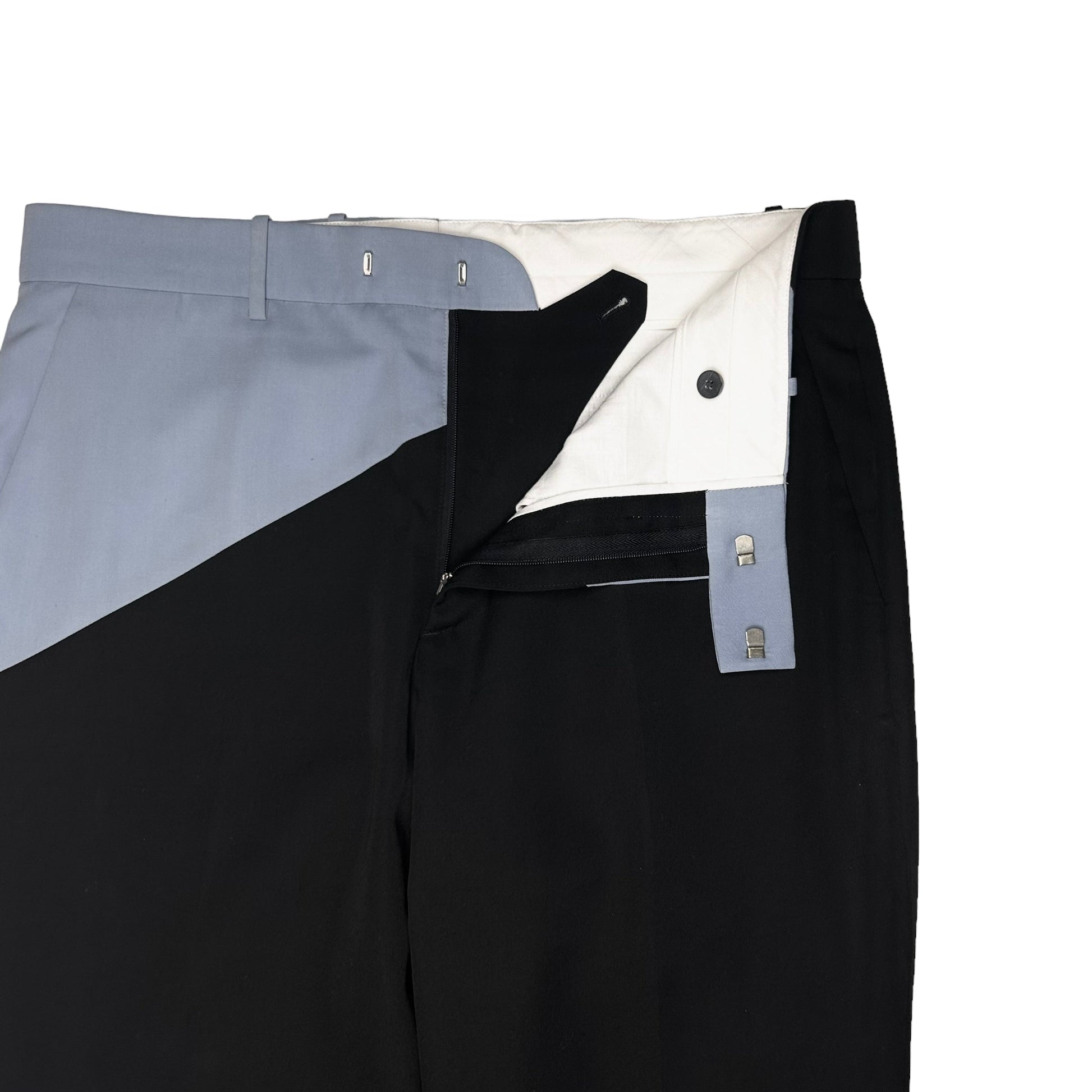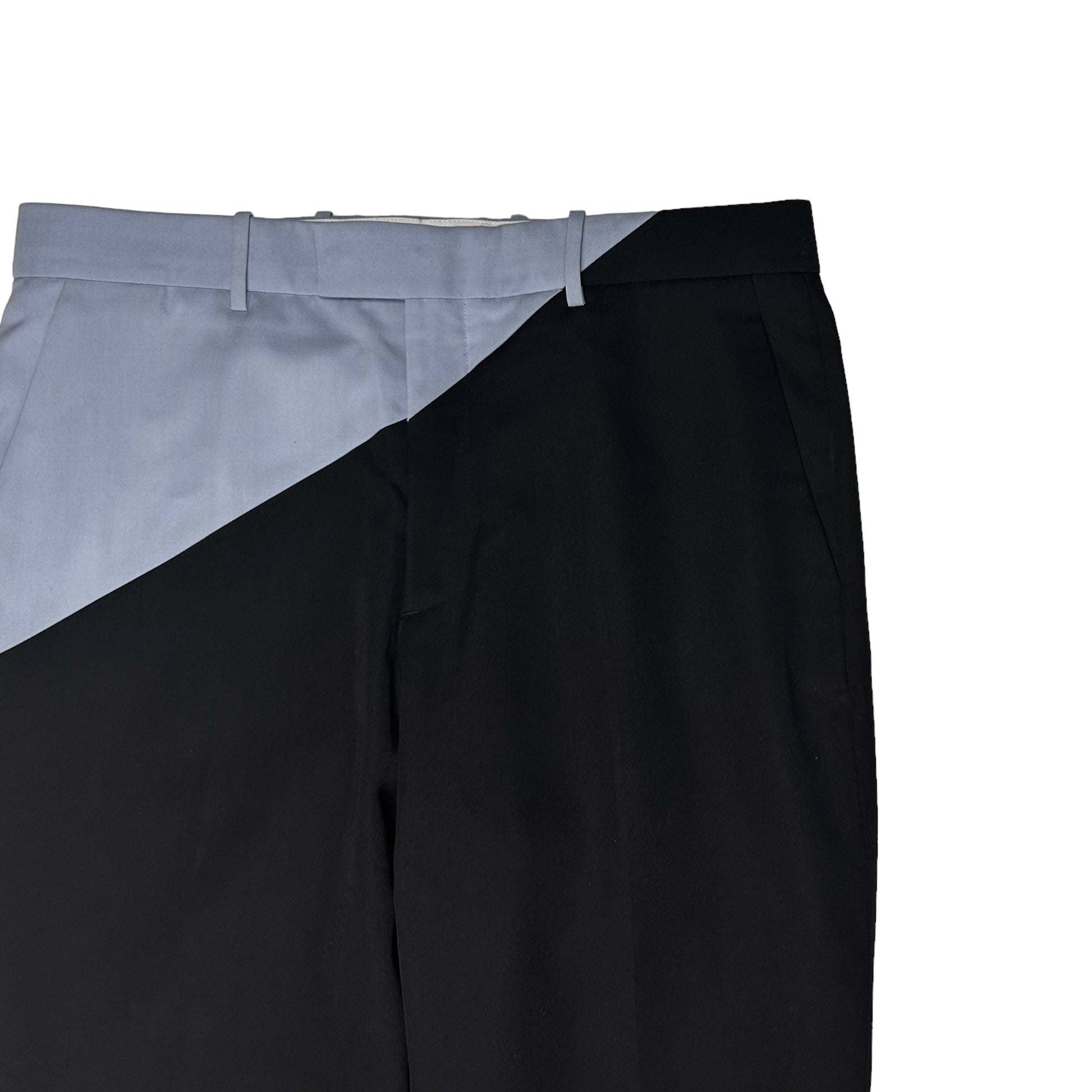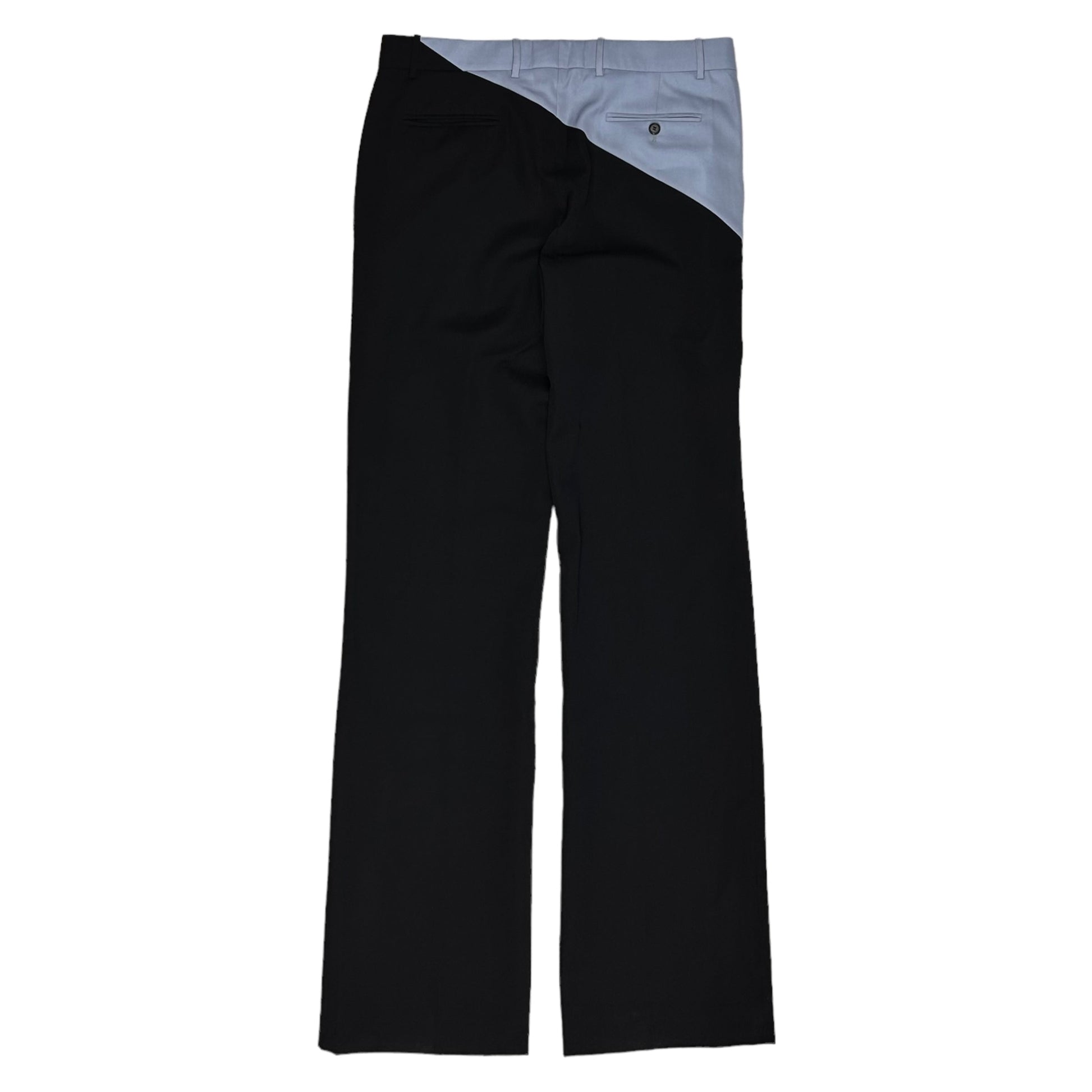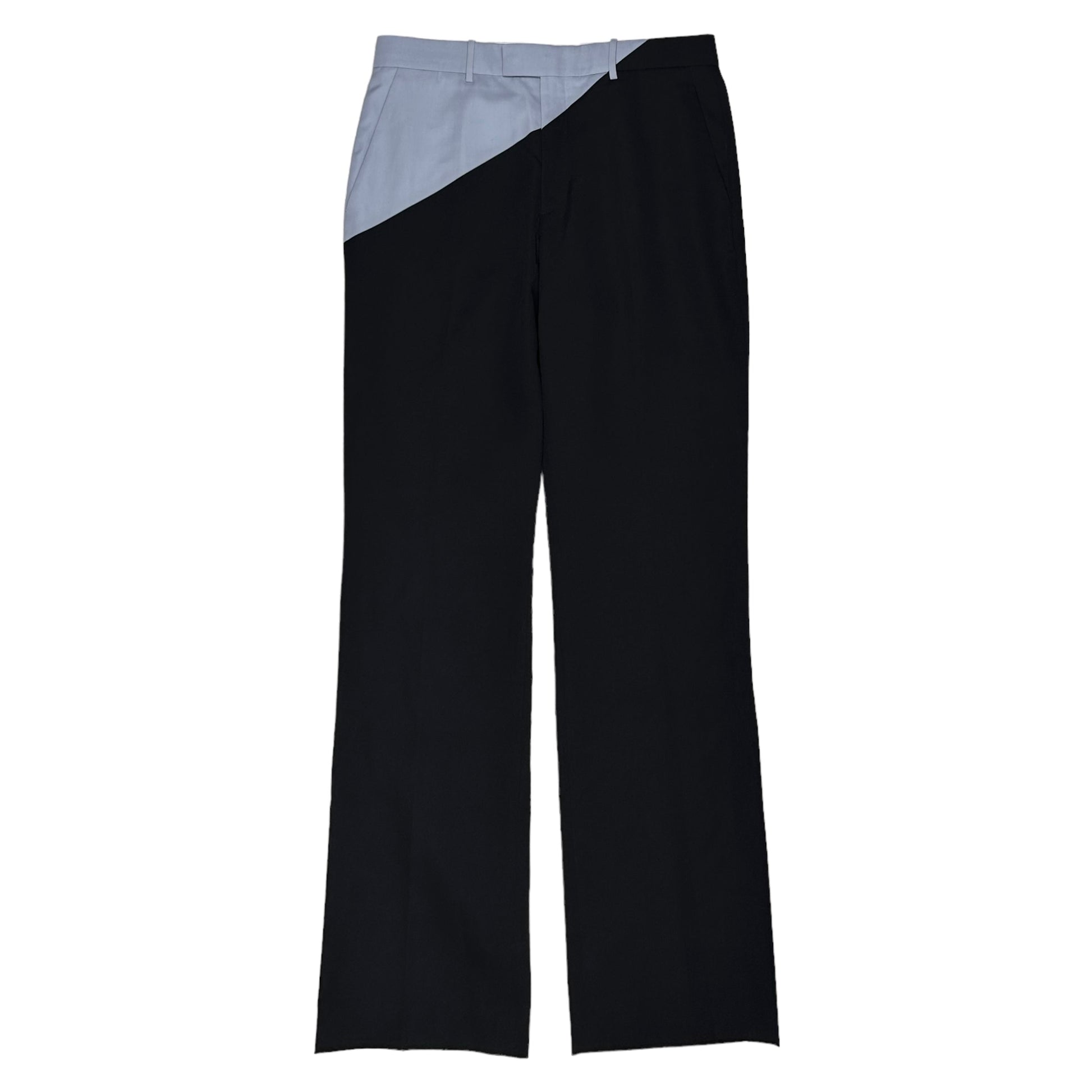 Unique suit pants from the Fall Winter 2017 collection of the iconic Raf Simons and CK cooperation. Two tone design with a diagonal shape. Beautiful contrast between the saturated light blue and the deep black. Made from. Smooth and high quality wool material. Straight and slim cut. Retailed for around 800€.