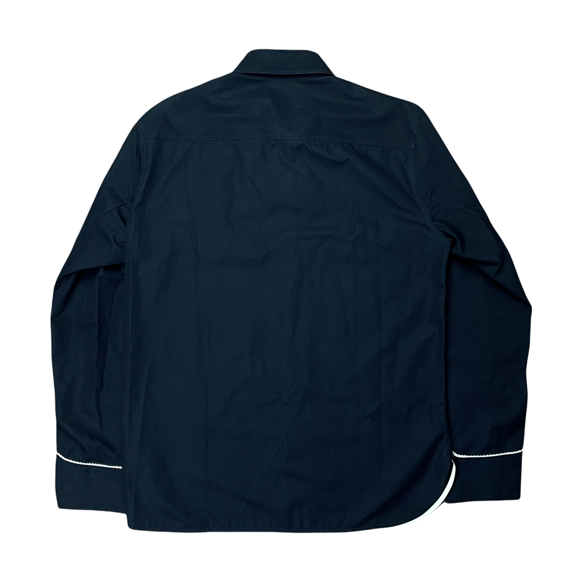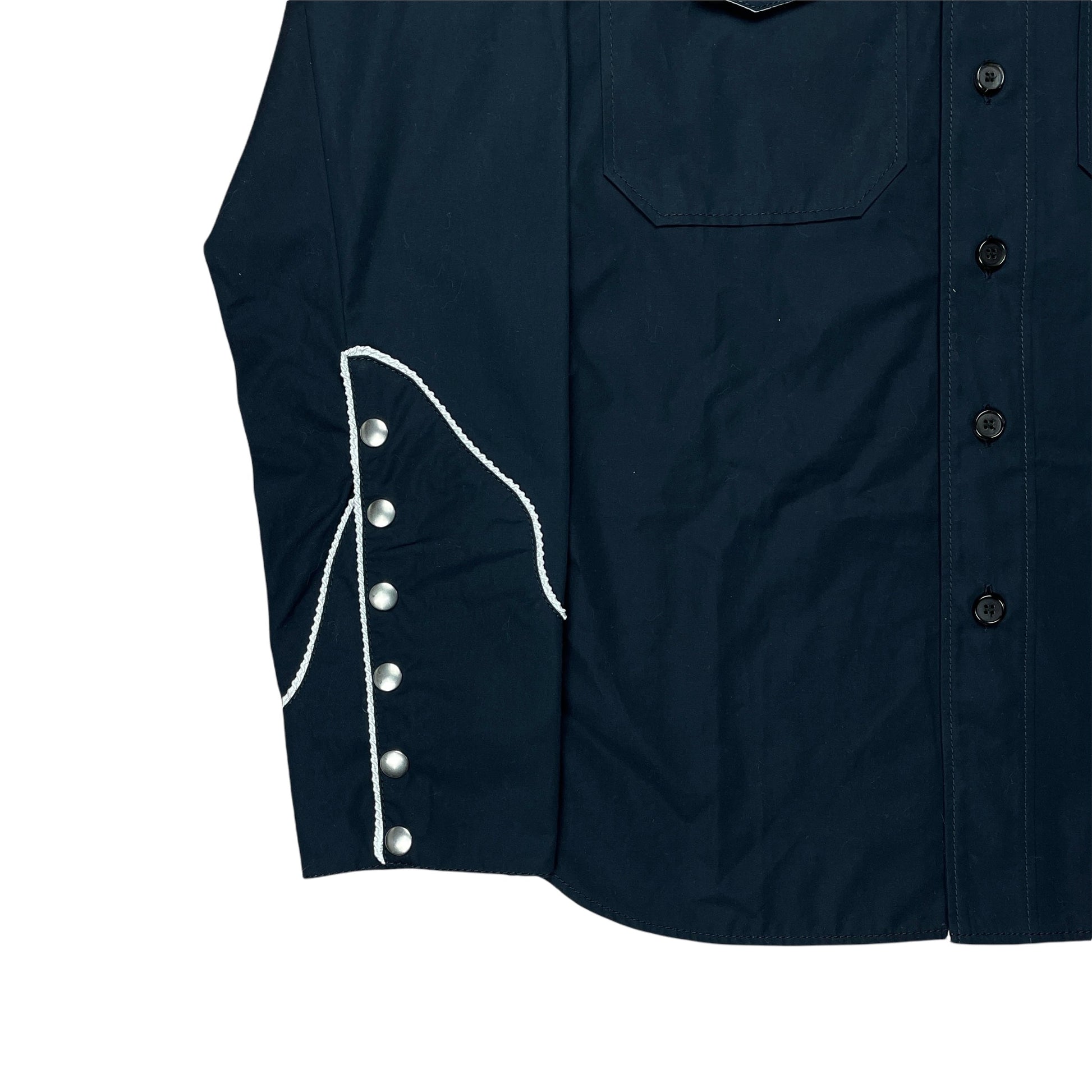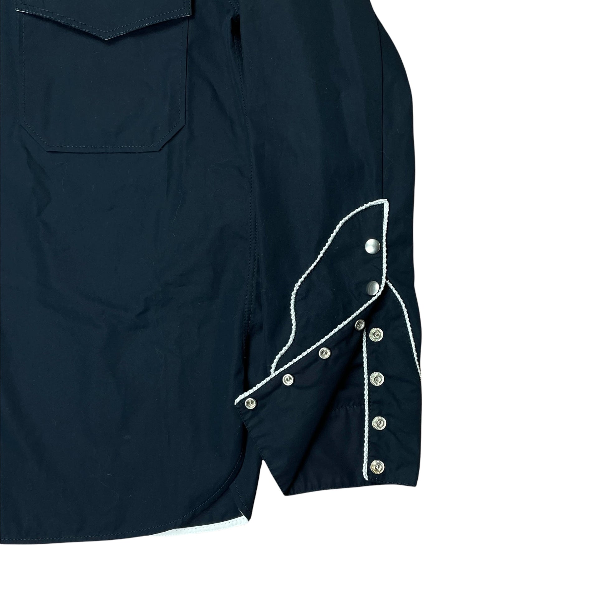 Dark navy cotton shirt from Raf Simons at CK. Iconic piece from the cancelled cooperation. Western inspired flap pockets at the chest. White contrast piping details at both sleeves. Features silver snap buttons which make a great detail and can be used adjust the sleeve width. Retailed for around 700€.