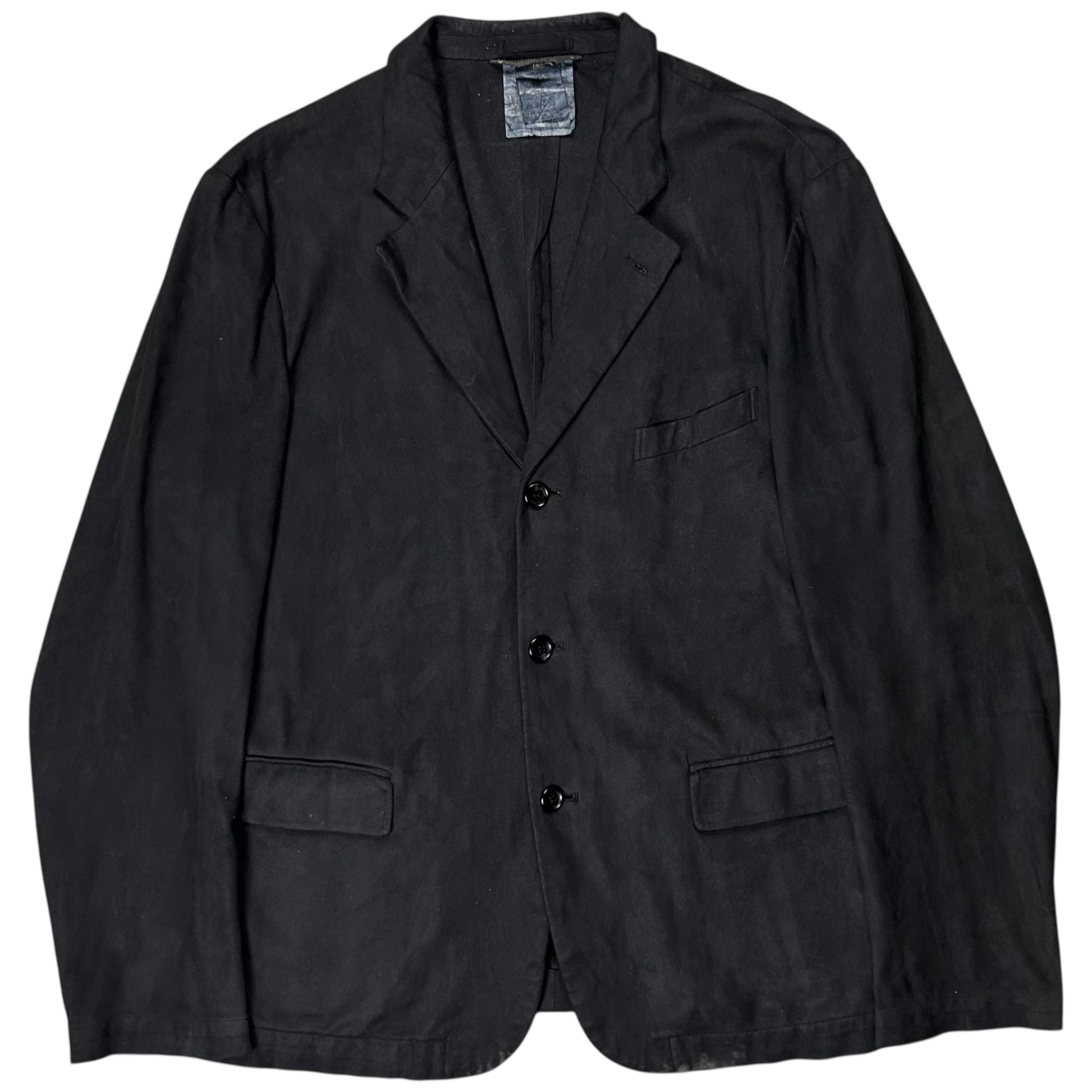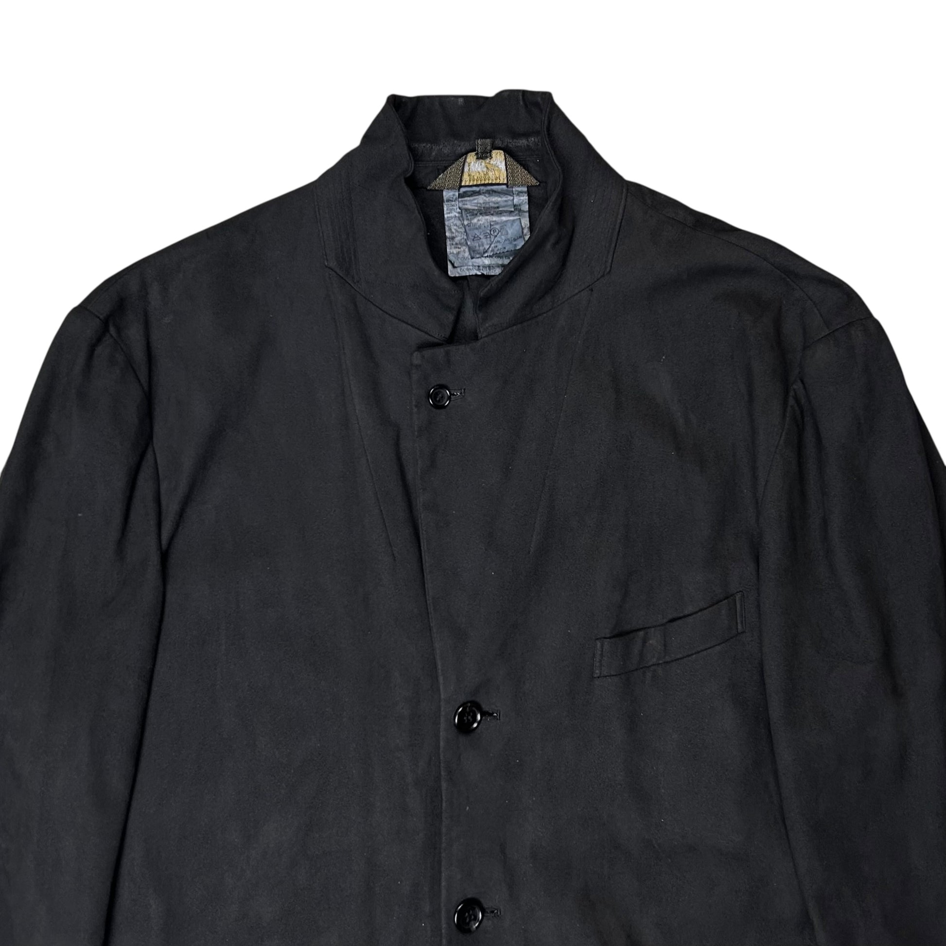 Blazer jacket from the Spring Summer 1999 collection of the Comme des Garcons menswear mainline CDGH+. Interesting treatment consisting of coating and an over-dye creating waxed suede leather like texture. Tonal buttoning allowing to turn the lapel collar into a stand collar. Made from an interesting dark grey nylon and polyurethane blend. Relaxed cut.