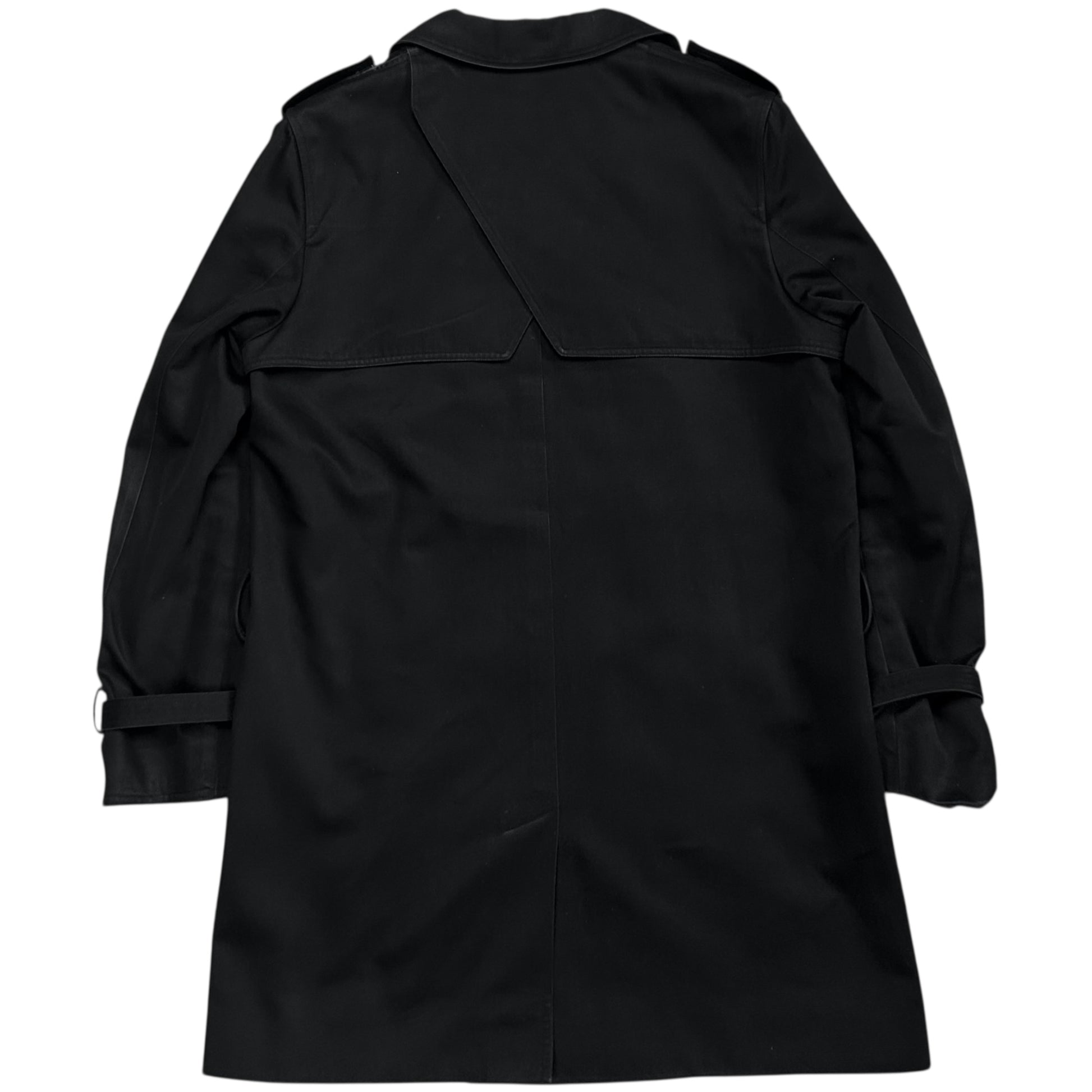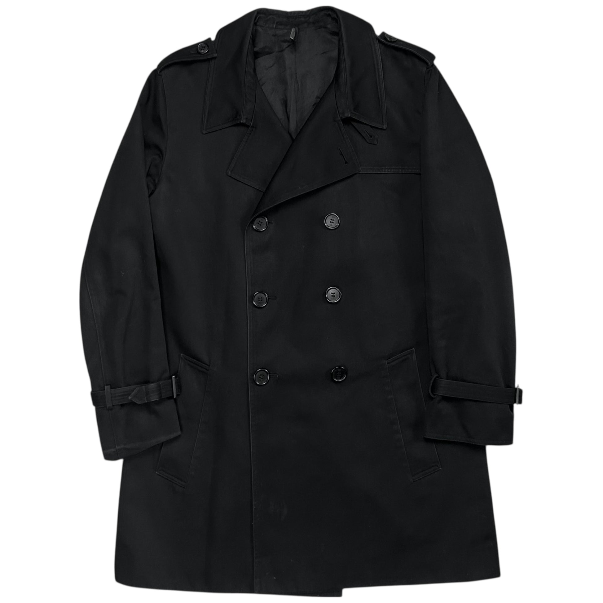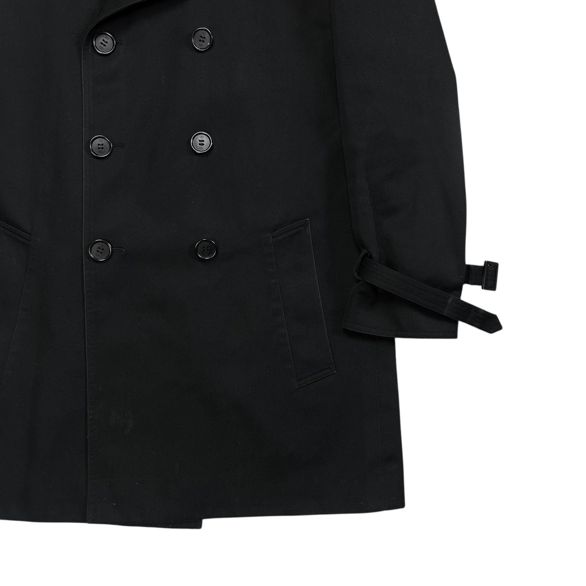 Mid length coat from the Dior Homme Spring Summer 2006 collection which was designed by Hedi Slimane. Chest layer at the front and back that is attached with button and a diagonal layered back panel. Classic double breasted with tonal button closure. Military inspired shoulder straps. Made from a black lightweight polyethylene and cotton fabric. Regular cut.