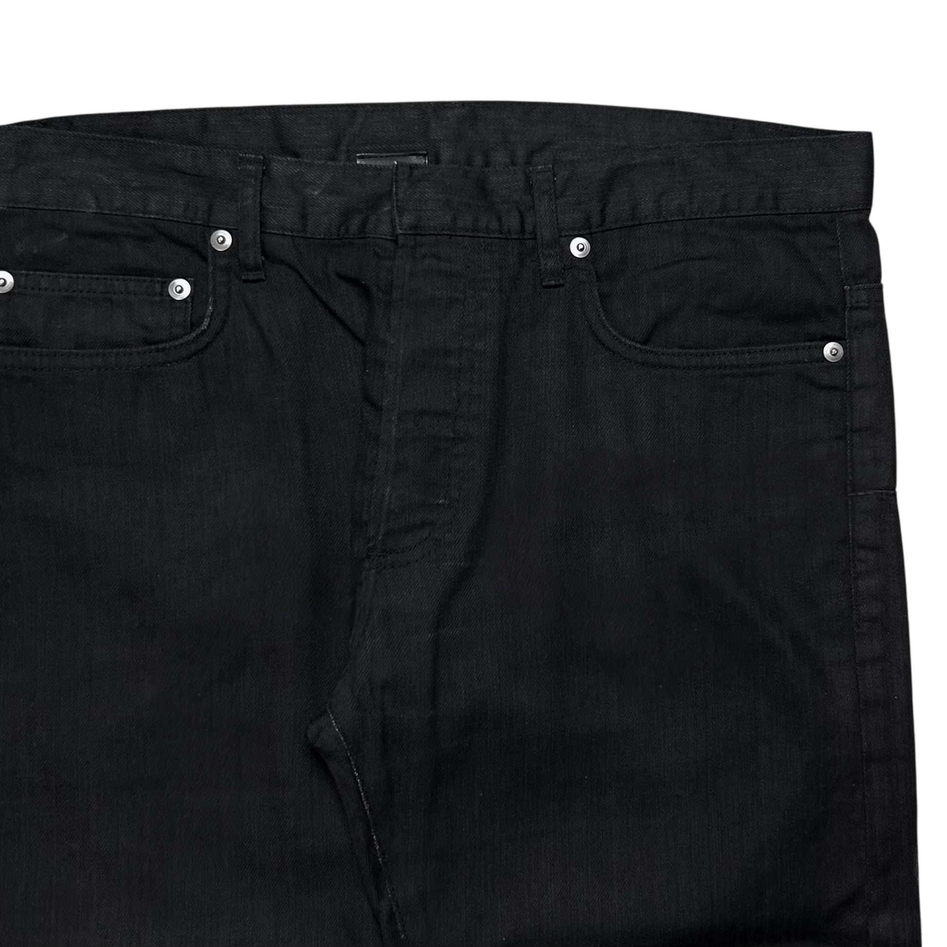 Denim pants from the Dior Homme Spring Summer 2011 collection back when Kris Van Assche was creative director. Silver eyelet hardware details at the waist. Signature silver branded hardware detail at the belt loop. Concealed silver button and hoo closure. Made from a thin and lightweight coated cotton material with a subtle waxed like texture in a deep black. Slim cut.
