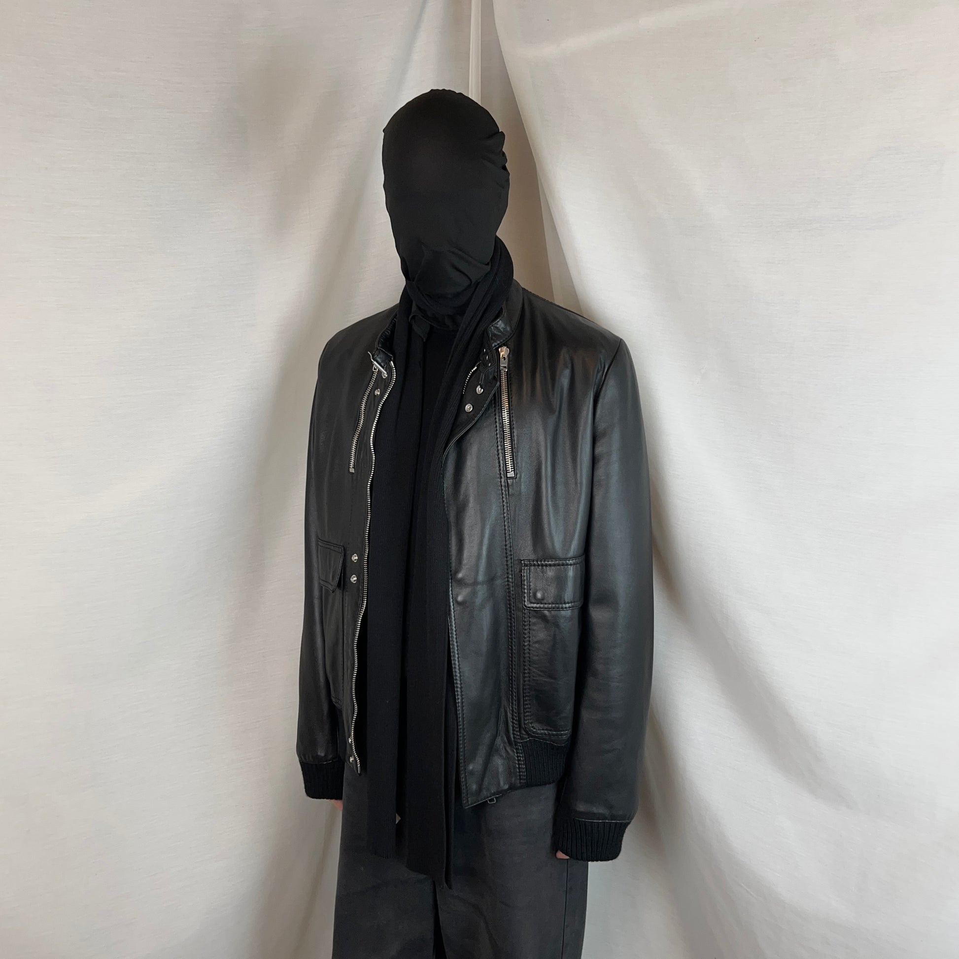 Flight jacket from the Dior Homme Fall Winter 2007 collection when Hedi Slimane was creative director. Belted collar with a silver buckle closure. Heavy Lampo zip closure at the front with additional snap buttons at the flap. Further zippers at the collar. Flap pocket at the lower front that can be closed with press studs. Made from a smooth genuine leather with wool ribbing. Boxy cut.