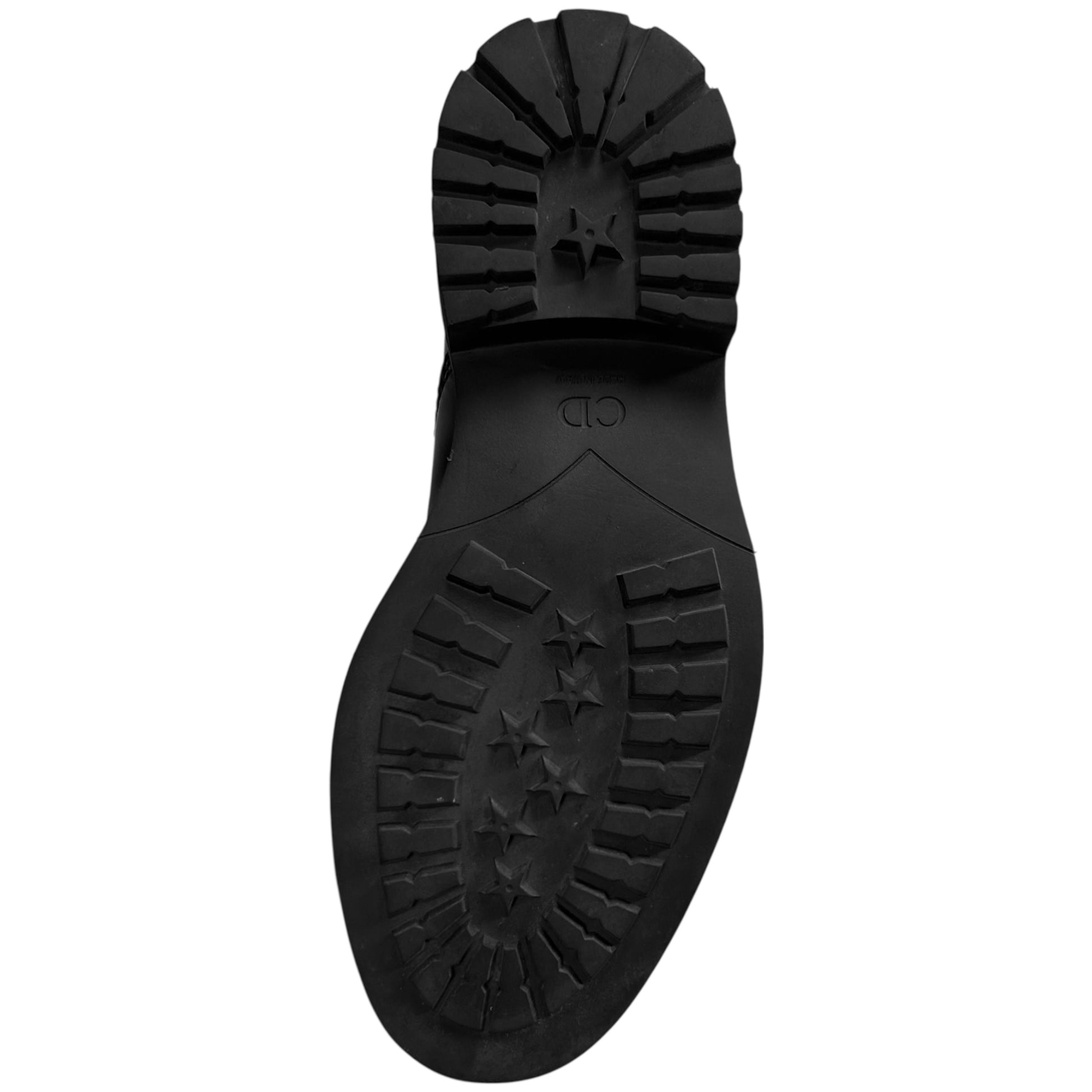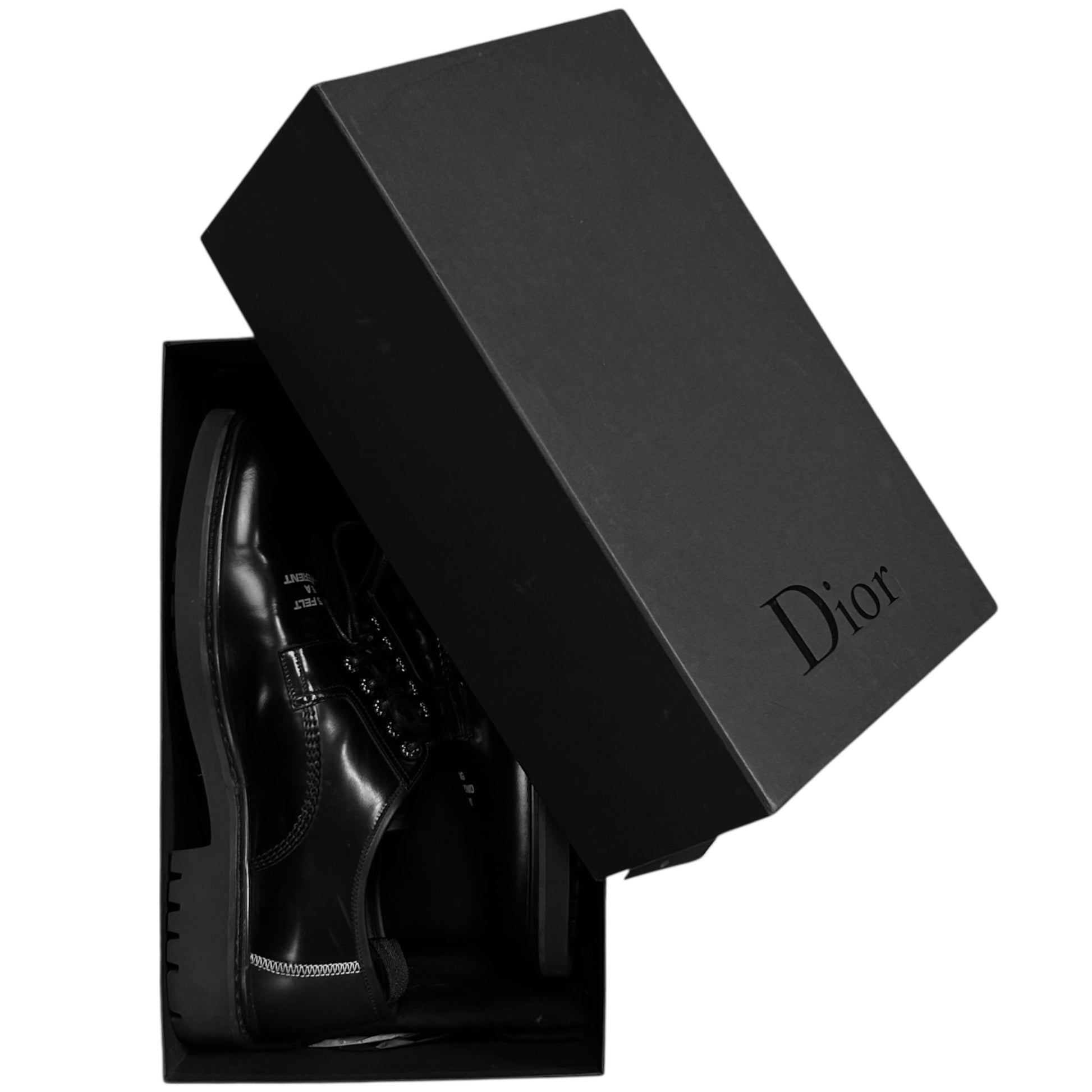 Derby shoes from the Dior Homme Spring Summer 2018 collection which was one of the last Kris Van Assche collections at the brand. Unique contrasting debossed print saying We Always Felt We Were A Little Different, Standing In The Crowd One Night. Tonal lacing with wheel shaped silver eyelet hardware. White contrast stitch decoration at the back. Rounded toe box with a rubber lug sole. Made from a polished black leather.