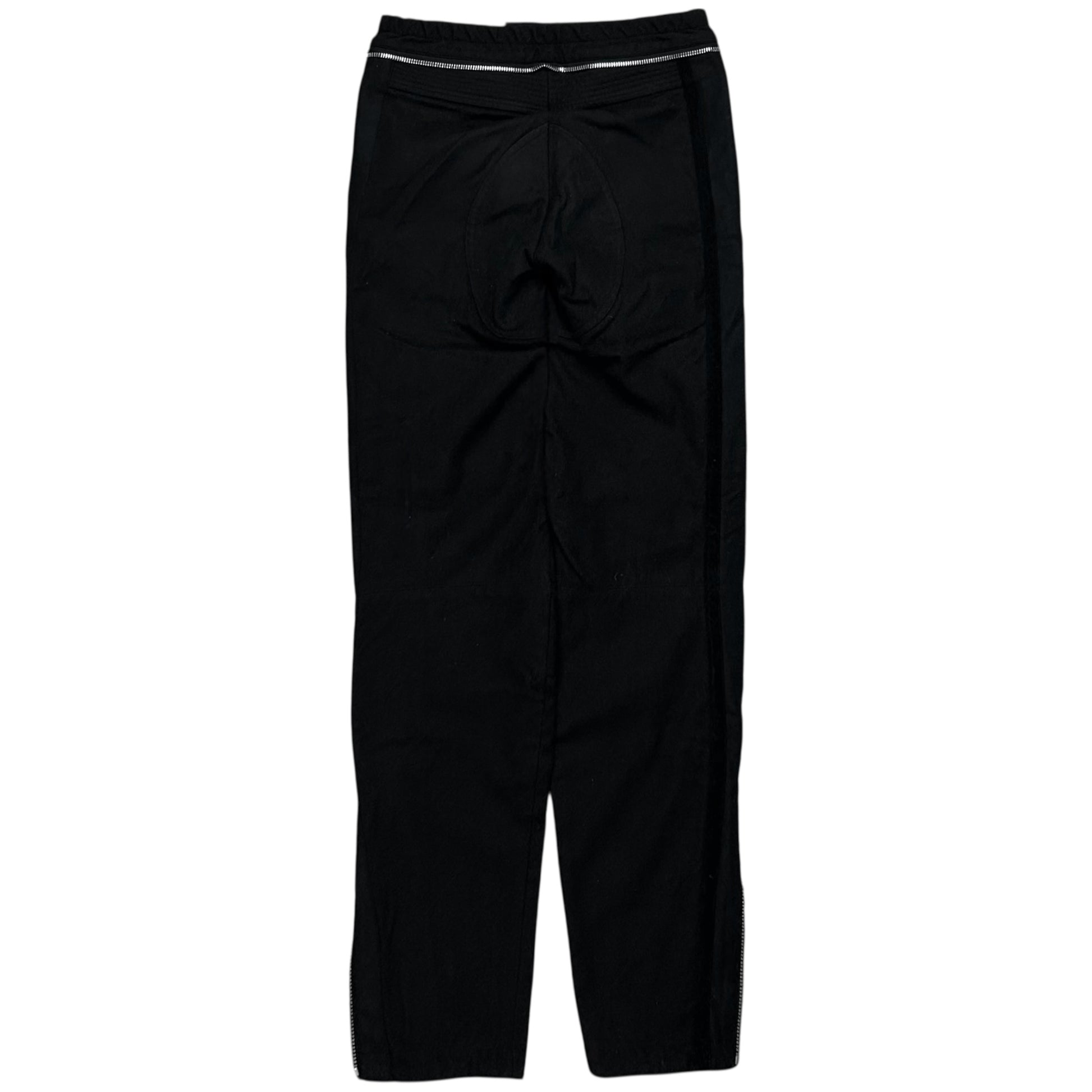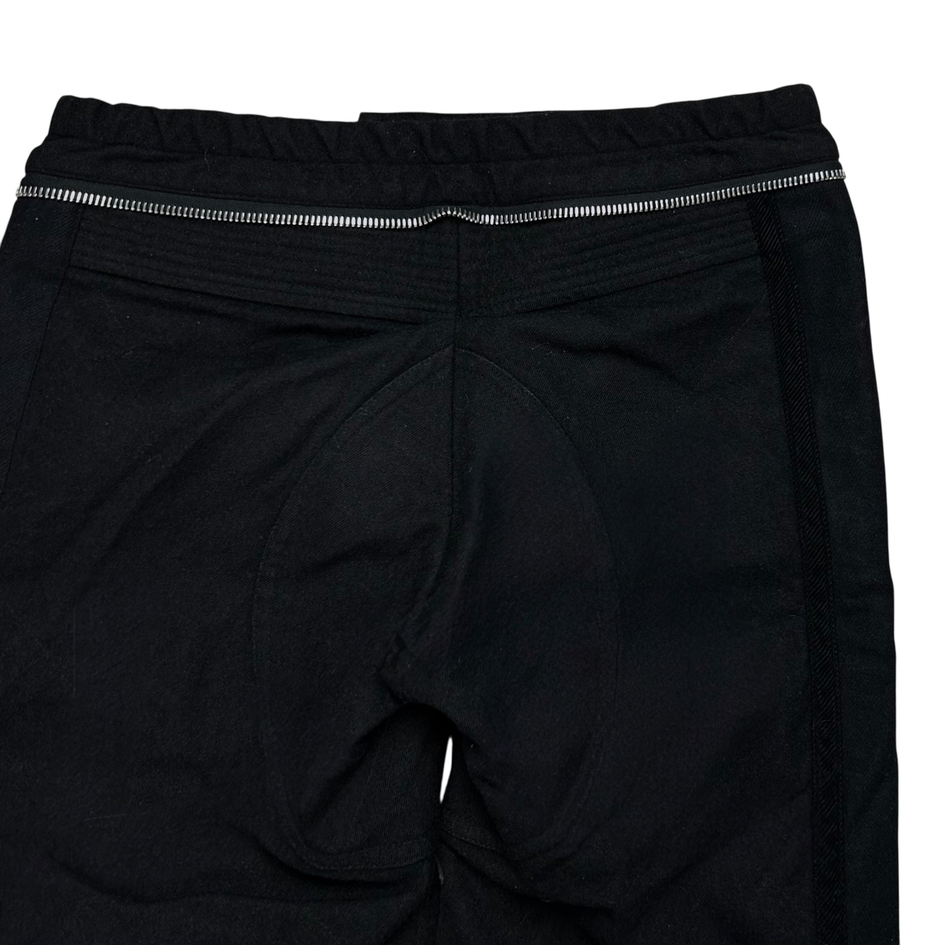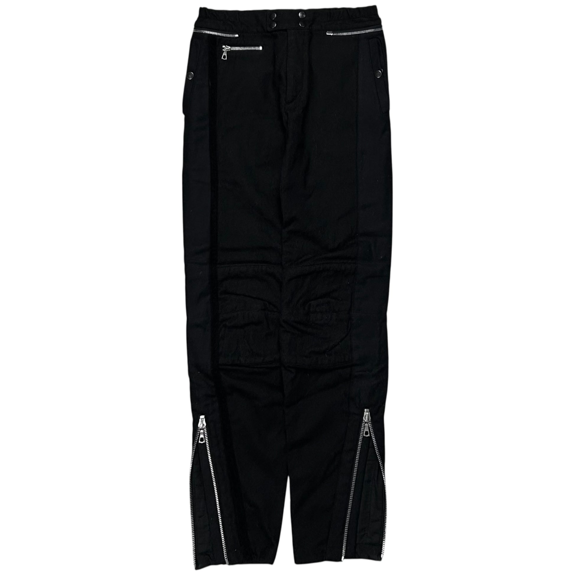 Biker trousers from the Fall Winter 2014 collection. Ankle zips that can be opened for a flared silhouette. Silver zipper hardware going around the waist with further zippers at the front and back waist pockets. Tonal press stud closure at the fly. Quilted reinforced biker knee construction. Made from a black brushed wool and cotton blend. Slim cut.
