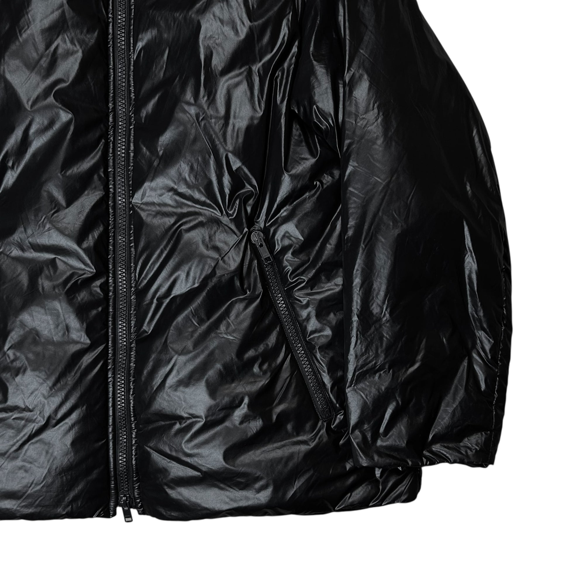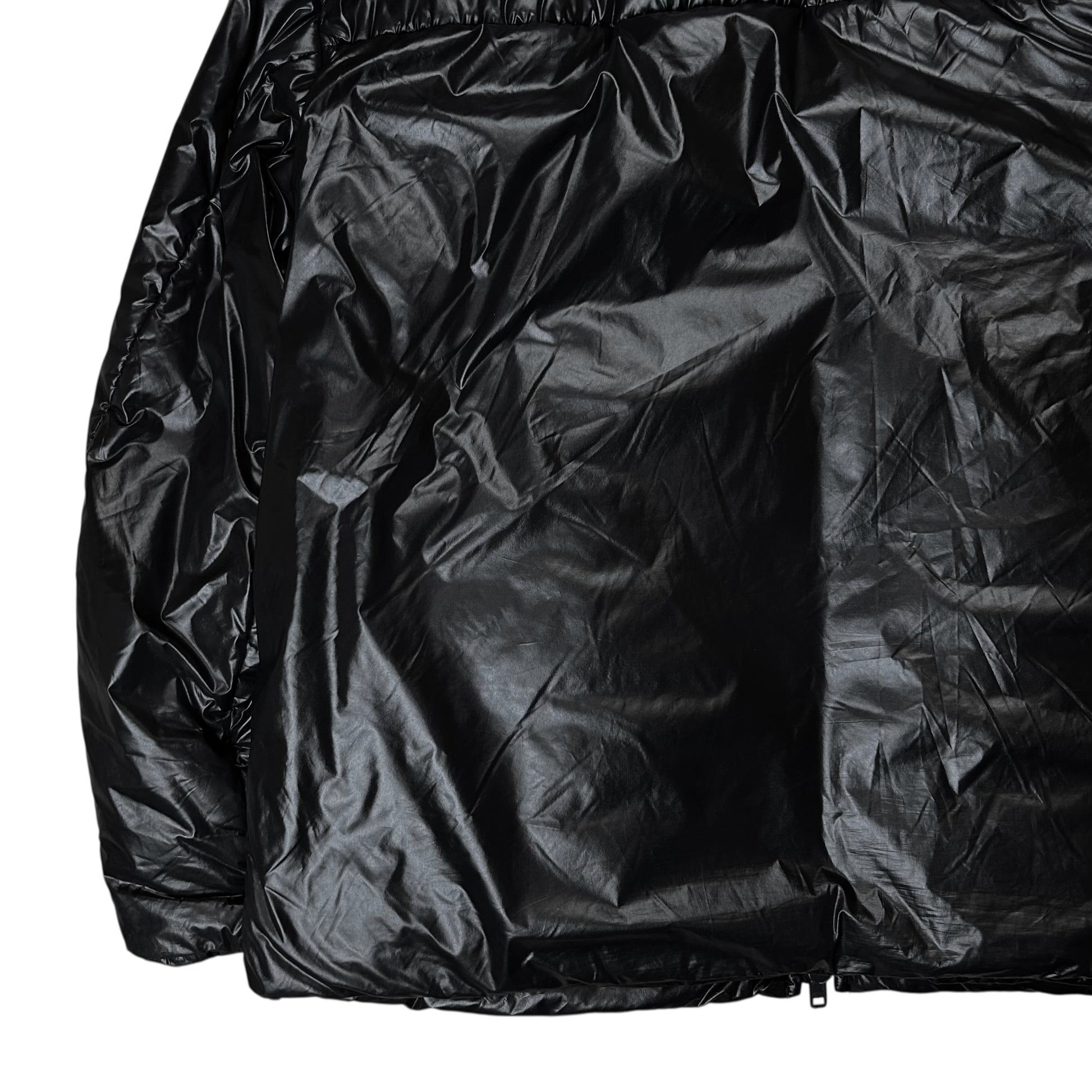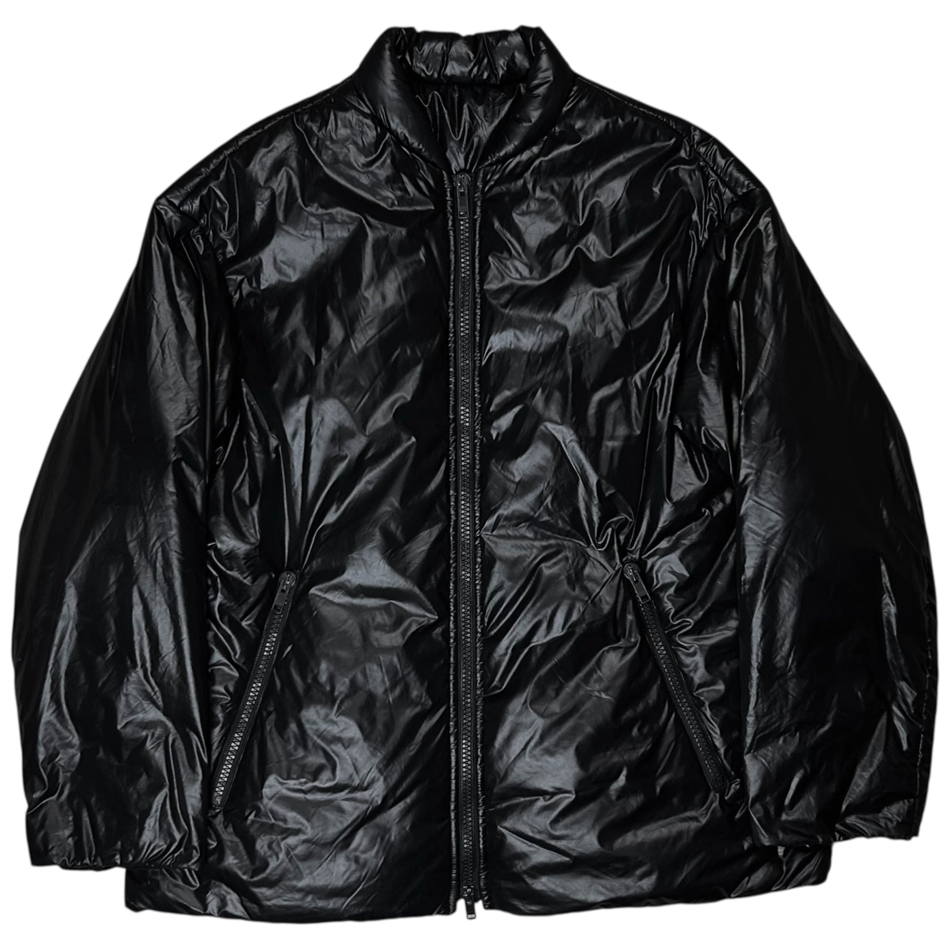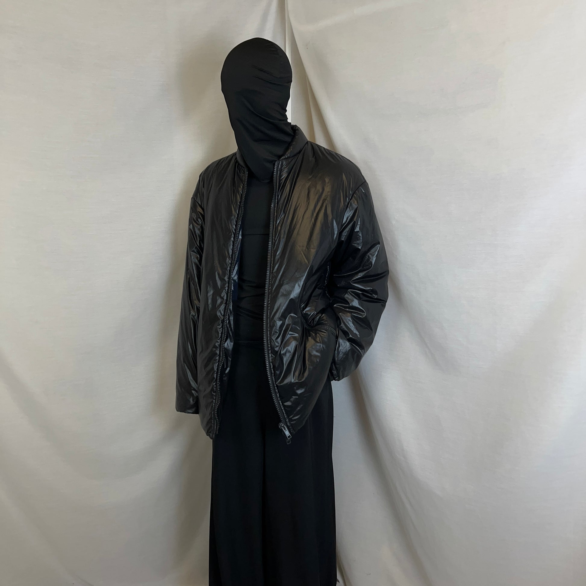 Puffer jacket from the Dries Van Noten Fall Winter 2021 collection. Reversible construction with plain black side and an inner side with a blue stripe along the center. Two way black zip r at the front with a padded standing collar. Made from glossy black polyamide blend. Oversized and slouchy cut. Retailed for around 800€.