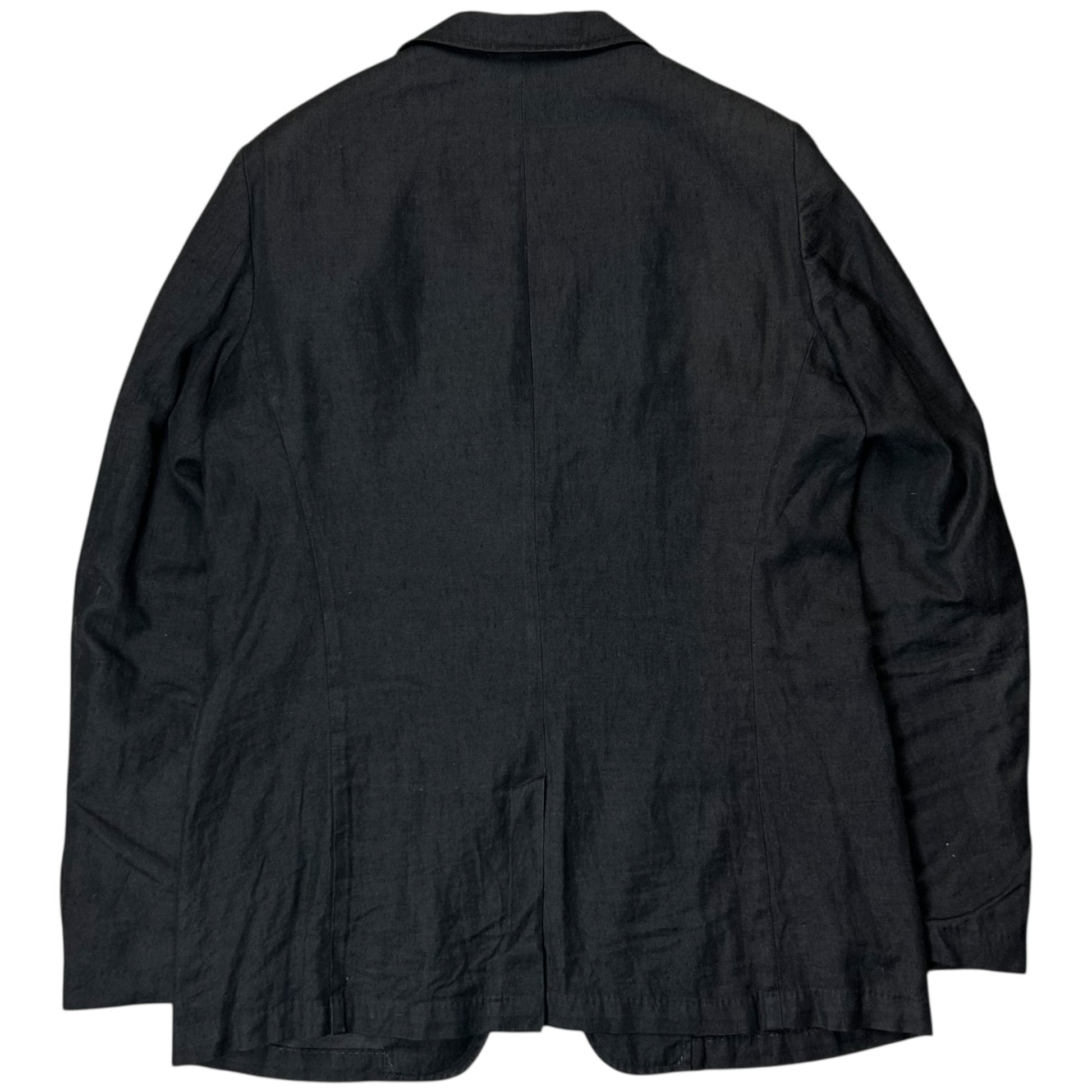Blazer jacket from Dries Van Noten. Double tonal button closure with a notched peak lapel collar. Classic construction with a slid chest pocket, lower flap pockets and buttoning at the sleeves. Made from a dark grey linen cotton blend. Relaxed cut.