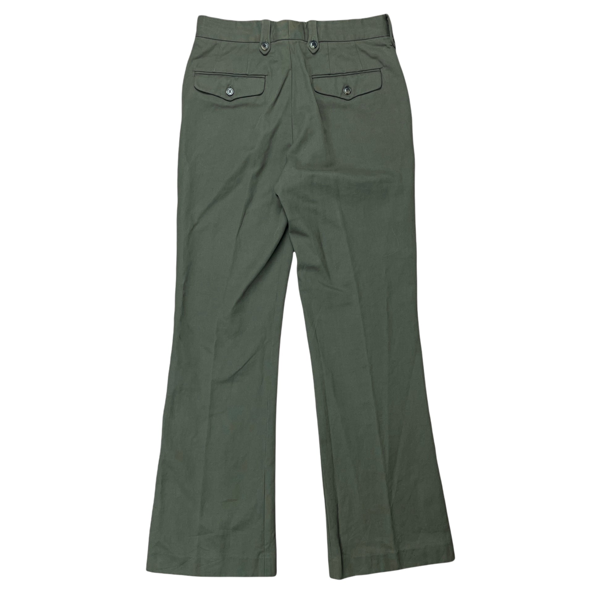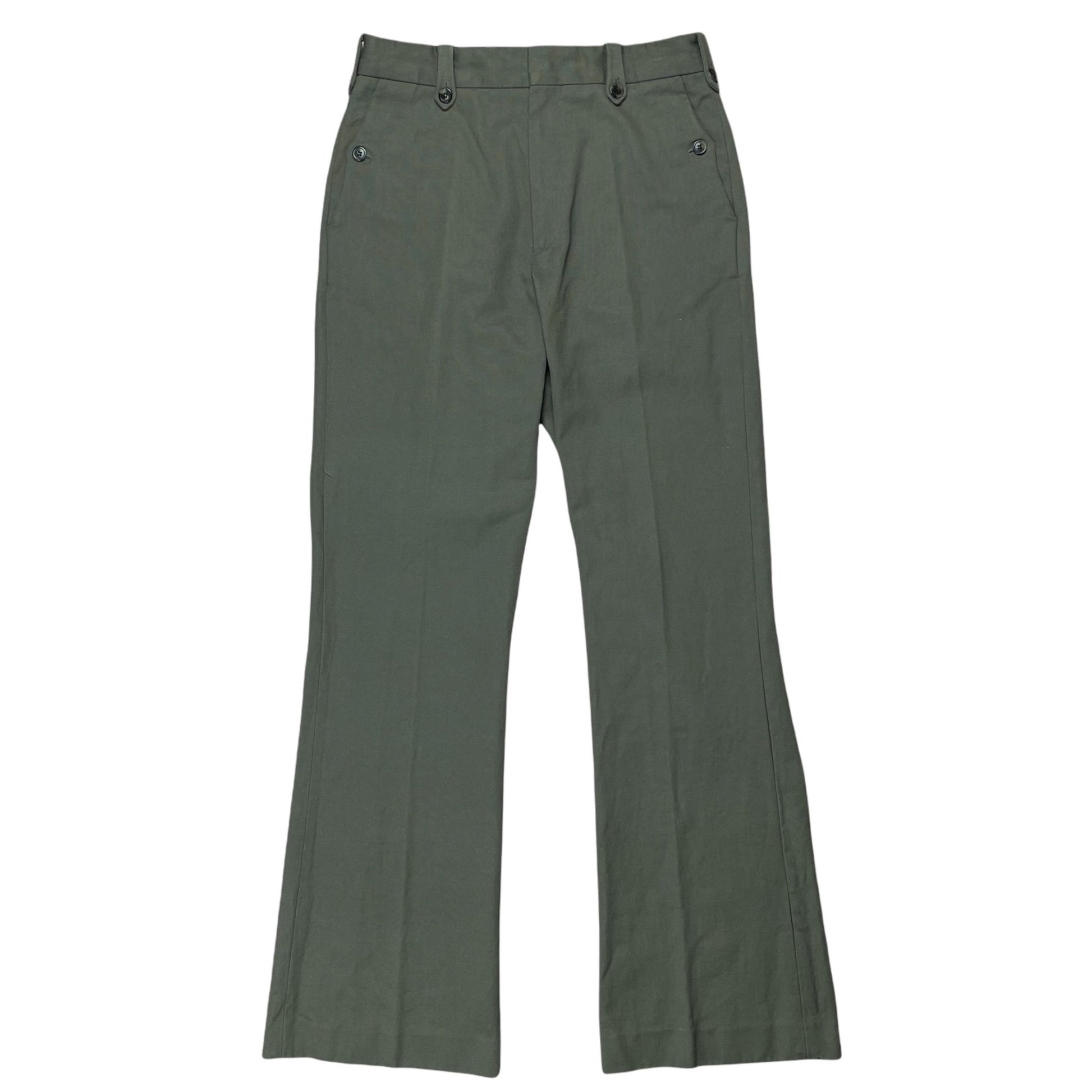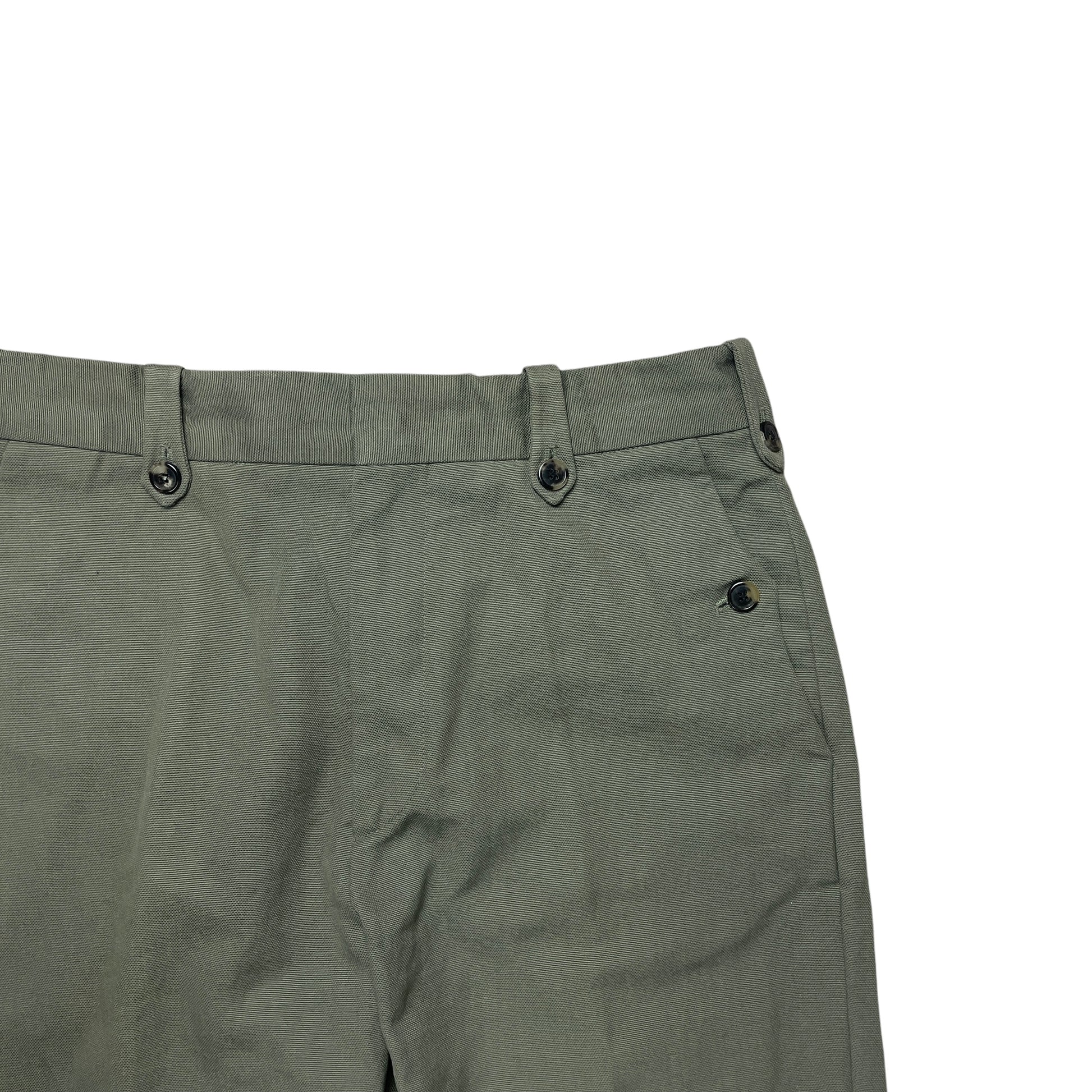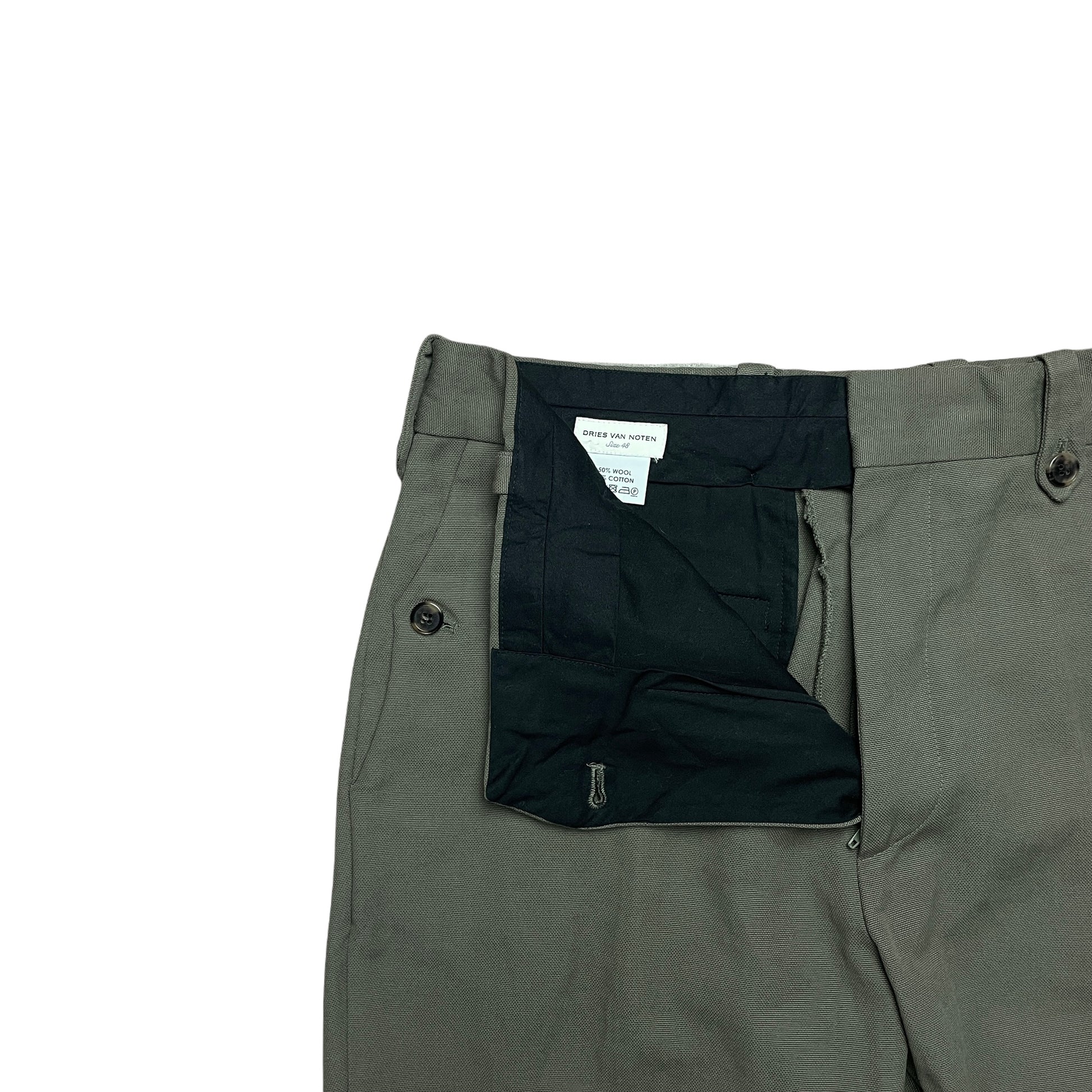 Olive wool cotton blend pants from Dries. Button details at the belt loops which allows them to be detached. Additional buttons at the pockets. High quality material. Amazing straight cut fit with a slight flare. Purchased at the Antwerp sample sale.