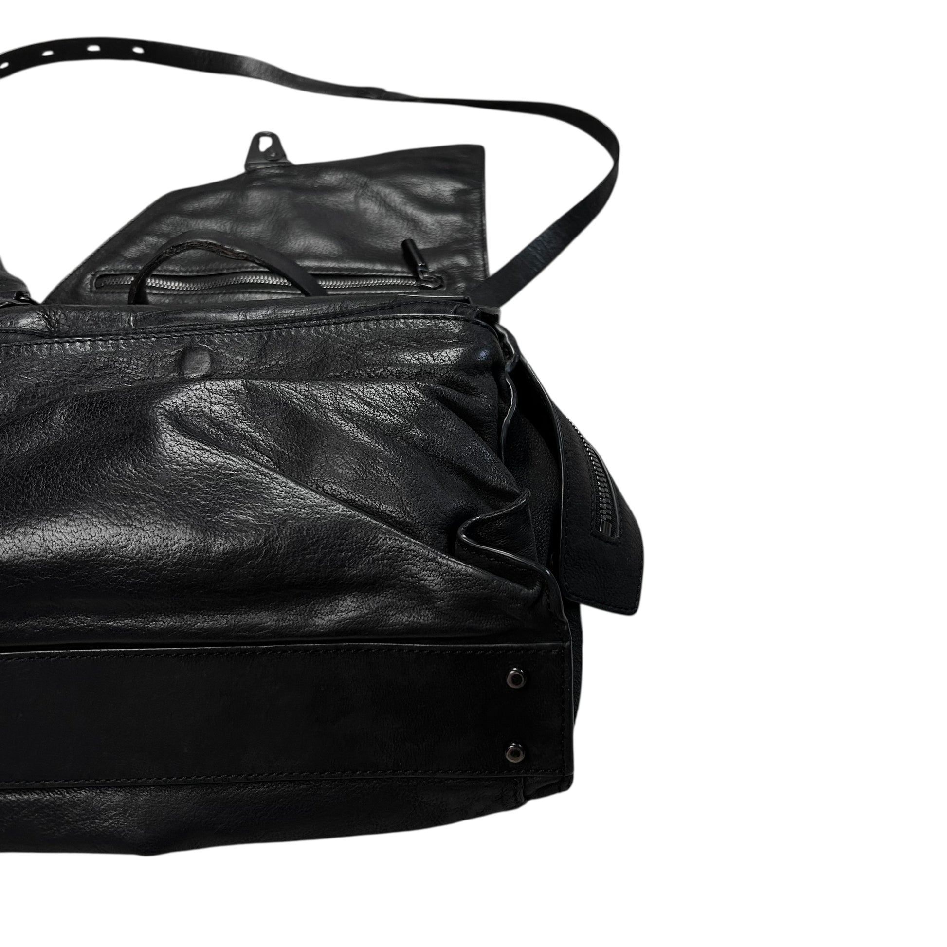 Leather cross body messenger bag from Helmut Lang from the Mid 2010s when Alexandre Plokhov was creative director. Asymmetric flap with tonal carabiner hardware fastening. Multiple zippers with one extending one with multiple pocket departments. Made from genuine black grained leather.