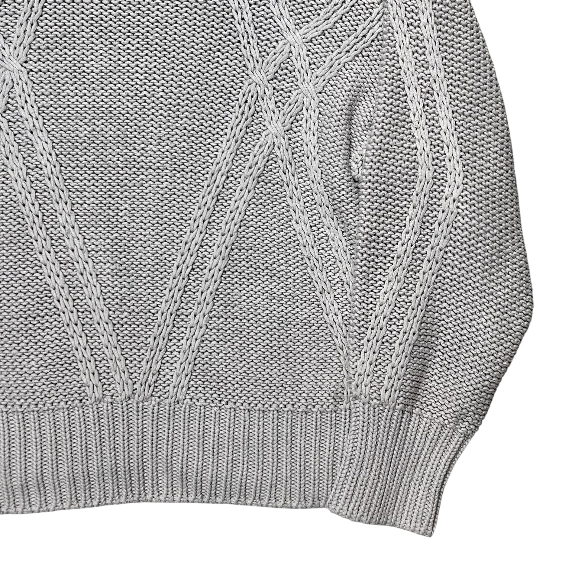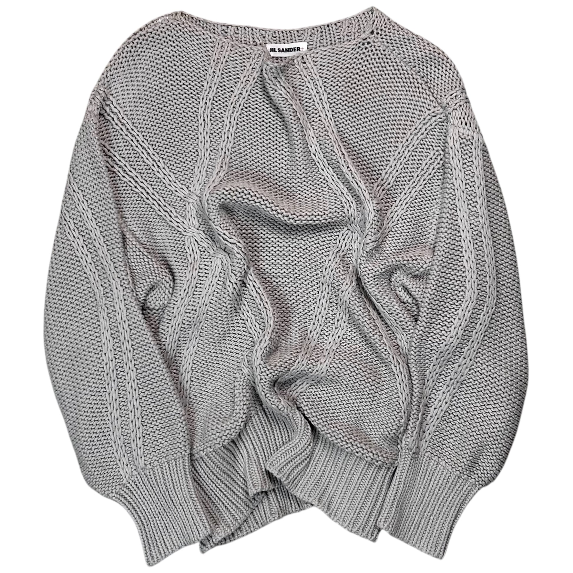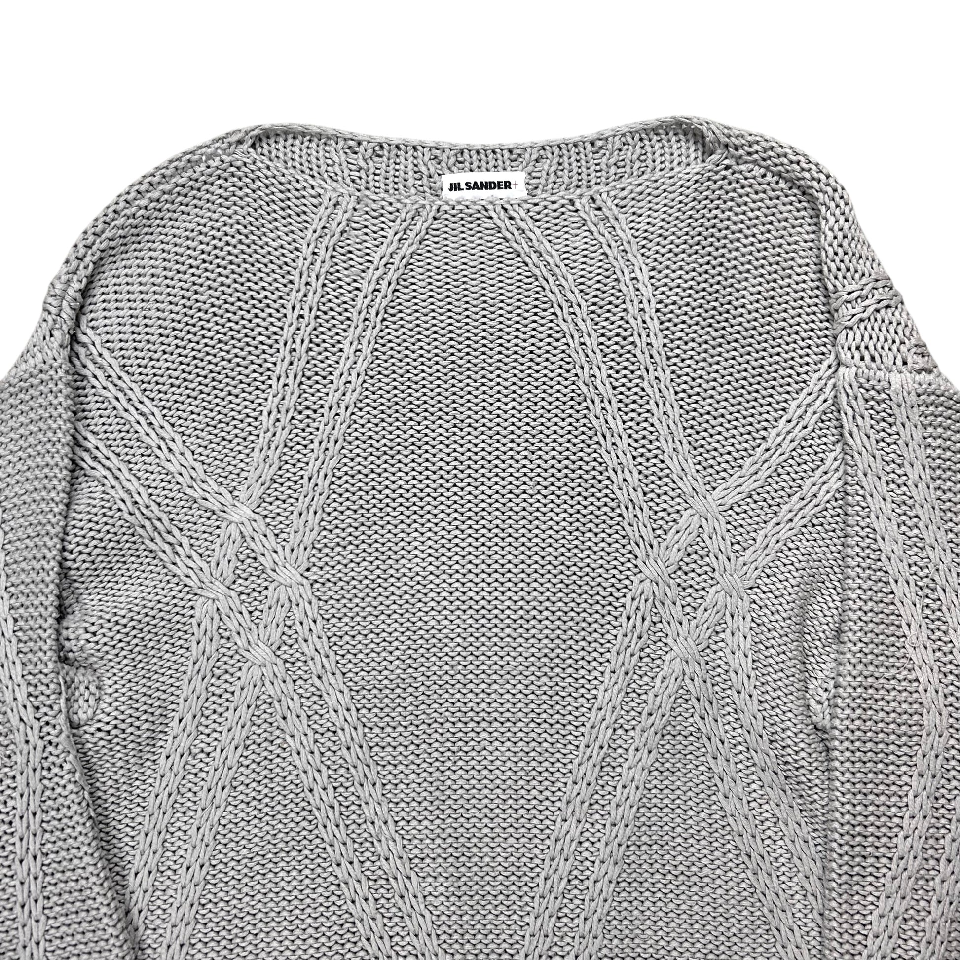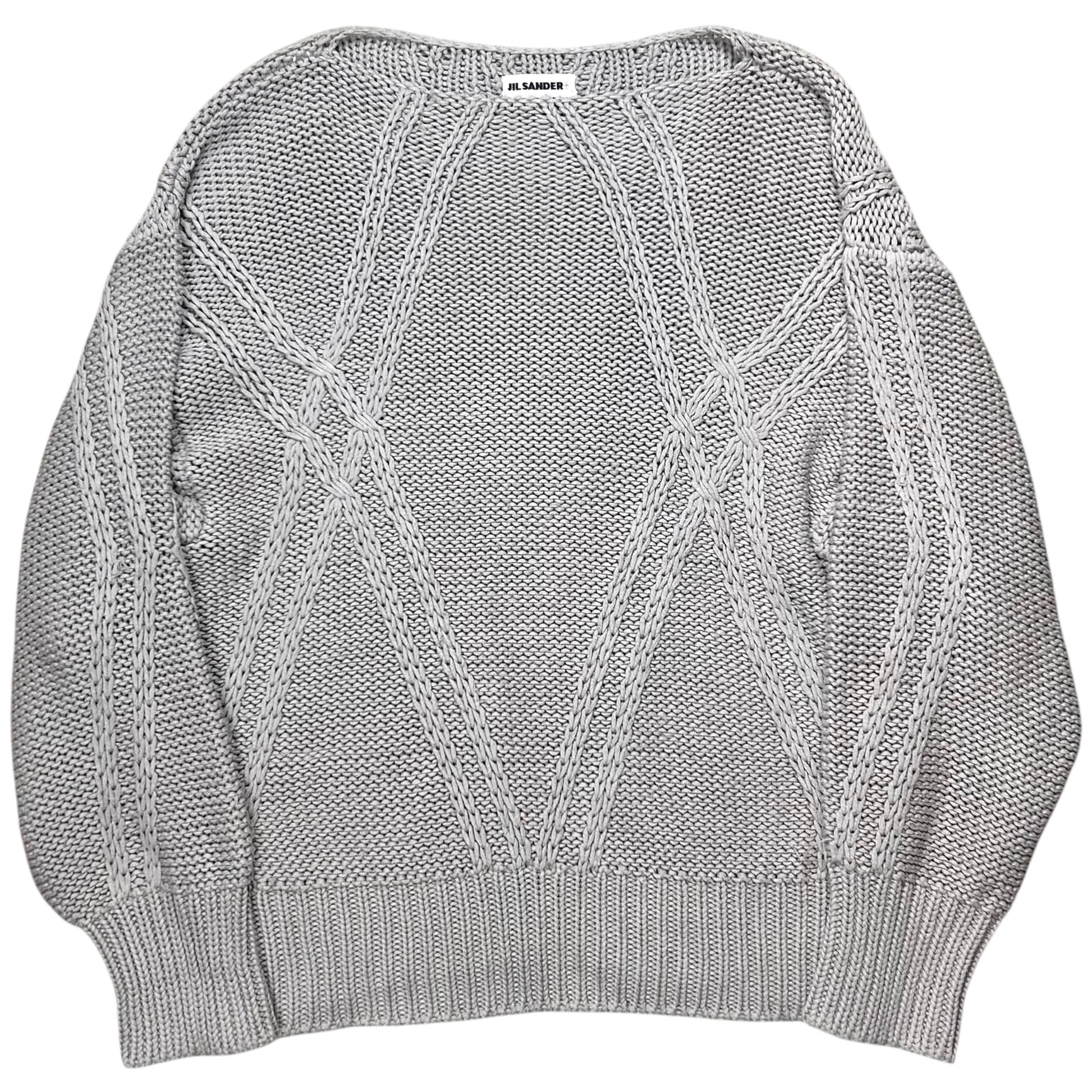 Heavy jumper from the 2000s of the Jil Sander+ line. Chunky structure with an abstract szmmetric cable knit texture in cross chain design. Collarless construction with a round neck and thick ribbing at the sleeves and waistband. Made from a muted grey cotton and acrylic blend. Boxy cut.
