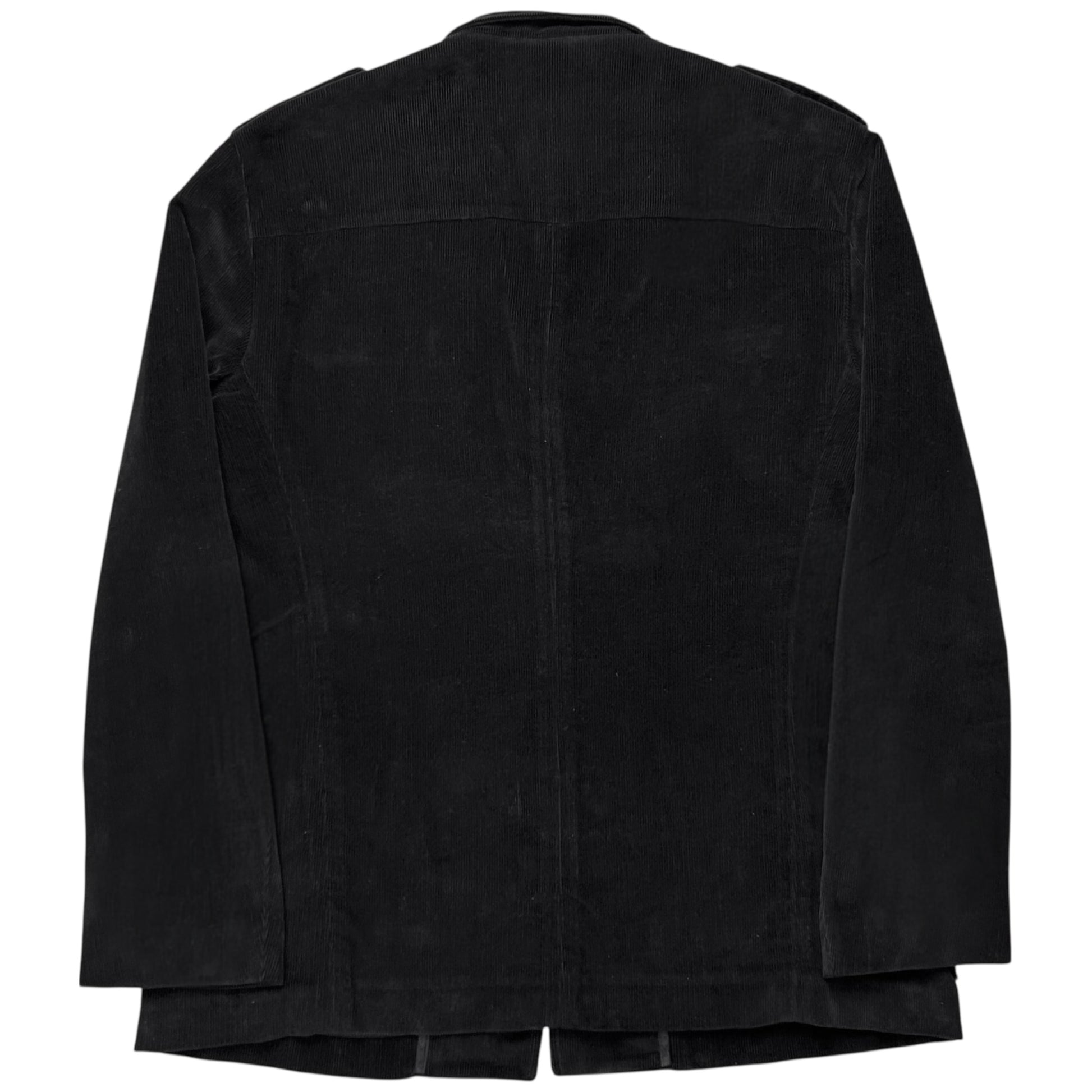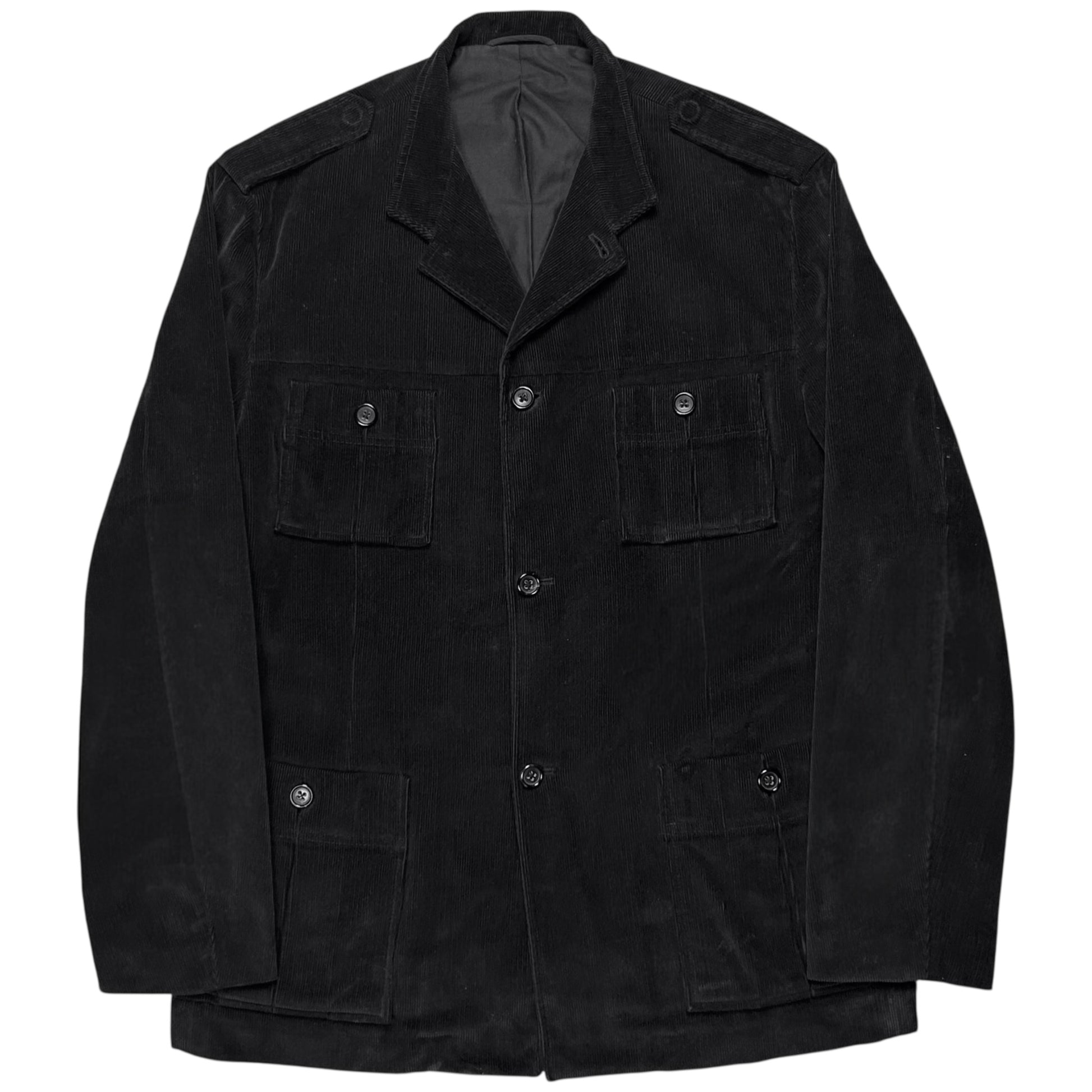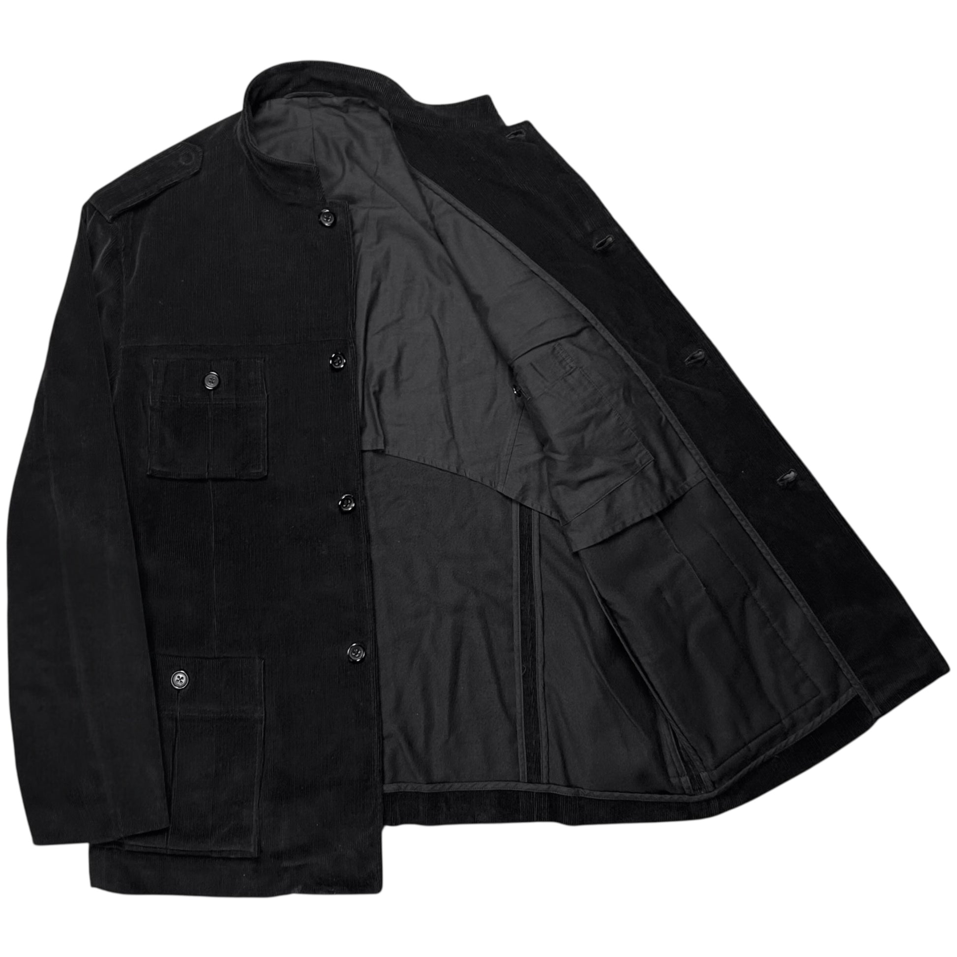 Military field jacket from the Jil Sander Fall Winter 2005 collection which was the final show of Jil Sander before her departure. Tonal buttons on the cargo front pockets as well as on the fromnt allowing to change the collar style. Epaulettes straps at both shoulders. Made from a cotton fabric dark grey that is almost black with a corduroy texture. Regular cut.