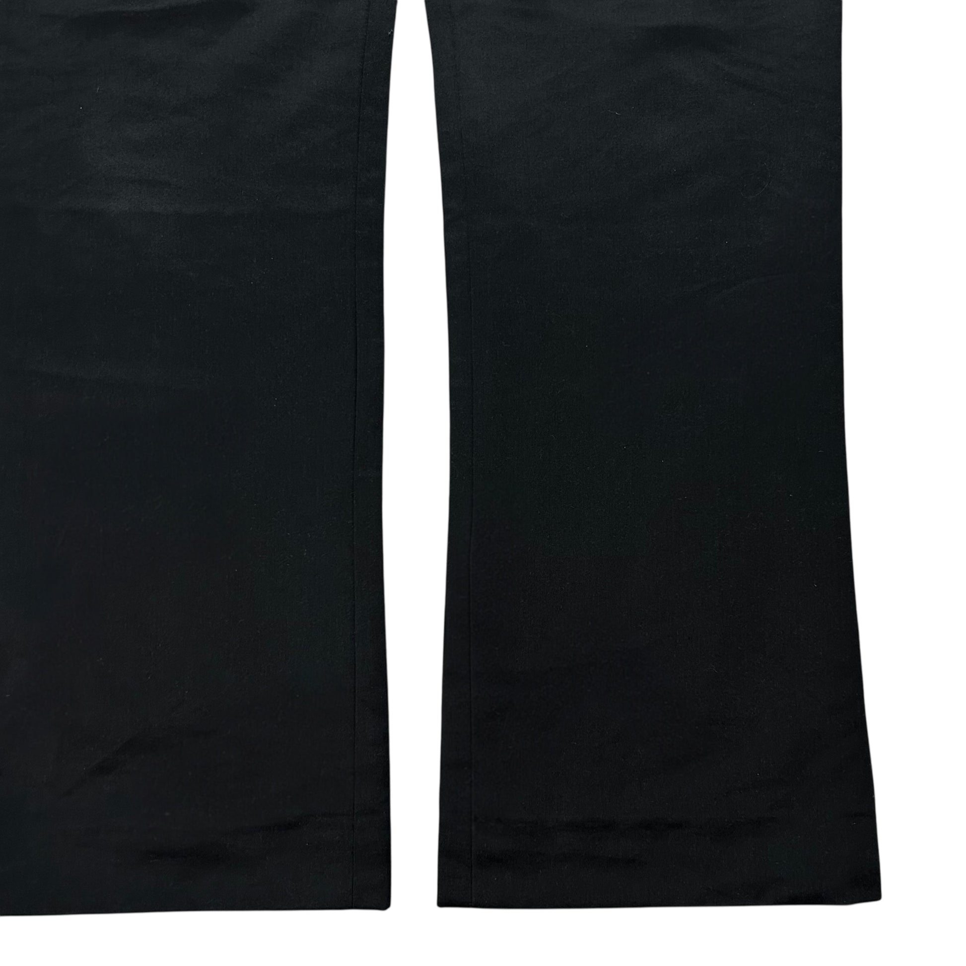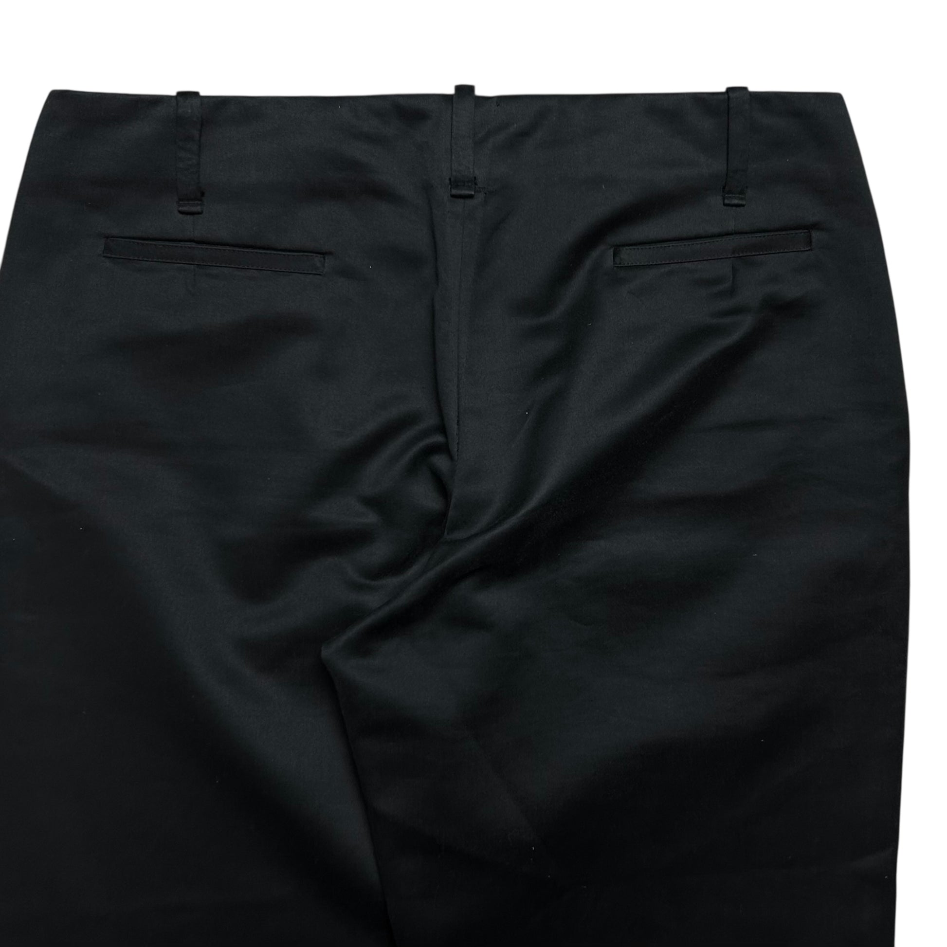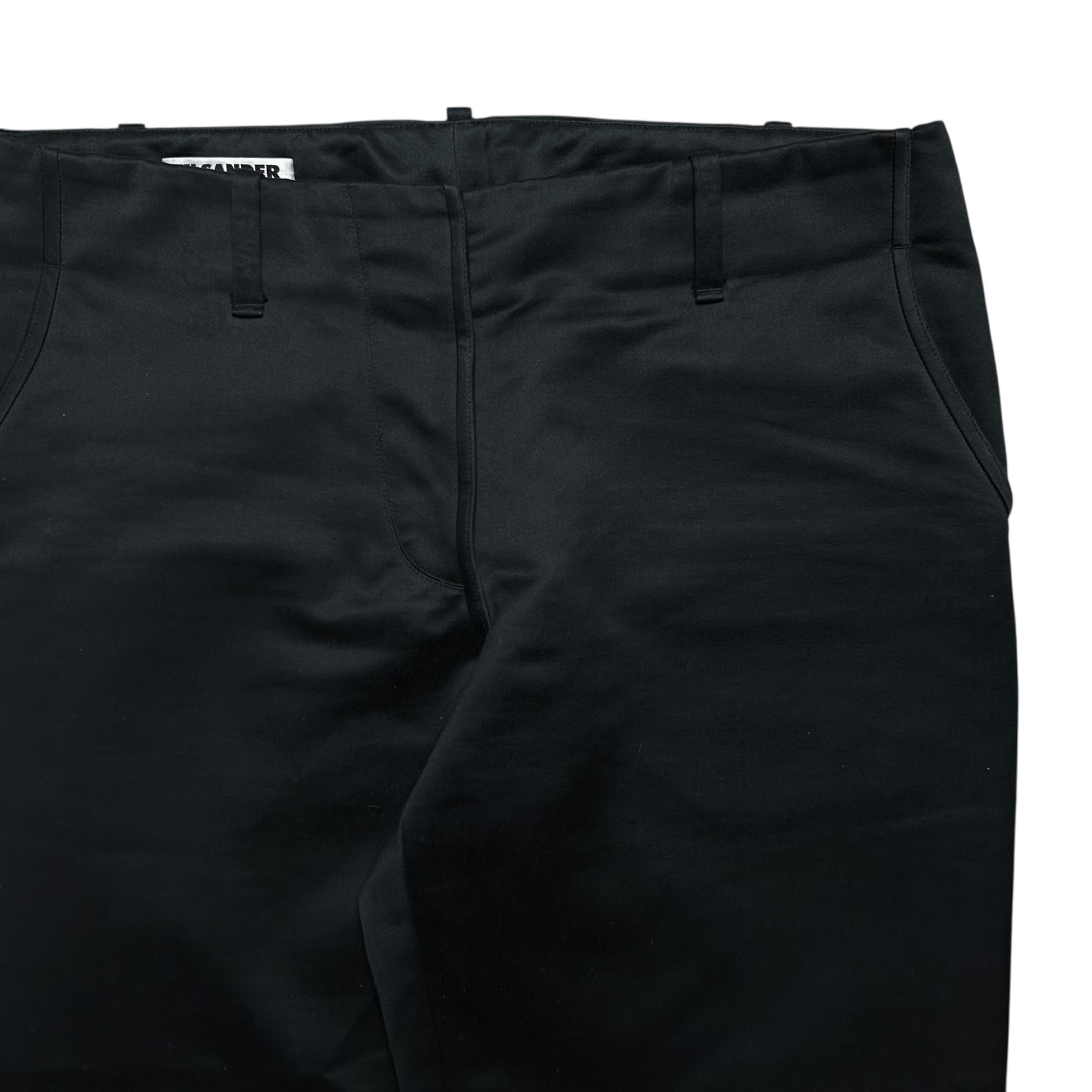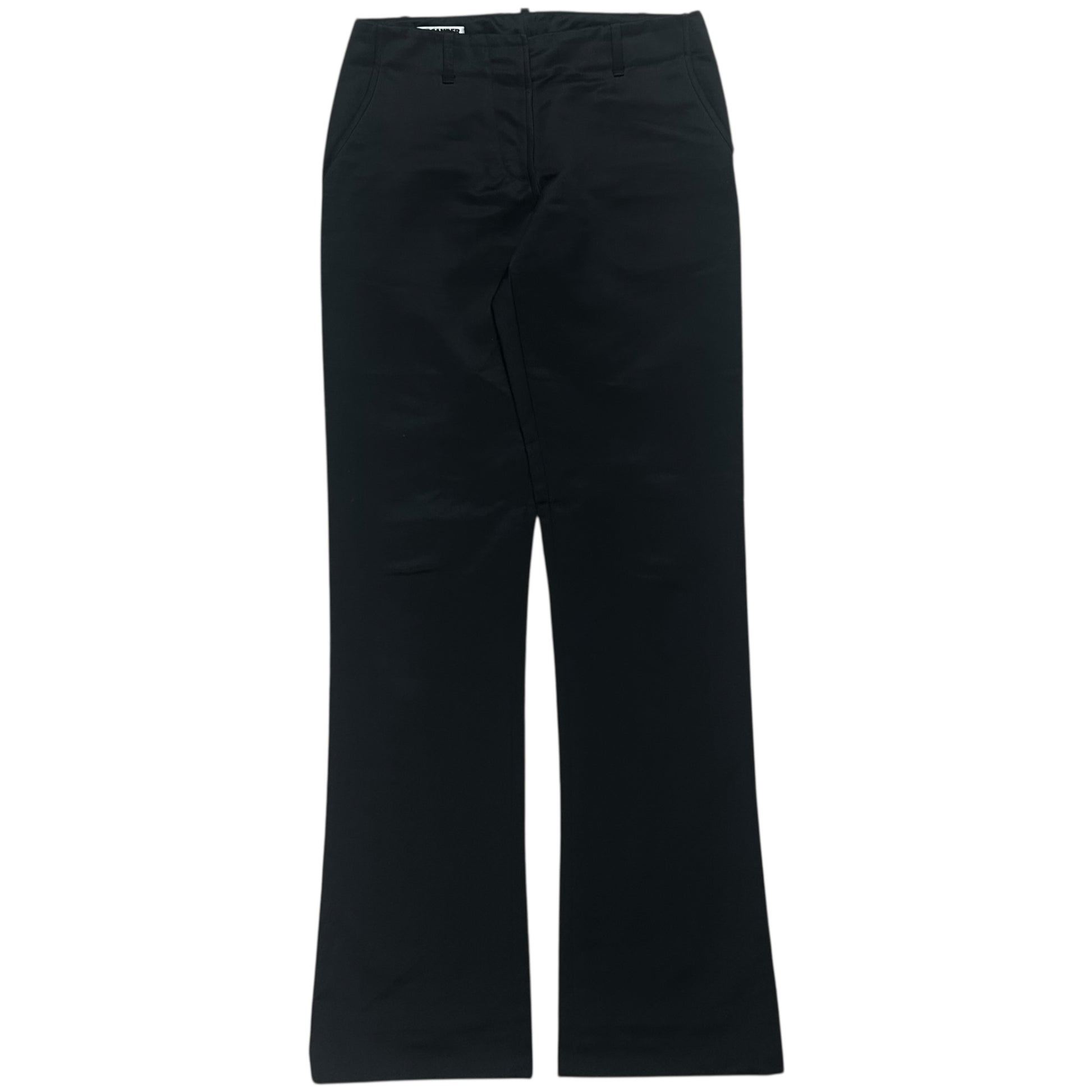 Casual trousers from the Jil Sander Raf Simons era. Classic construction with slid back pockets, interstingly trimmed front pockets and a silver Riri zip fly. Made from a heavycotton material in black with a slighly blue shiny finish. Straight cut with a flare.