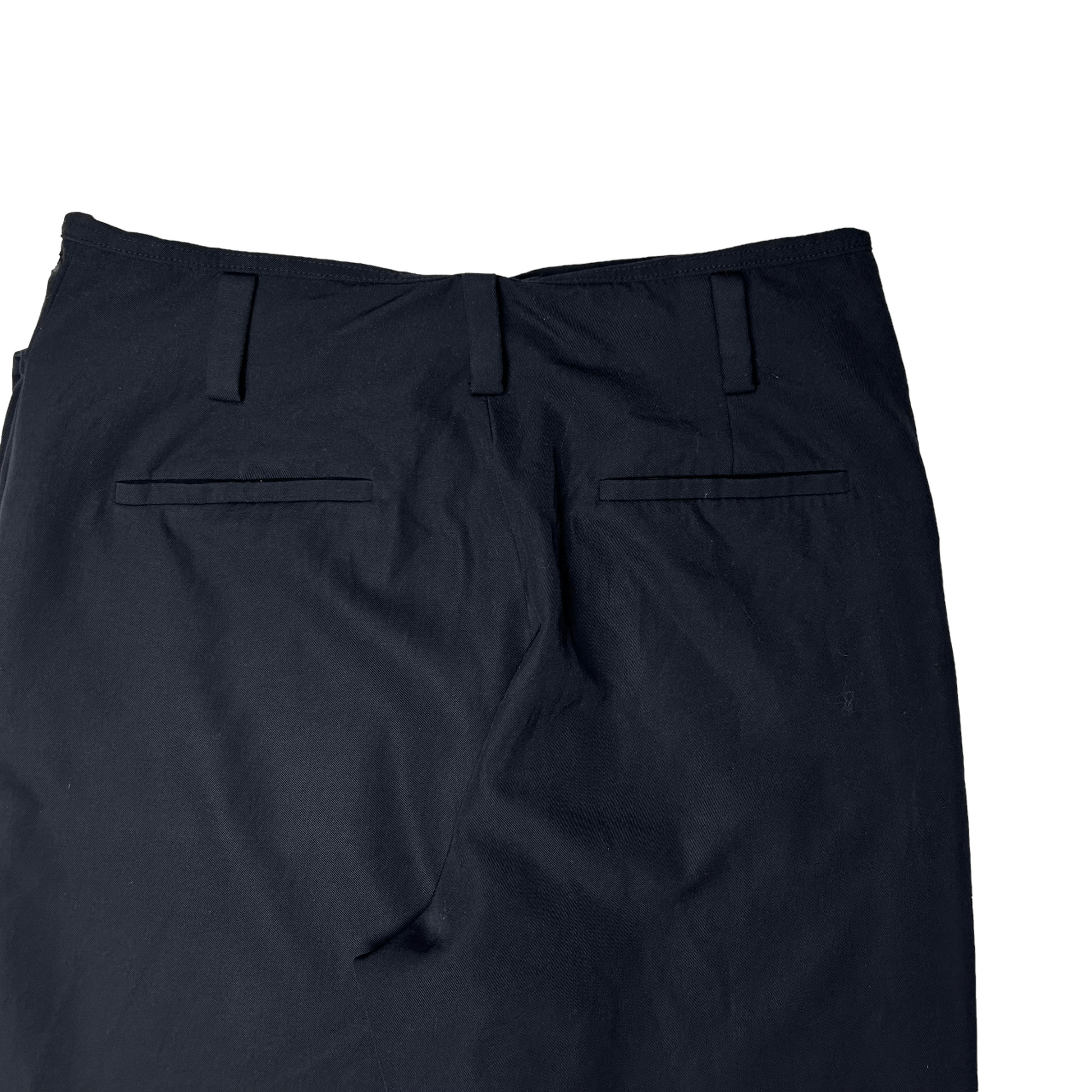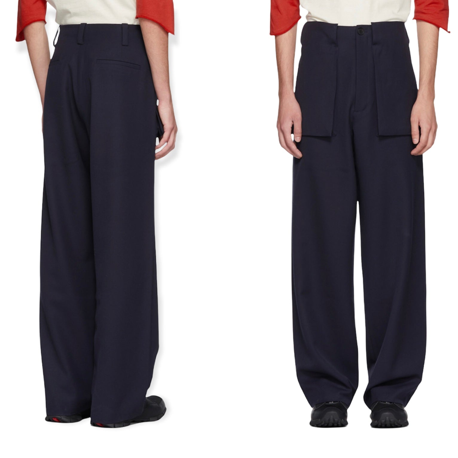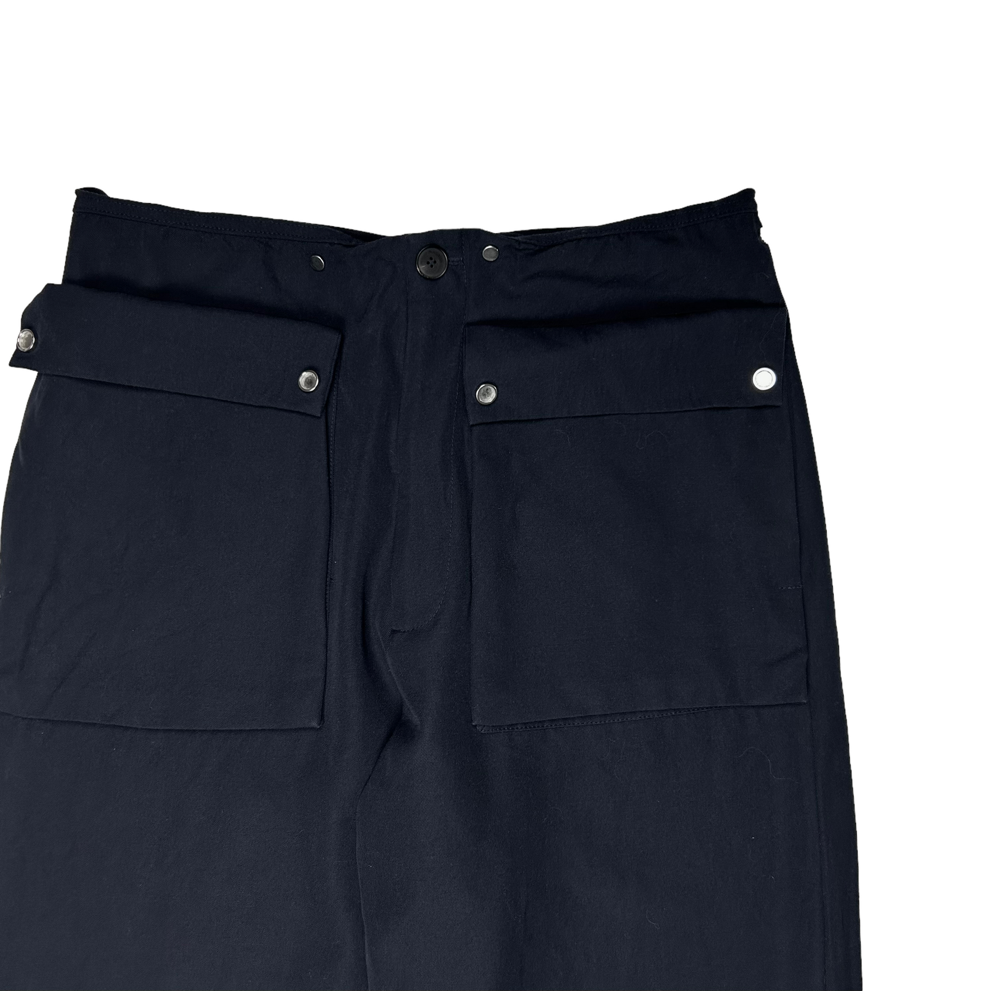 Dark navy virgin wool pants from JWA Spring Summer 2020 collection. 3D front pockets with Cobrax snap buttons which allow the flaps to be attached and detached to the waist in order to create different looks. High quality construction with a Riri zip at the fly. Straight cut. Retailed for around 700€.