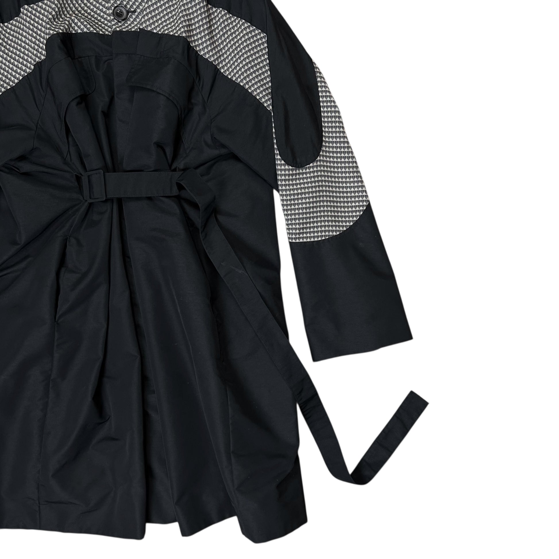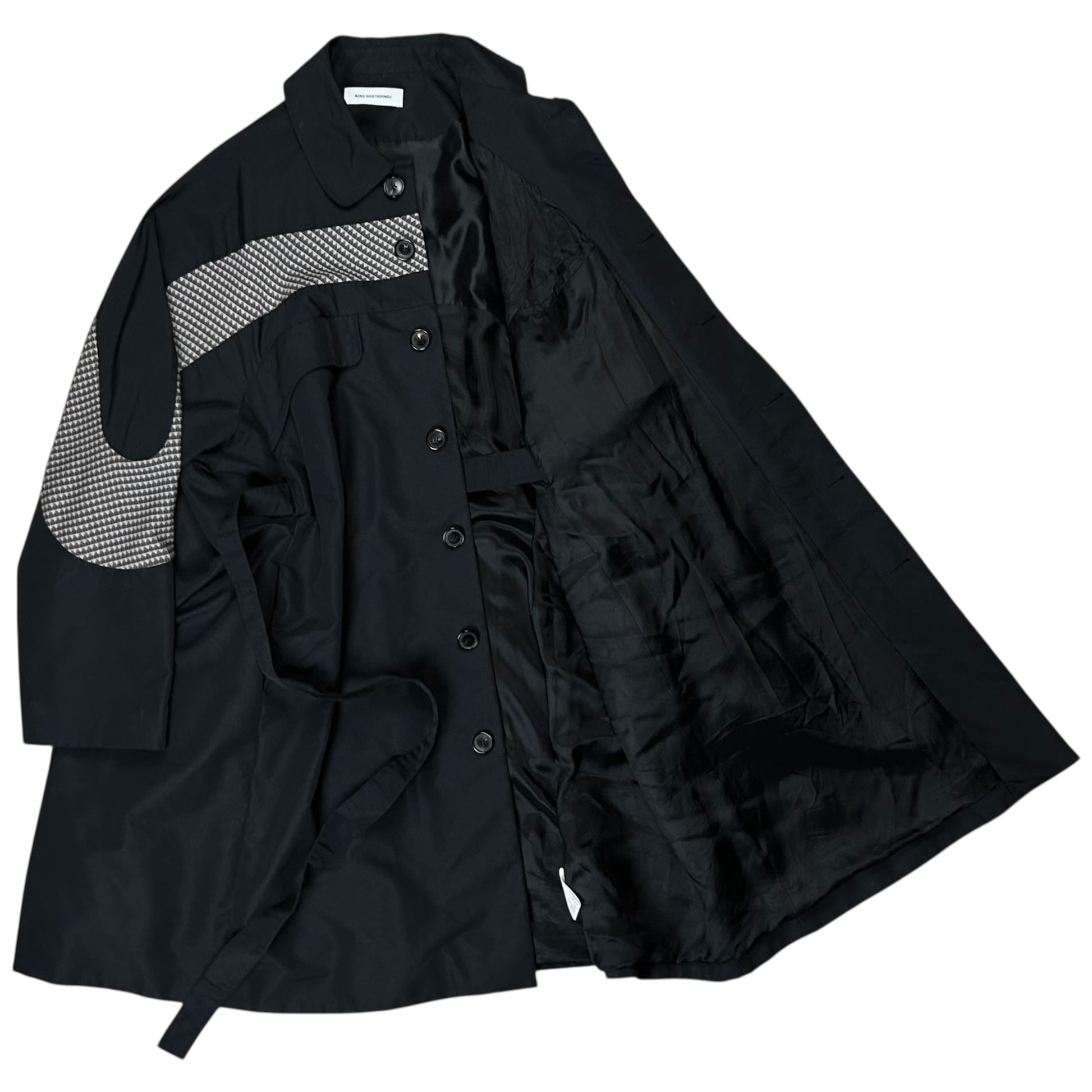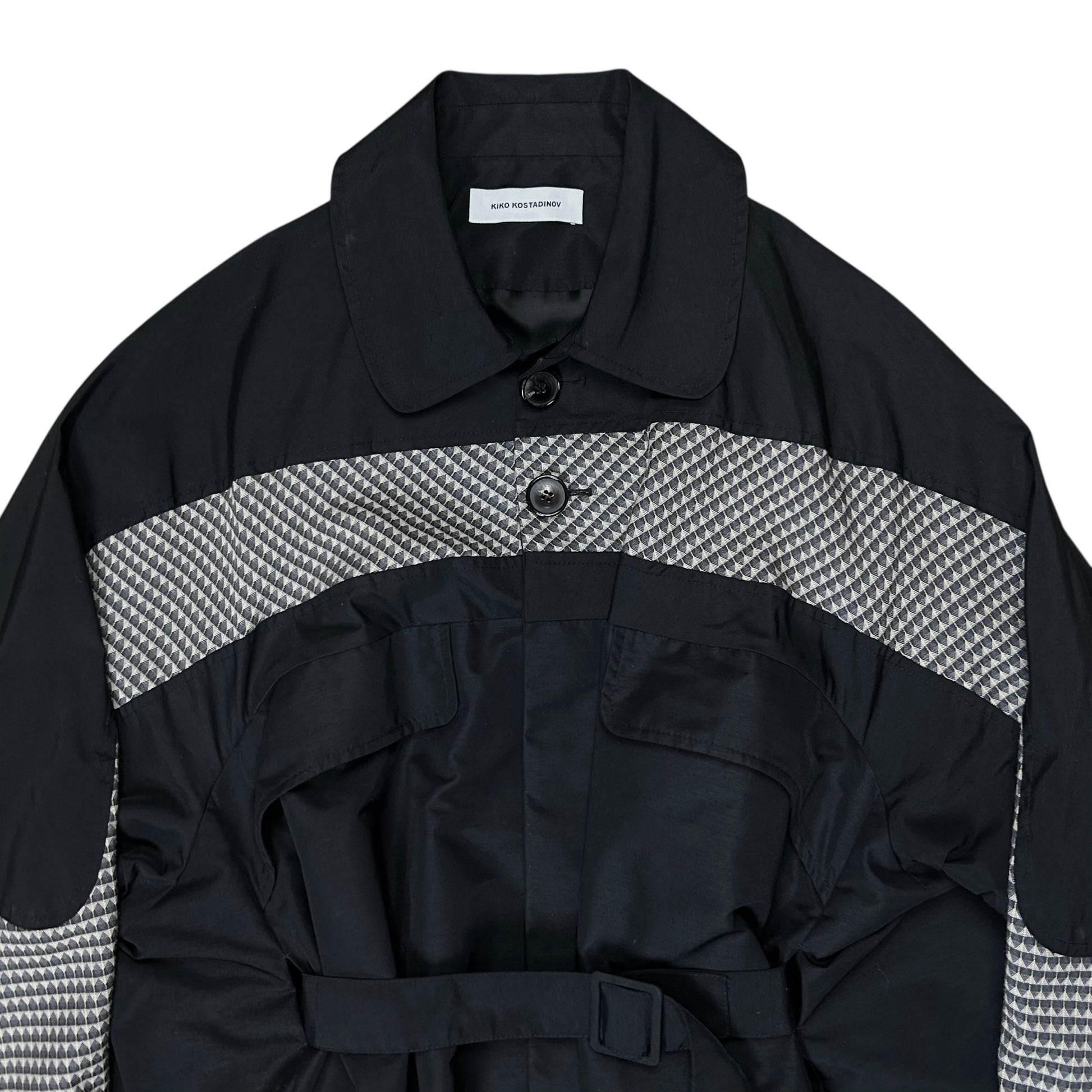 Rain coat from Kiko Kostadinov's Spring Summer 2020 collection called 0008 Tulcea. Implemented tonal belt with tonal buckle hardware allowing to cinch and adjust the silhouette. Contrasting checkered viscose blend panel along the chest, sleeves and back. Concealed button closure with a classic collar and flap pockets at the chest. Made from a black techncial polyester fabric. Oversized cut.