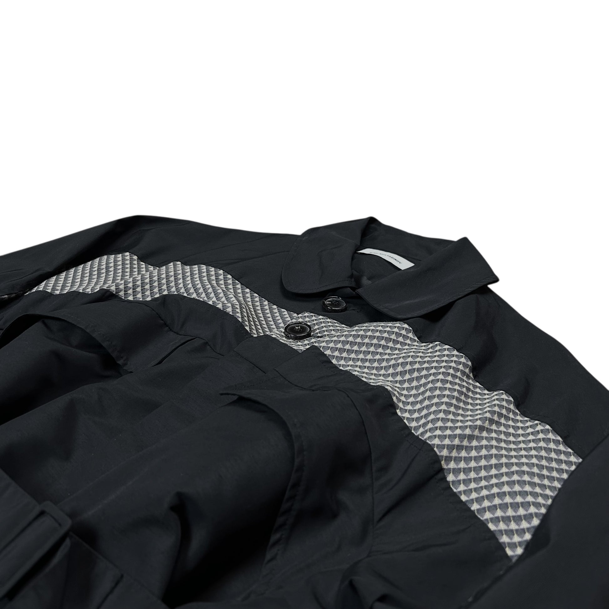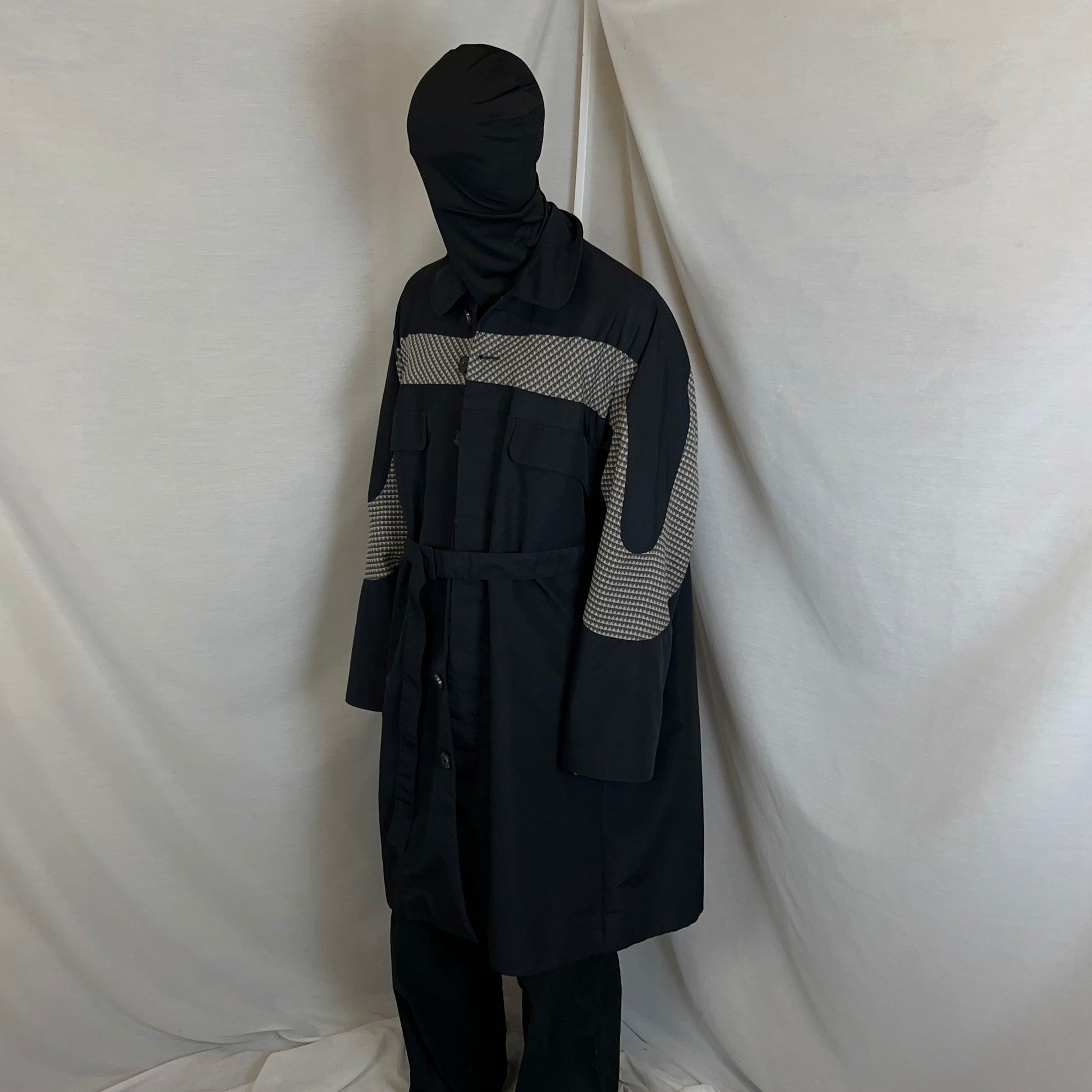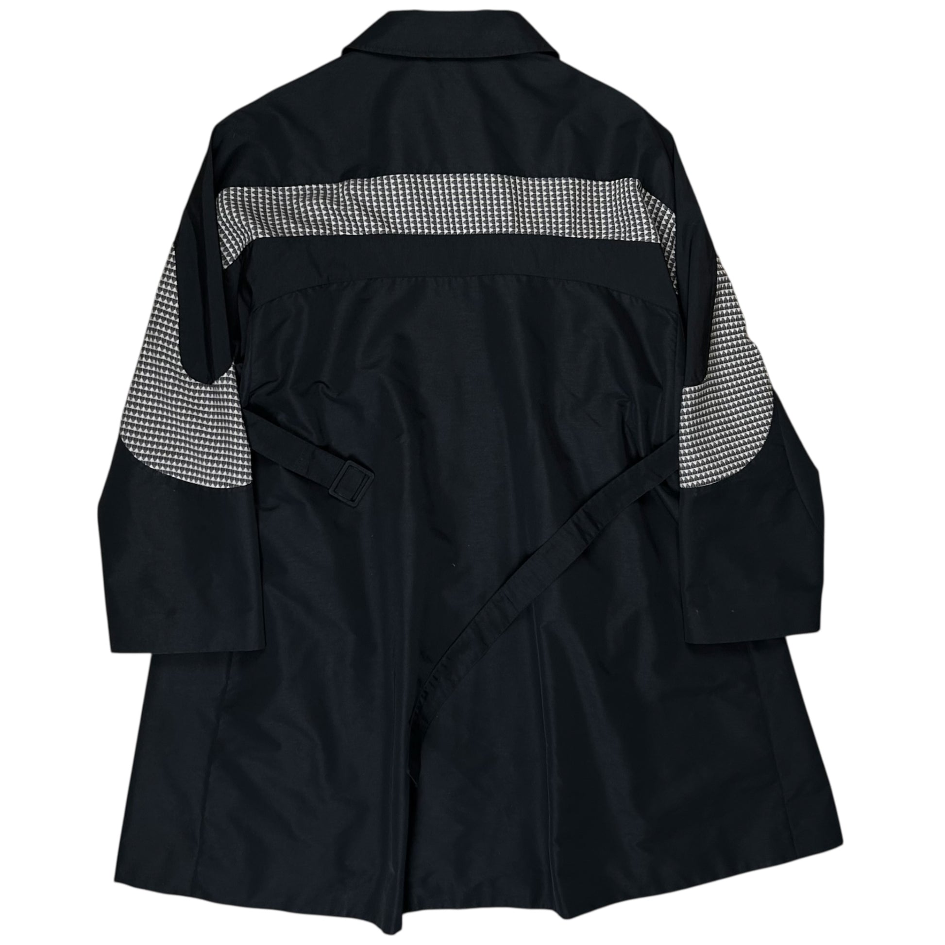 Rain coat from Kiko Kostadinov's Spring Summer 2020 collection called 0008 Tulcea. Implemented tonal belt with tonal buckle hardware allowing to cinch and adjust the silhouette. Contrasting checkered viscose blend panel along the chest, sleeves and back. Concealed button closure with a classic collar and flap pockets at the chest. Made from a black techncial polyester fabric. Oversized cut.