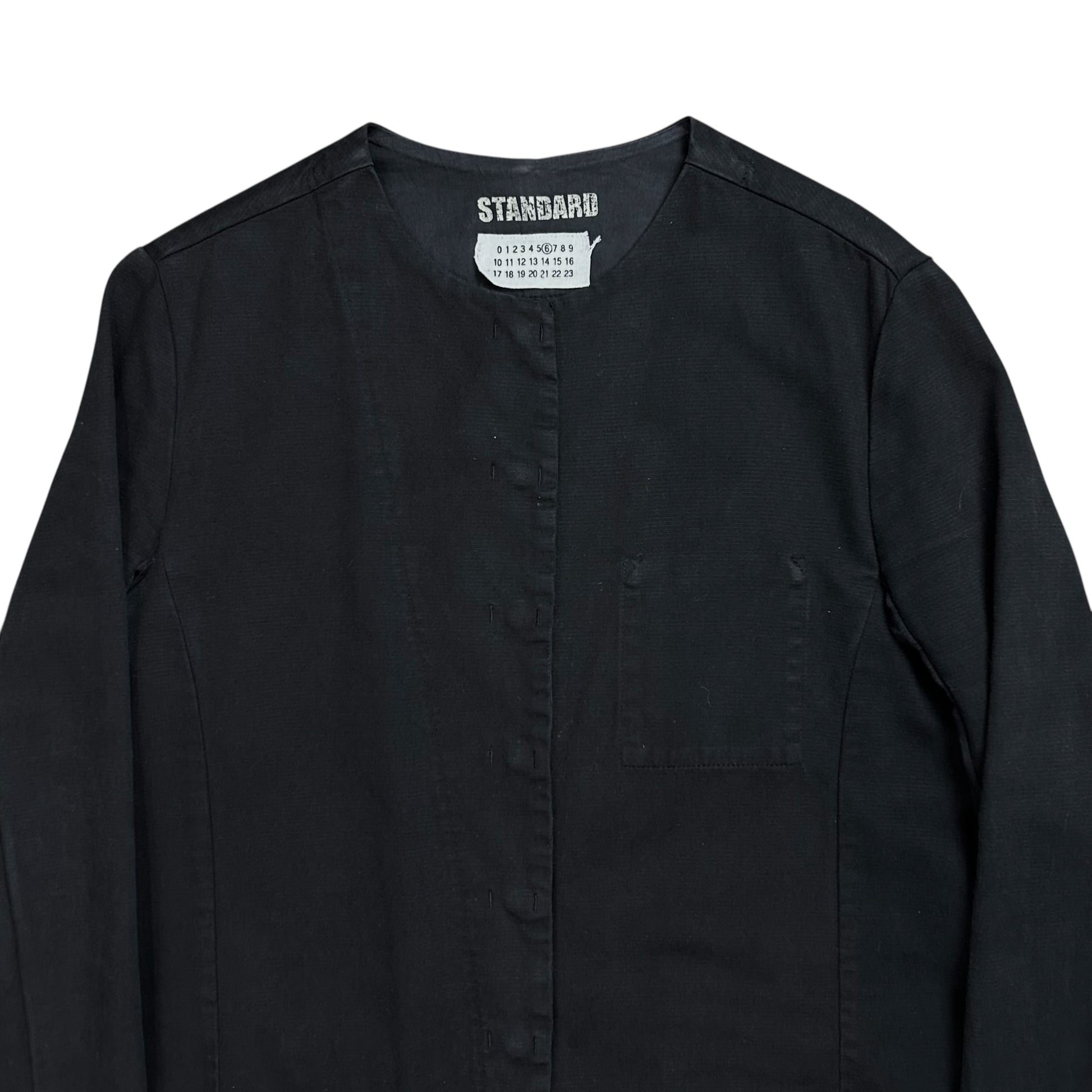 Lab coat from the Maison Martin Margiela Spring Summer 2003 collection of the line 6 back when Martin Margiela was still designing for the brand. Collarless construction with three work pockets and one mock pocket with stitching outlines. Concealed silver snap button closure. Tonal belt with silver ring hardware closure. Made from an endurable cotton material in black. Relaxed cut.