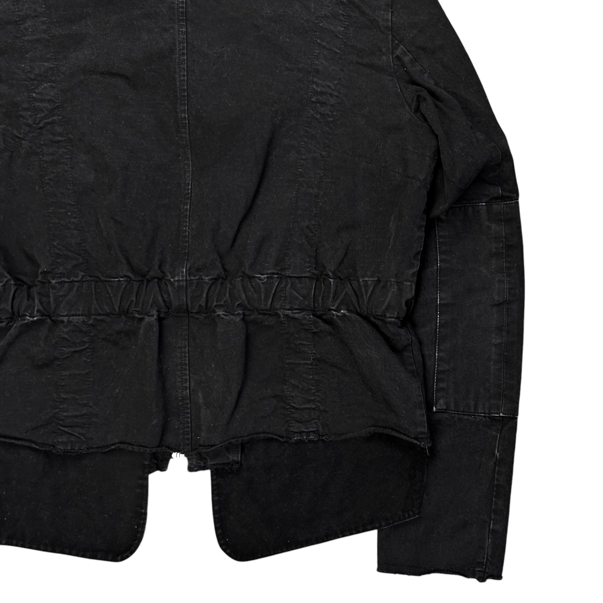 Work jacket from the Maison Martin Margiela Line 6 back when Martin was still designing for the brand. Deconstructed and raw hem line with with the pockets exceeding. Silver two zip at the front with further zippers at the four front pockets that have black canvas strings attached to the pullers. Made from a faded black cotton material that turned dark blue. Cropped cut.