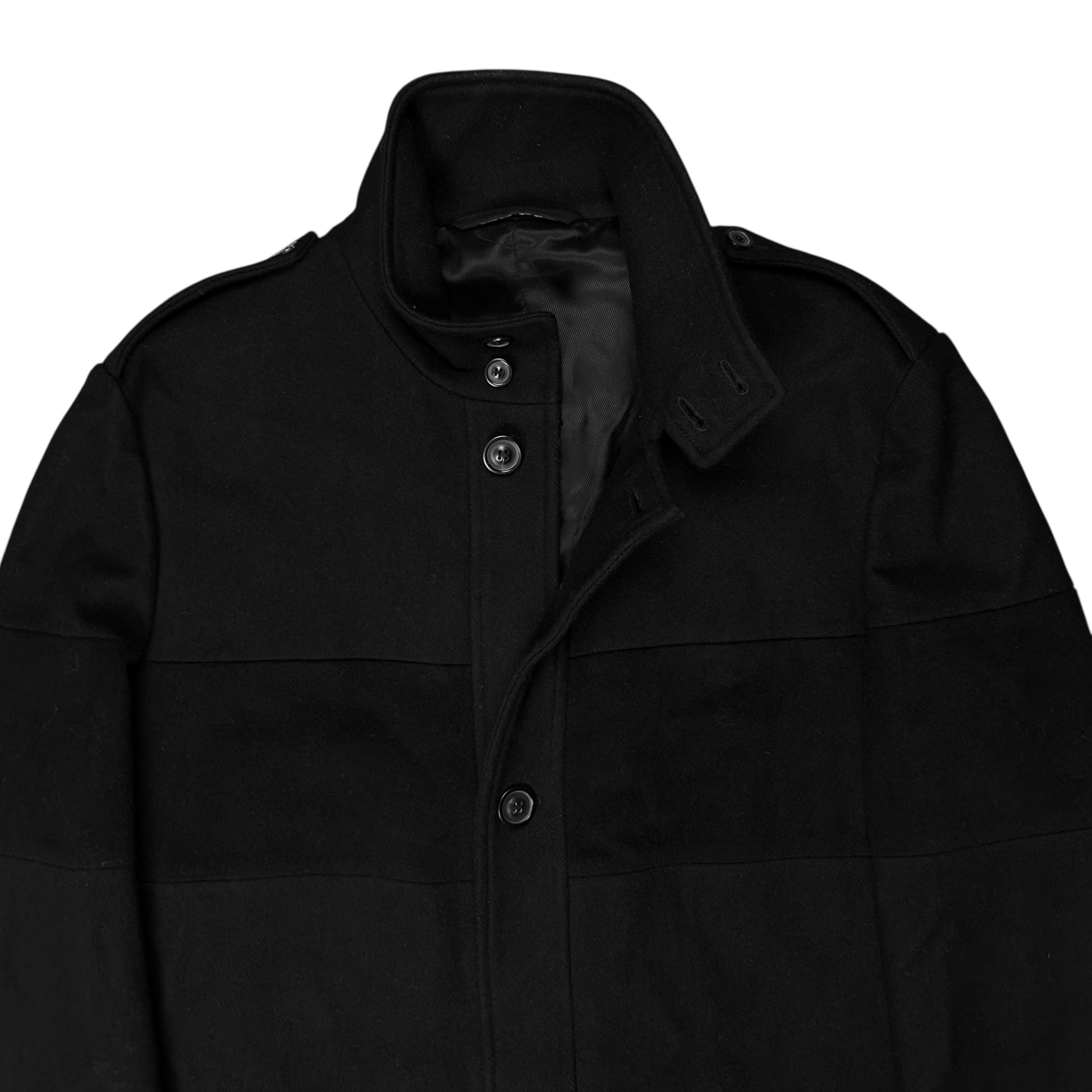 Heavy mid length field coat from the Maison Martin Margiela Fall Winter 2010 collection. Buttoned military inspired epaulettes at the shoulders. Tonal buttons at the front, the sleeve straps, the flap pockets and at the stand collar. Chest panel with a varying wool texture creating a tonal contrast. Made from a thick black wool and angora blend with a acetate and viscose blend lining. Regular structured cut.