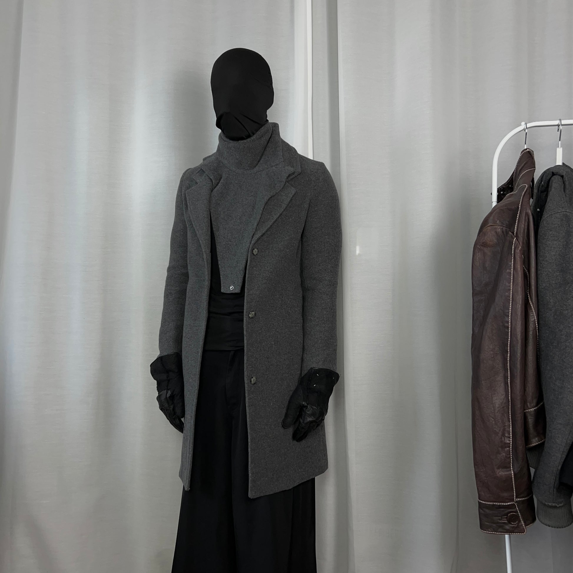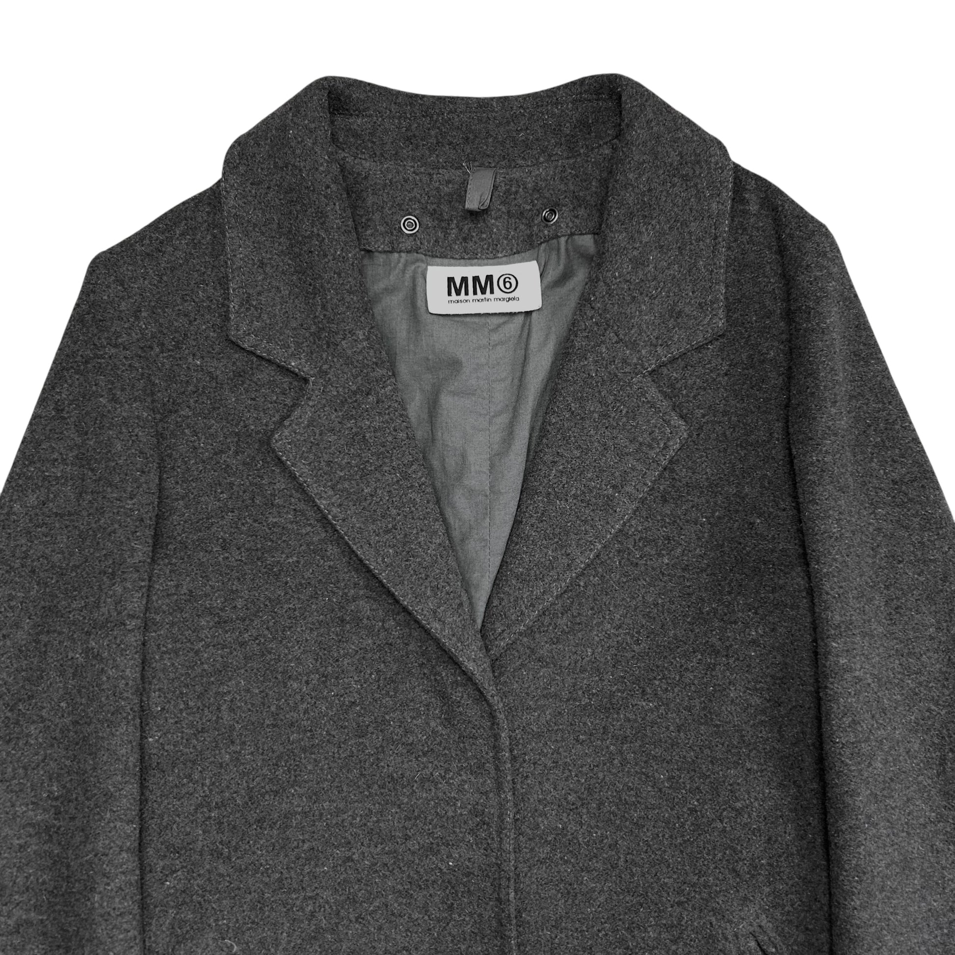 Over coat from the Fall Winter 2011 collection which was one of the first collections of the diffusion line MM6 back when the label still was called Maison Martin Margiela. Unique scarf-like collar which is attached with silver snap buttons which allow multiple styling options. Hidden button closure with slid pockets at the front. Made from a medium grey wool and cashmere blend with cotton padding and acetate lining. Tailored cut.
