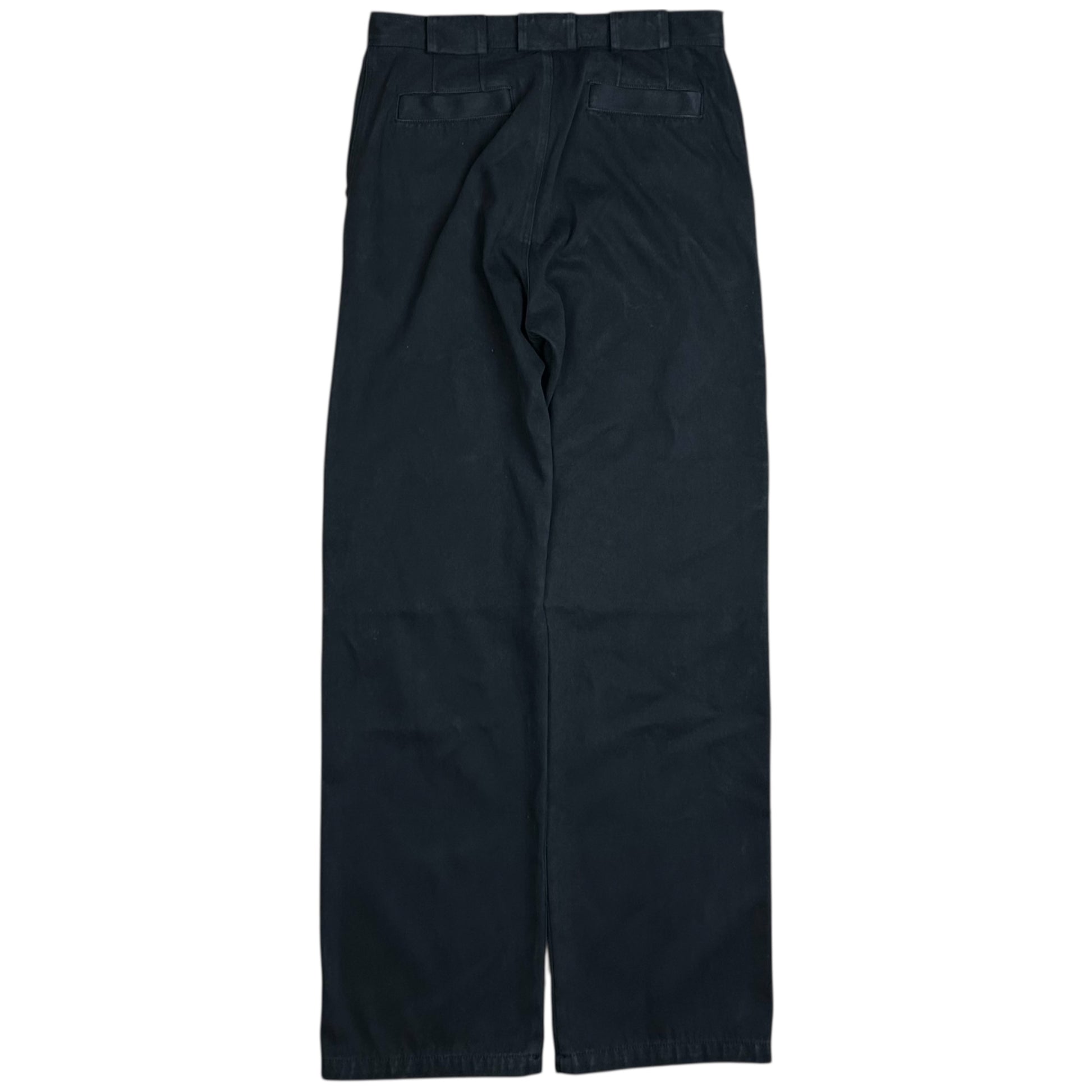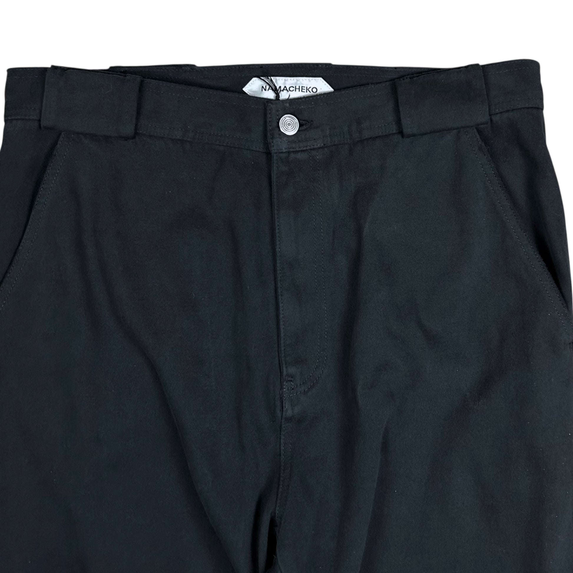 Jeans trousers from the Namacheko Fall Winter 2024 collection. Braided detailing at the knees in a tonal 3D manner. Dress pamts construction with slid pockets and thick reinforced belt loops. Zip fly with the signature silver button closure. Made from a thick unlined cotton material in a washed black. Straight cut. Retailed for around 650€.