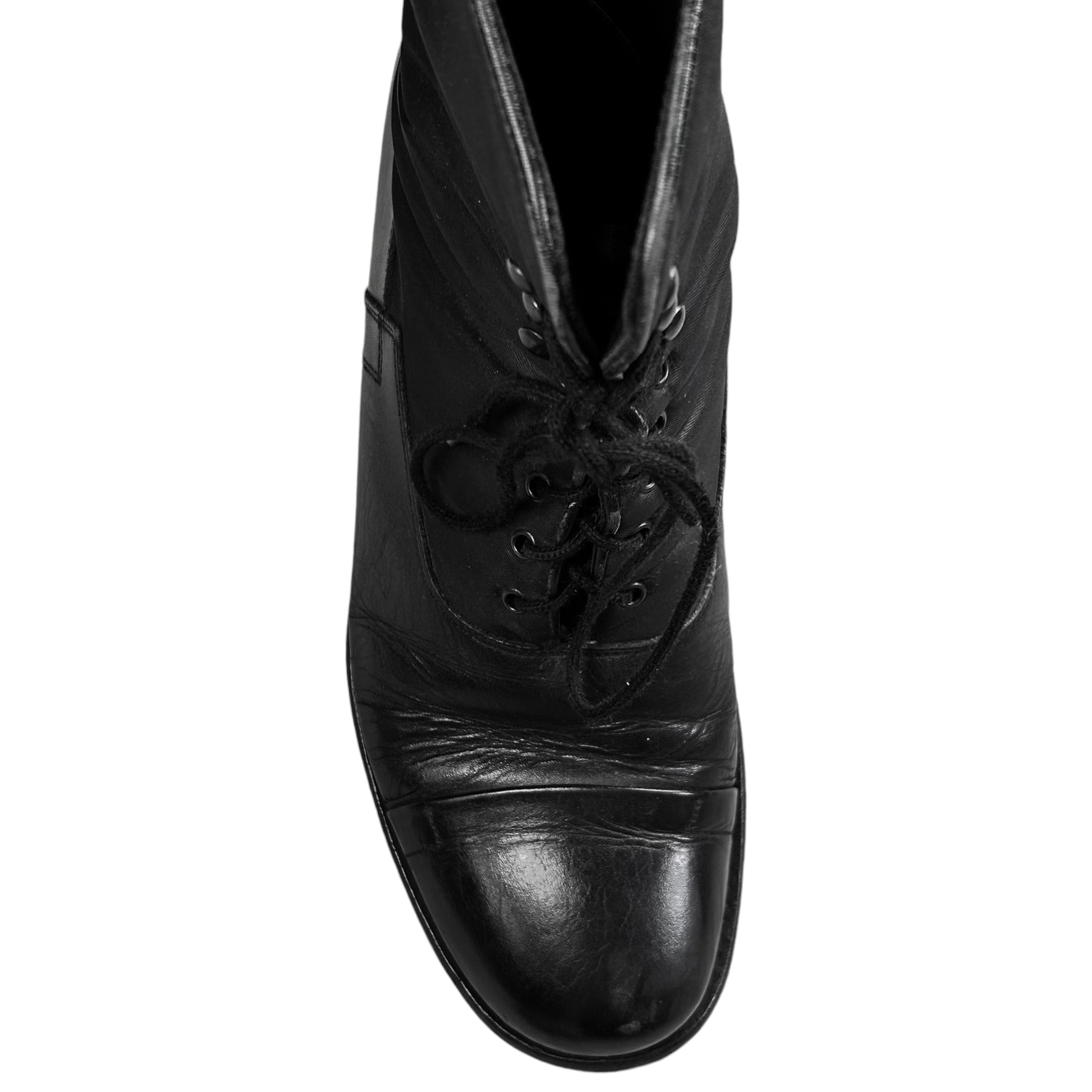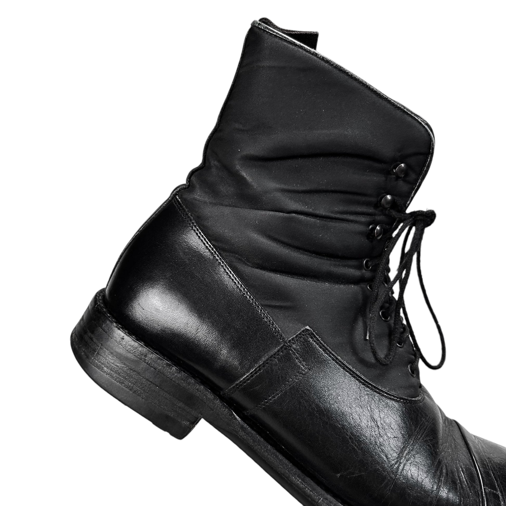 Black biker boots from Prada. Black lace system with oversized lacing allowing the laces to be tied around the shoe. Black hook detailing at the tongue. Black military rubber sole. Use of nylon at the shaft ans leather at geh rest of the shoe which gives an unique look. Rounded toe shape.
