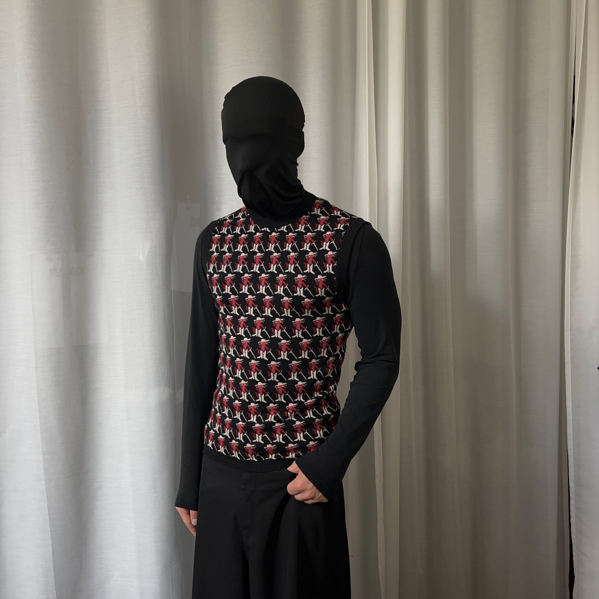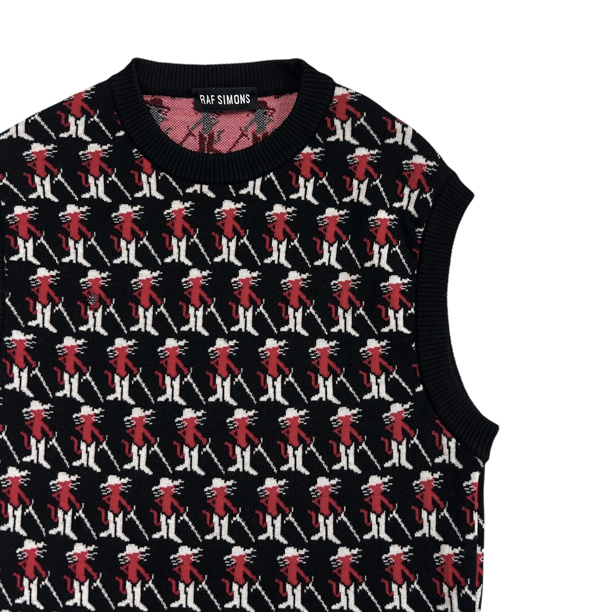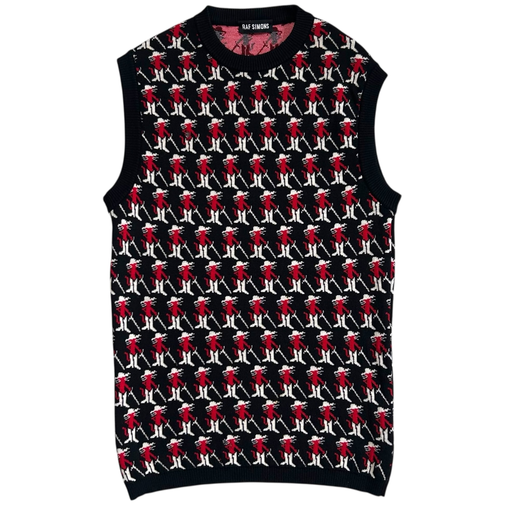Gillet top from the Raf Simons Fall Winter 2013 collection. Intarsia all over graphic depicting Puss in Boots with the use of red and white on top of a contrasting black. Ribbing at the crewneck collar, the sleeveless shoulders and the waistband. Made from a rigid cotton weave fabric. Short and fitted cut.