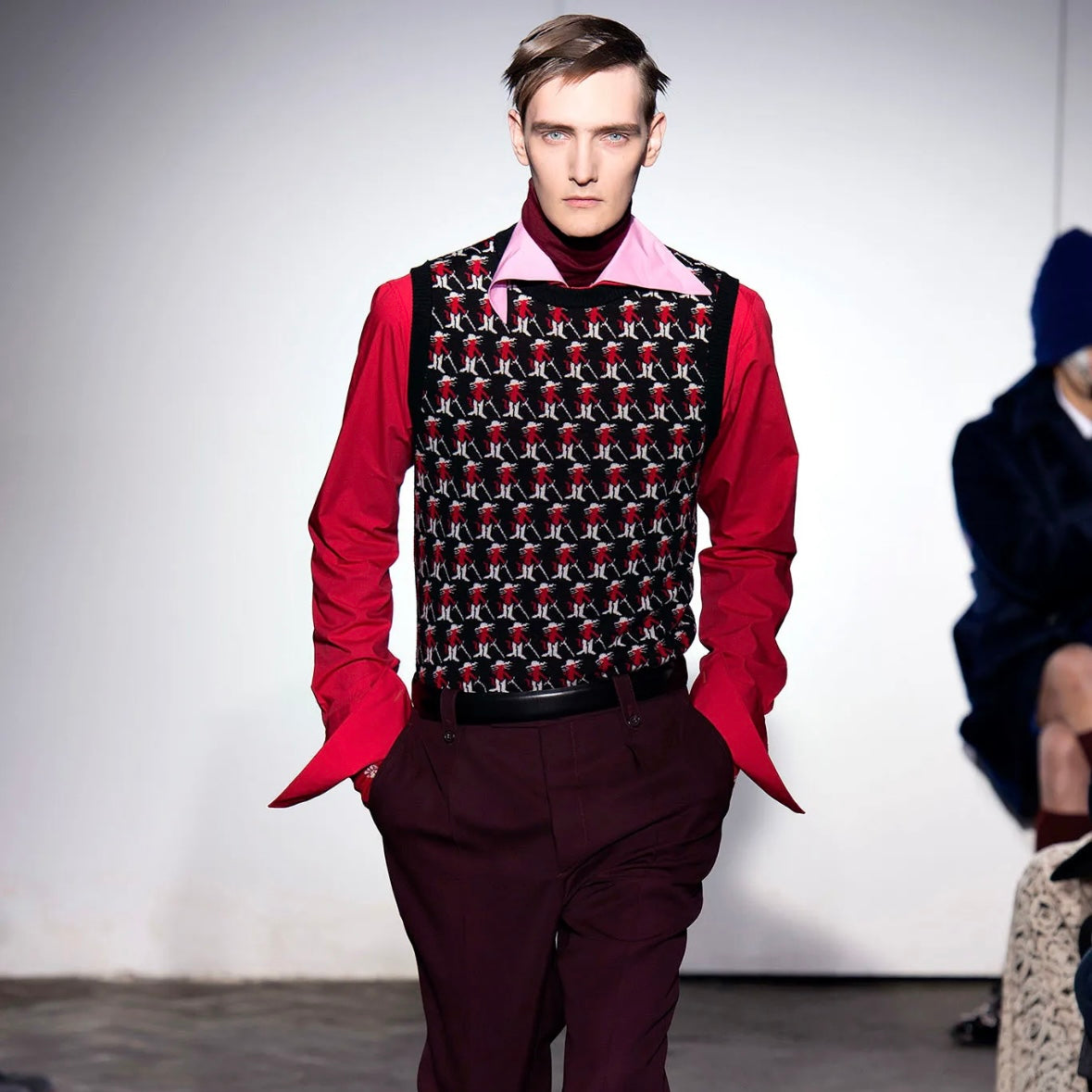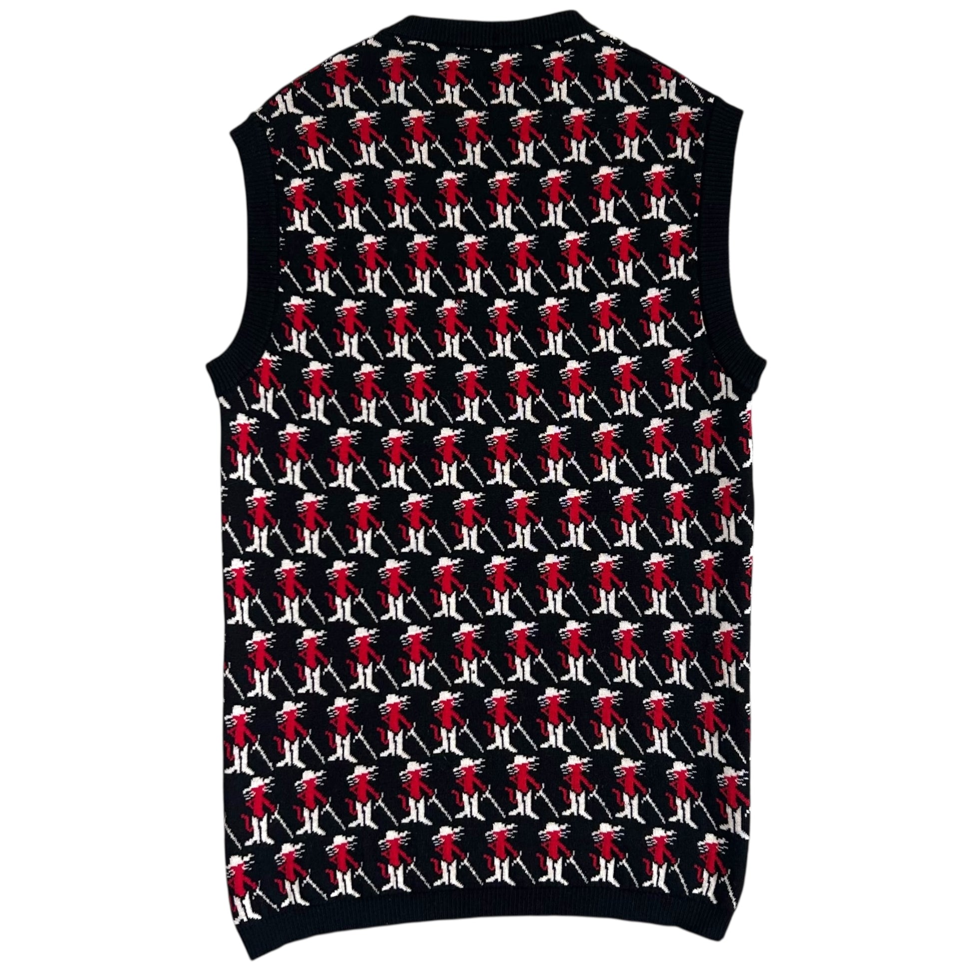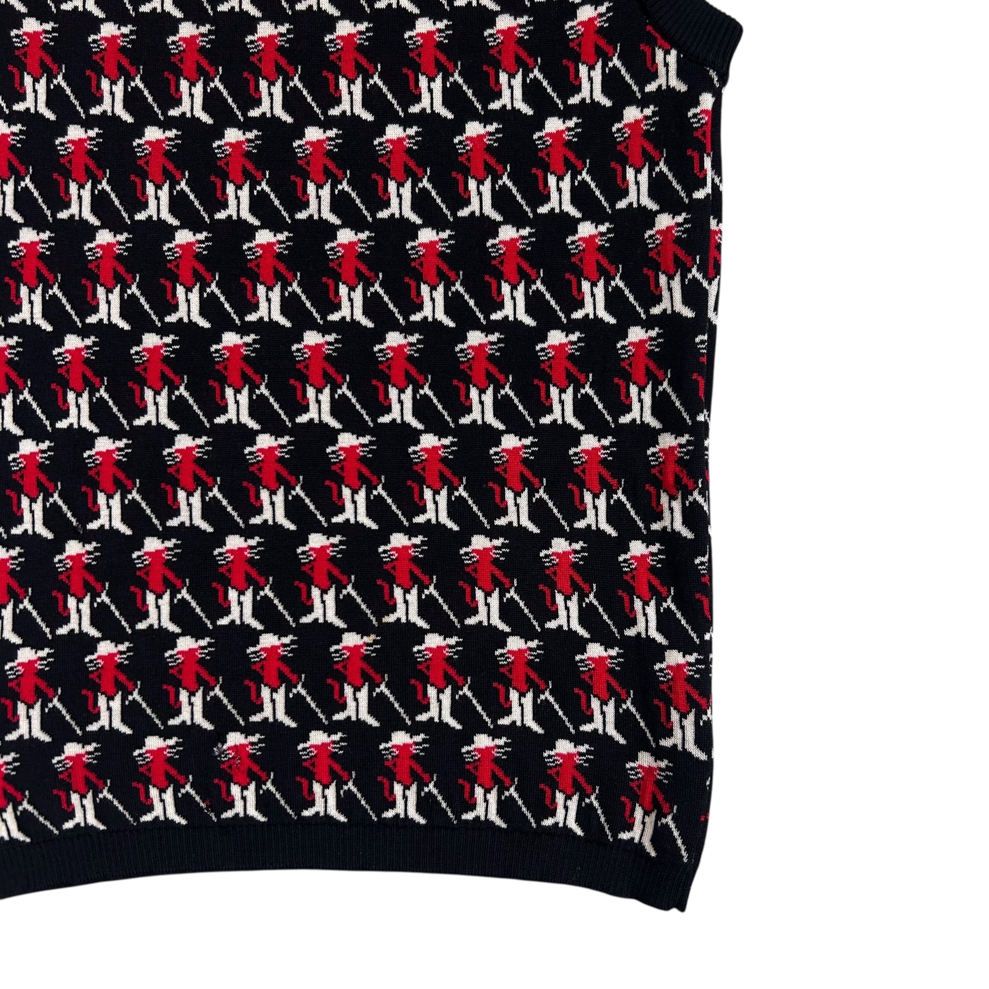 Gillet top from the Raf Simons Fall Winter 2013 collection. Intarsia all over graphic depicting Puss in Boots with the use of red and white on top of a contrasting black. Ribbing at the crewneck collar, the sleeveless shoulders and the waistband. Made from a rigid cotton weave fabric. Short and fitted cut.
