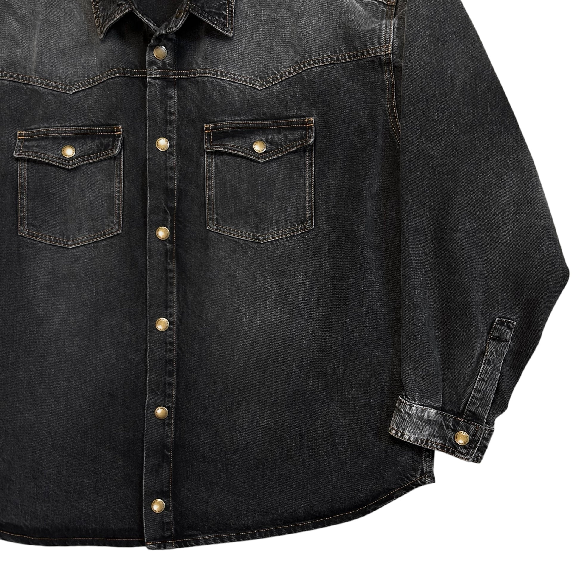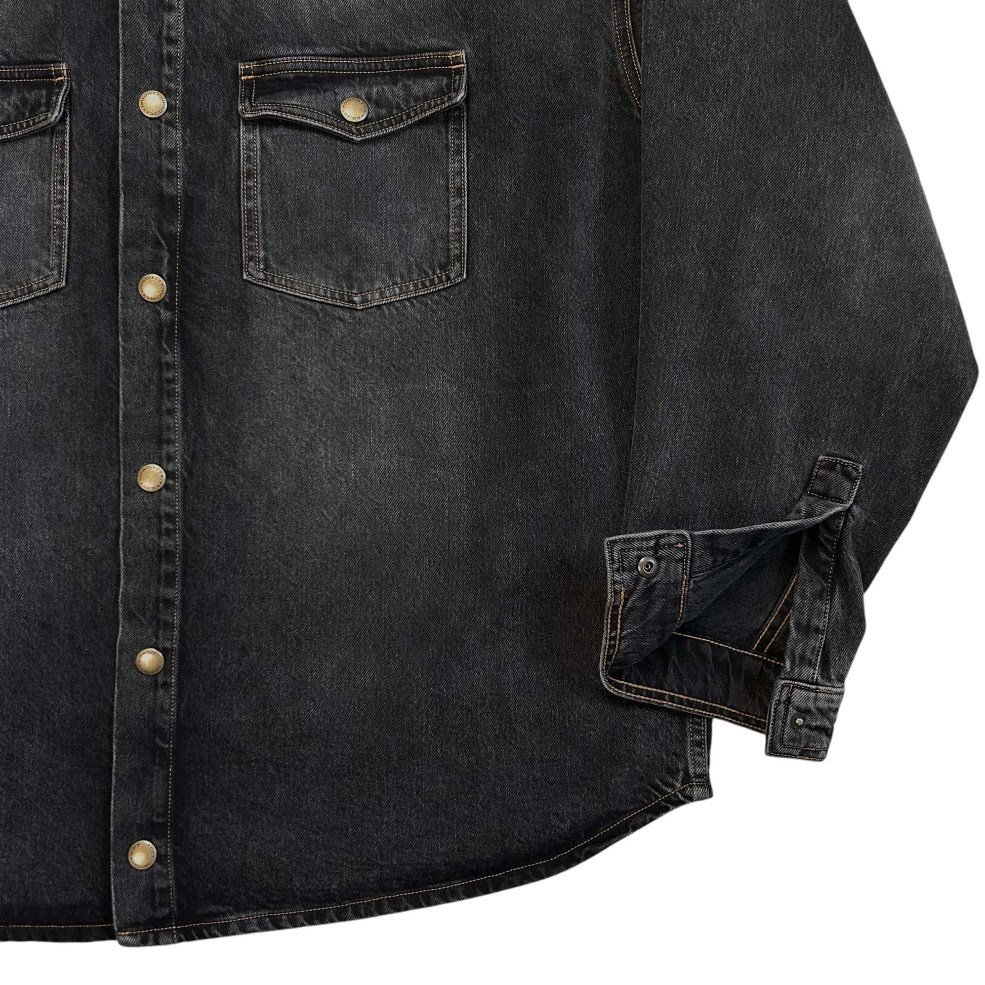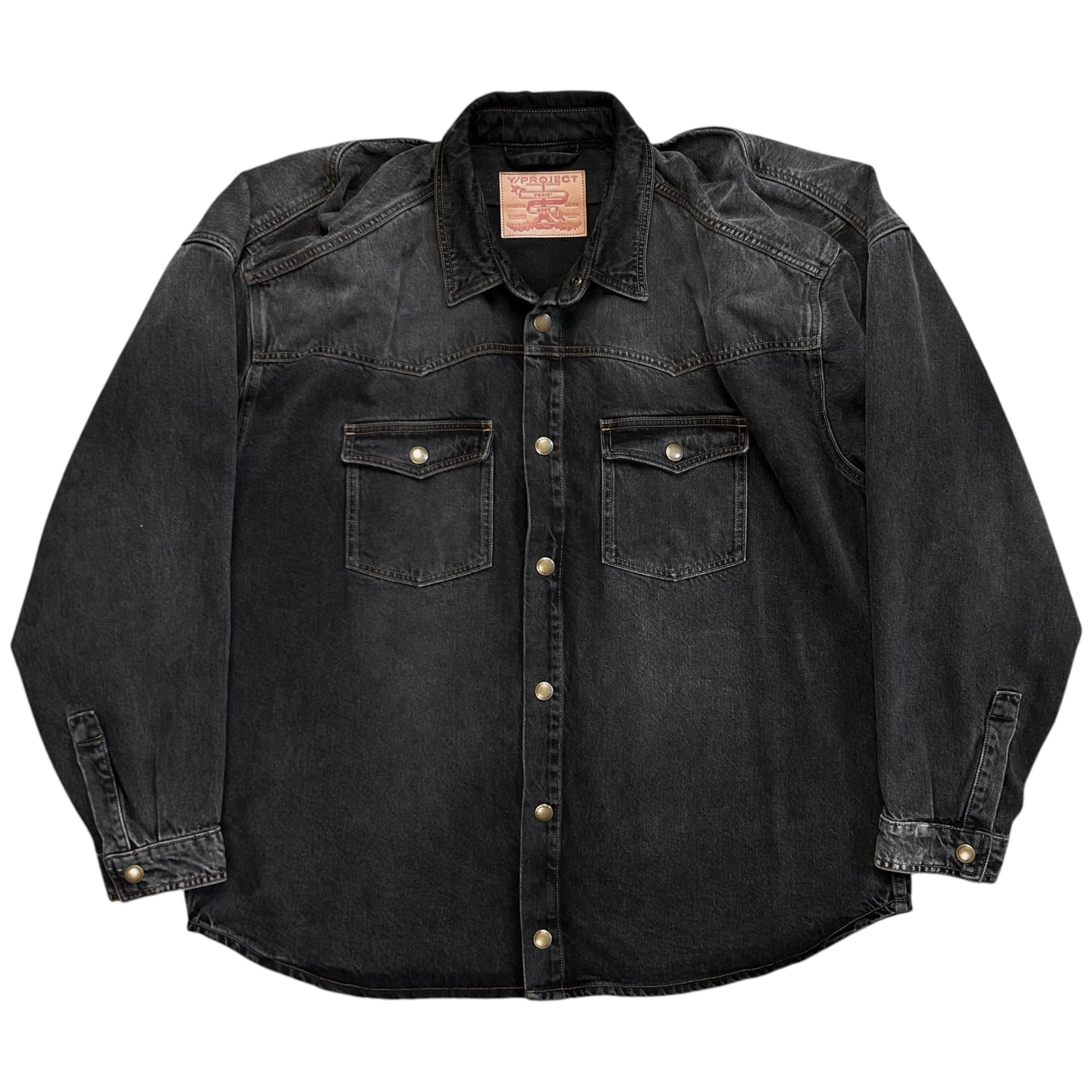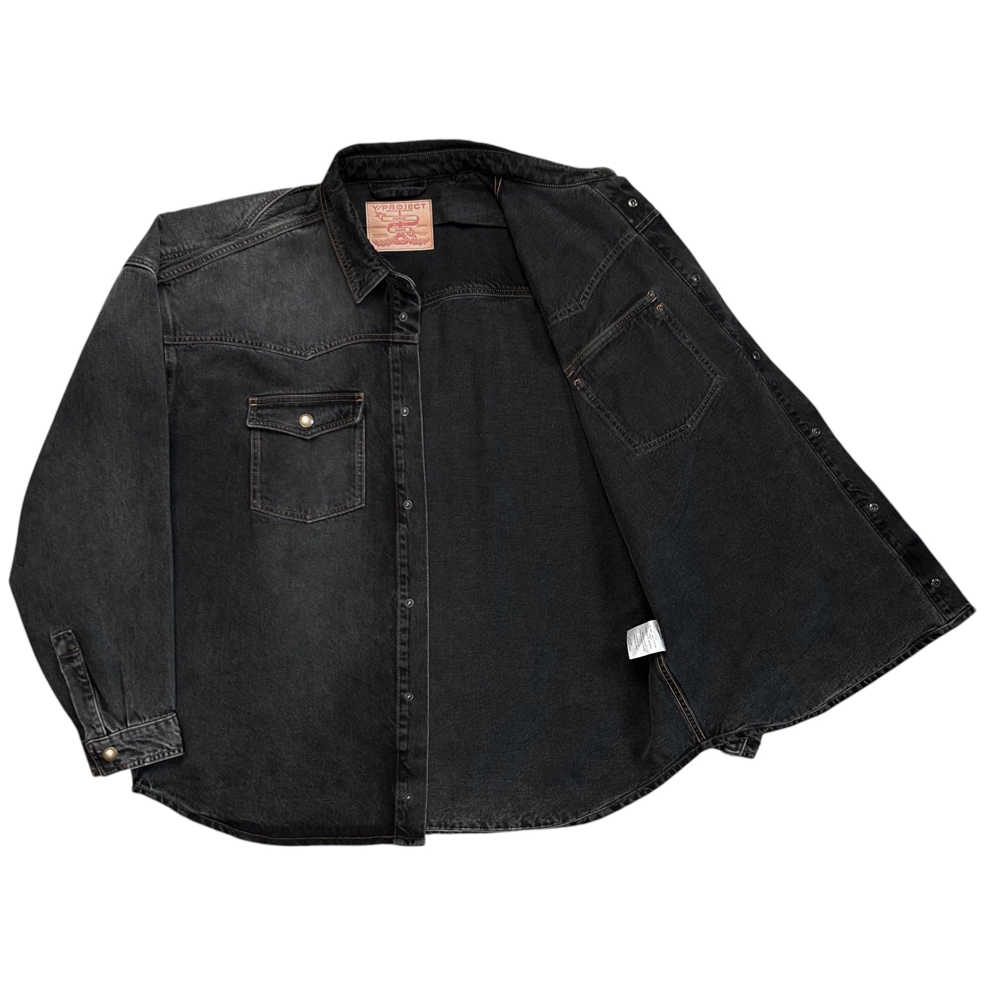 Over shirt from the Y/Project Fall Winter 2017 collection. Signature back construction with an excess fabric pattern that's bulking at the shoulder and creates a distorted double layer that can be styled in different ways. Snap button closure at the front, chest flap pockets and the sleeve cuffs. Made from a washed dark grey cotton jeans material. Oversized and slouchy cut.