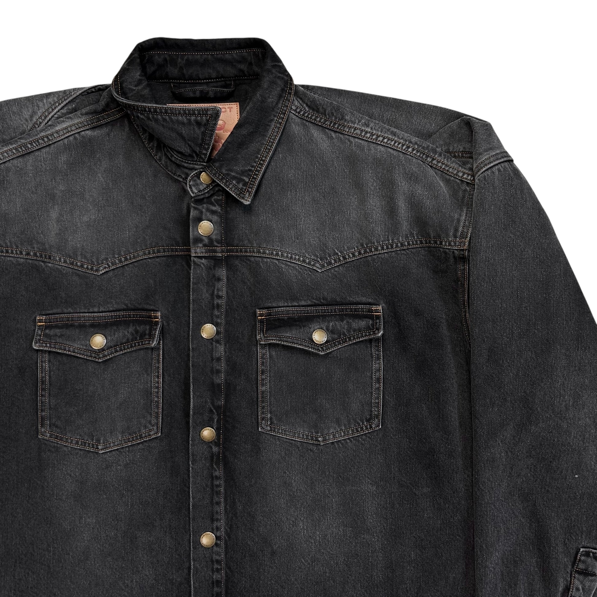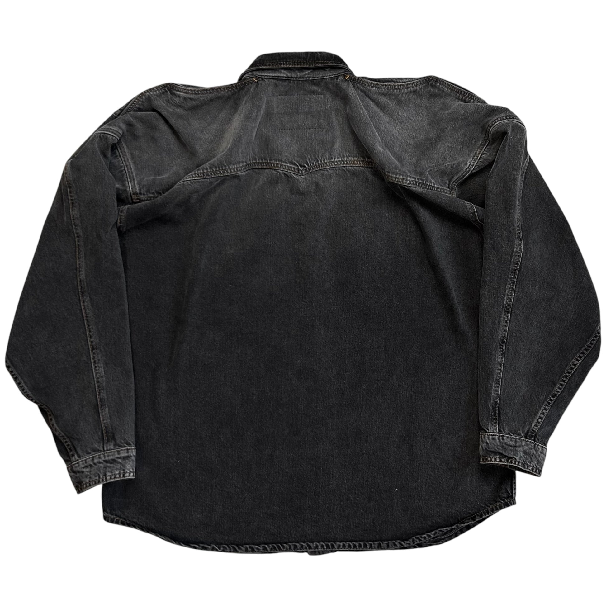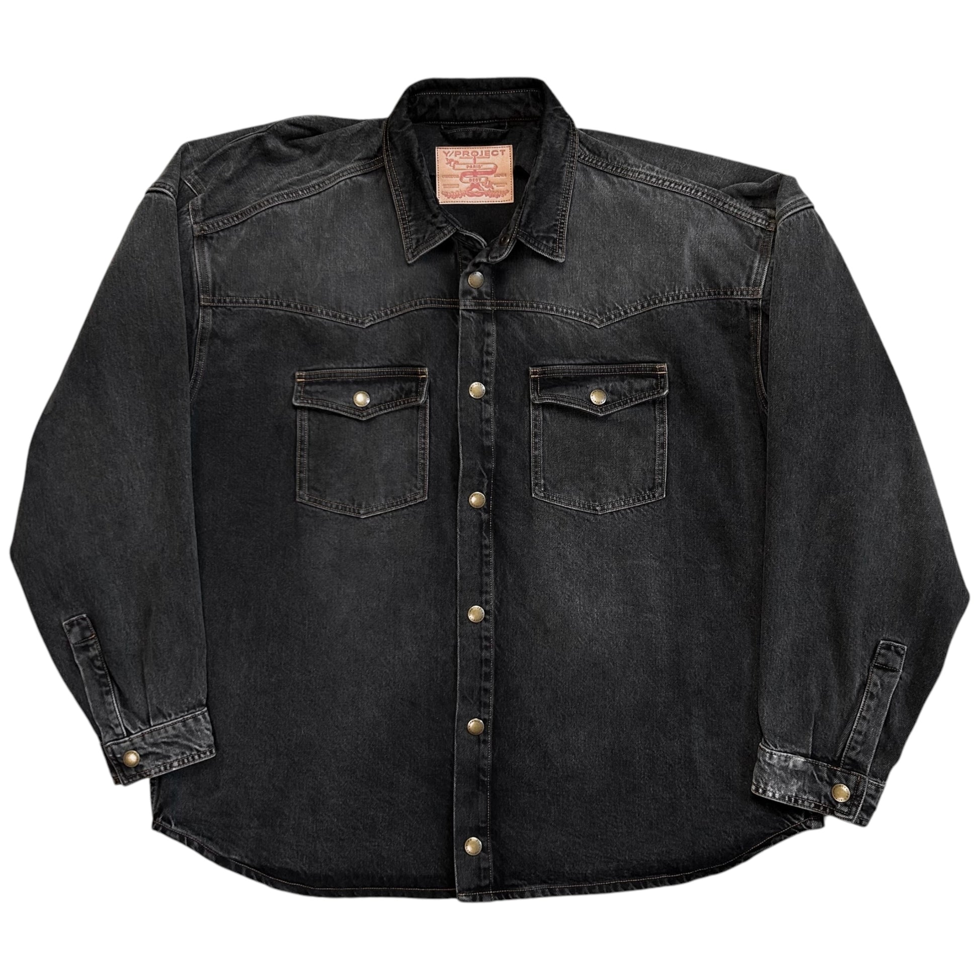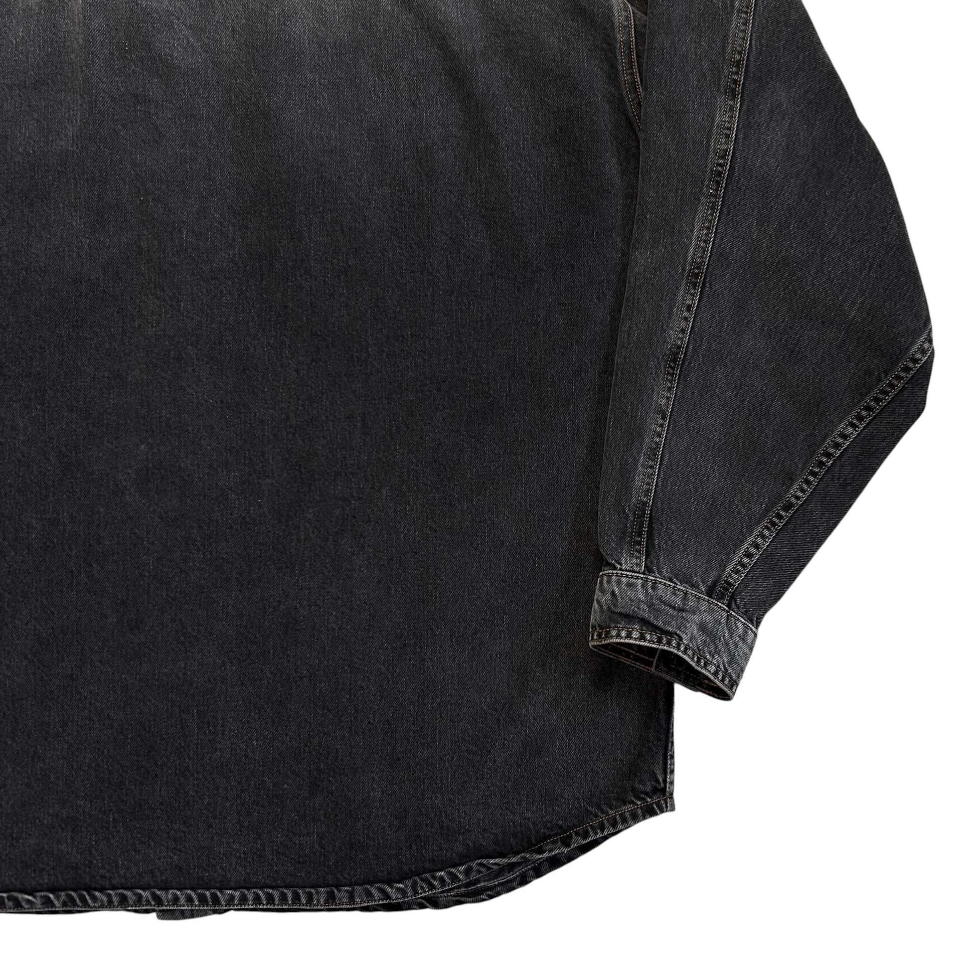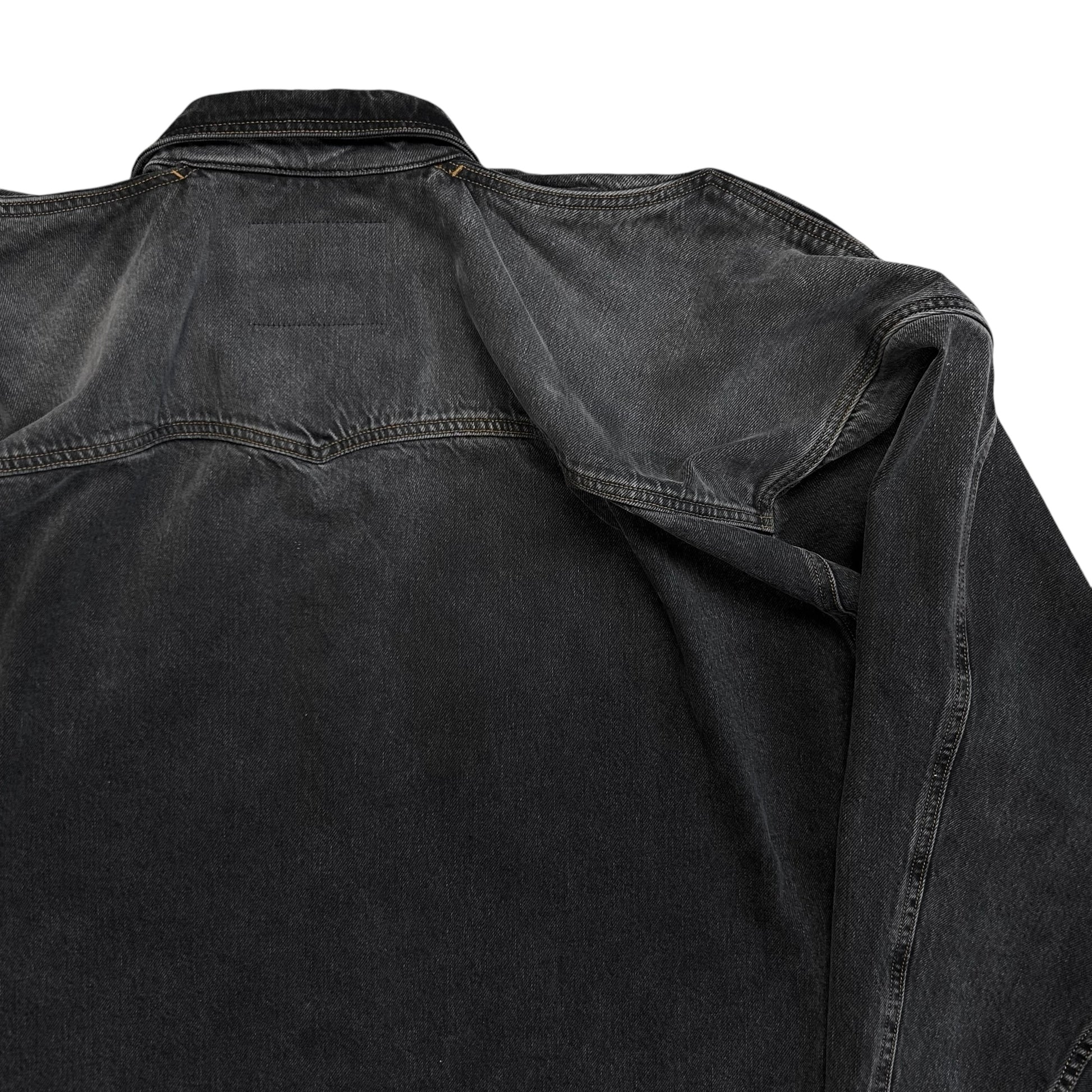Over shirt from the Y/Project Fall Winter 2017 collection. Signature back construction with an excess fabric pattern that's bulking at the shoulder and creates a distorted double layer that can be styled in different ways. Snap button closure at the front, chest flap pockets and the sleeve cuffs. Made from a washed dark grey cotton jeans material. Oversized and slouchy cut.
