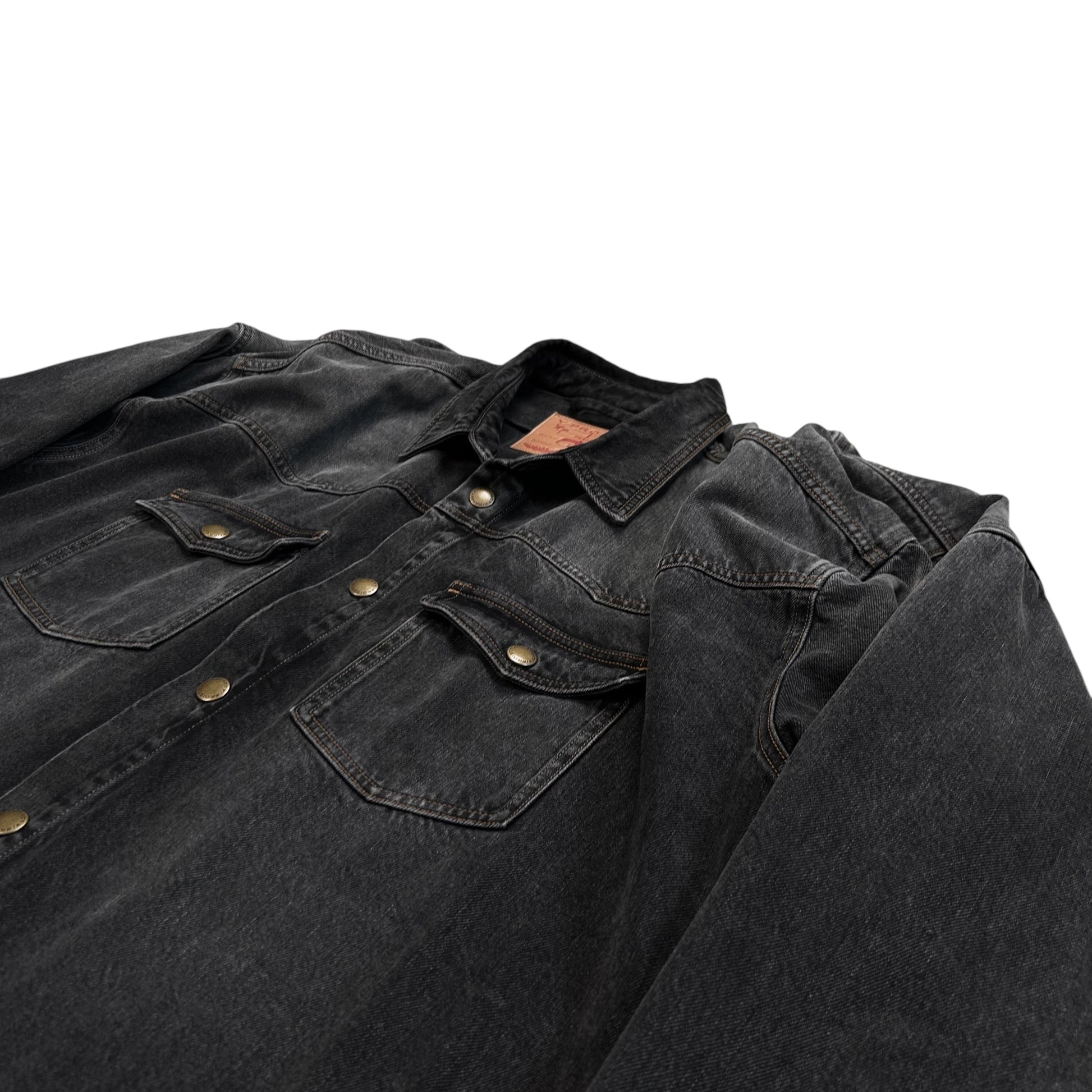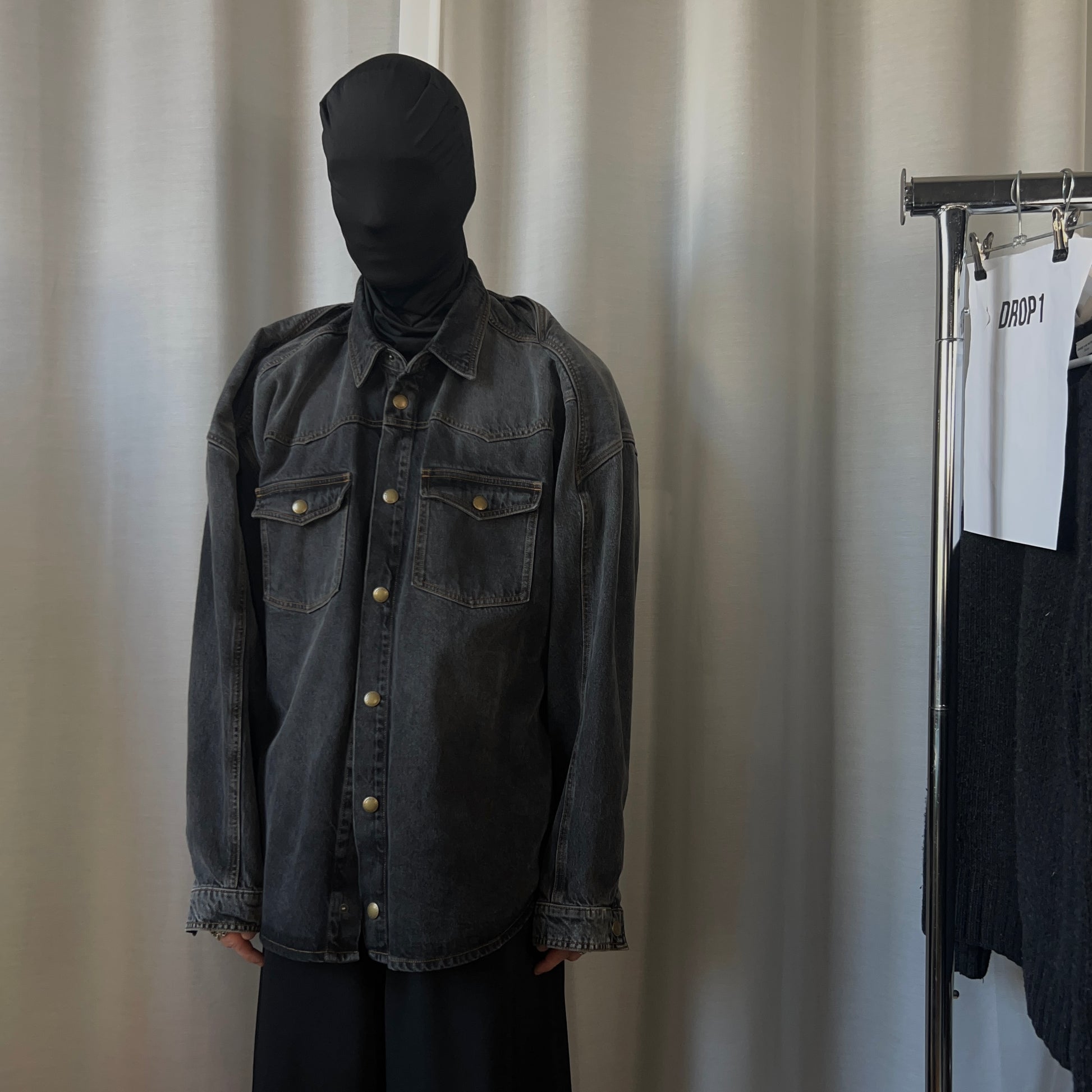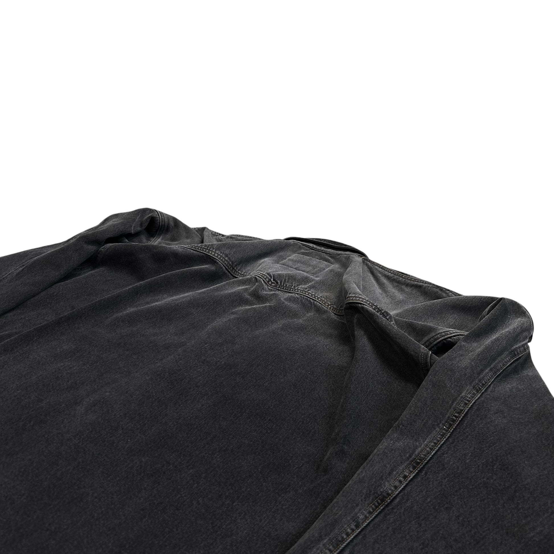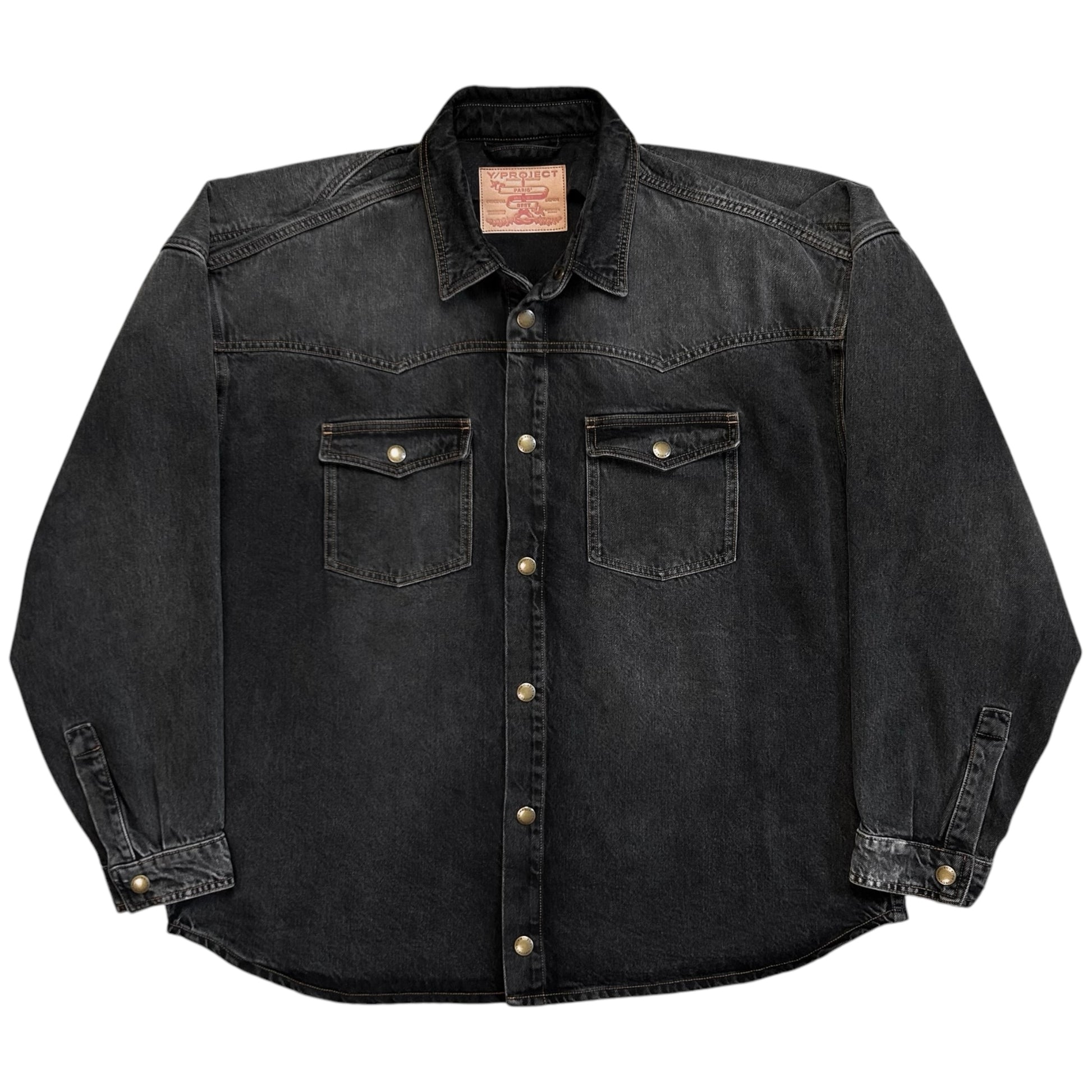 Over shirt from the Y/Project Fall Winter 2017 collection. Signature back construction with an excess fabric pattern that's bulking at the shoulder and creates a distorted double layer that can be styled in different ways. Snap button closure at the front, chest flap pockets and the sleeve cuffs. Made from a washed dark grey cotton jeans material. Oversized and slouchy cut.